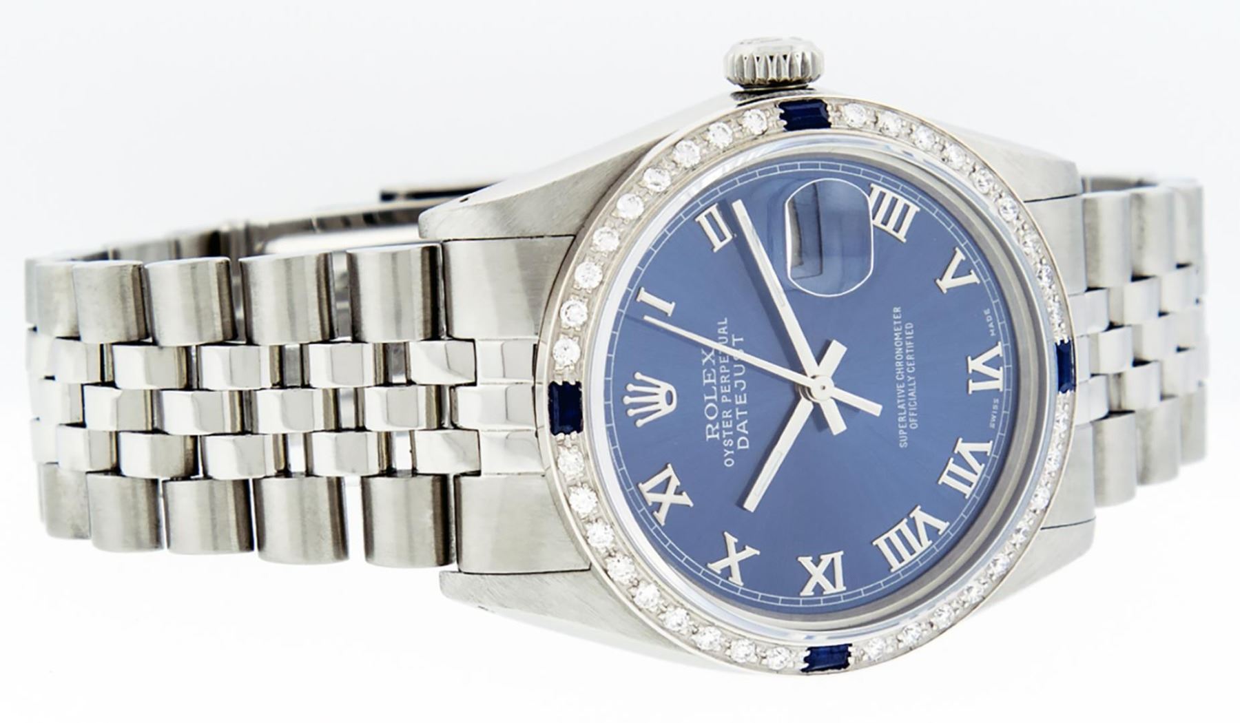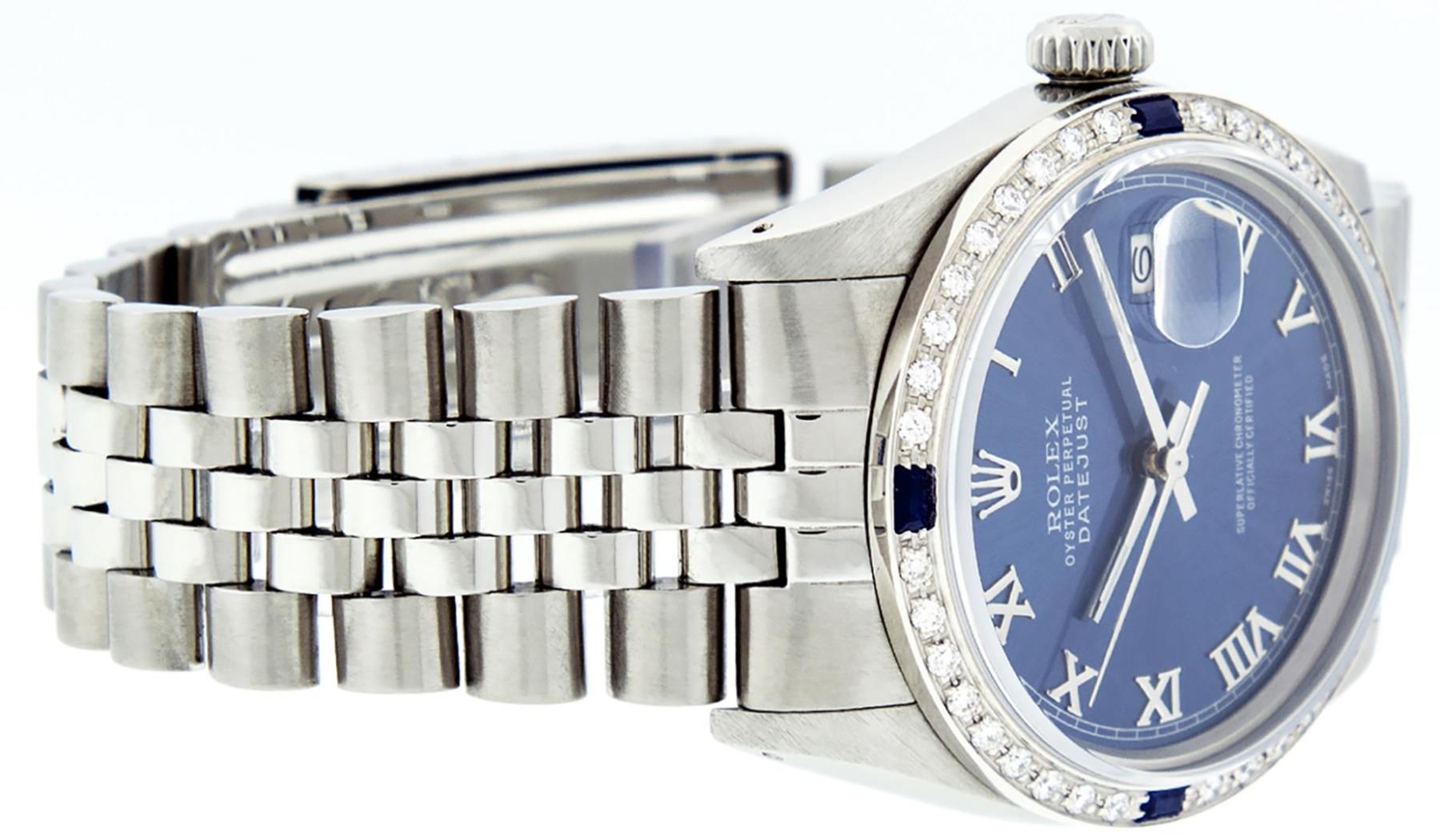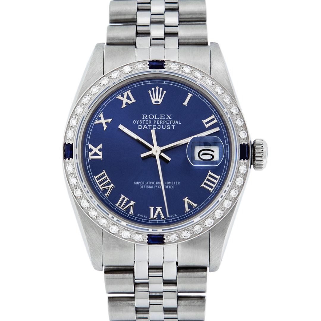 One Mens Stainless Steel Rolex Datejust Polished Bright with Satin Finish, This Watch Has Been Serviced & Electronically Tested, Stainless Steel Case: 36mm, Stainless Steel Crown, Custom Bezel: New 18K White Gold Sapphire Beadset Diamond Bezel, Diamond + Gem Count: 36 Diamonds + 4 Sapphires. Custom Crystal: New Sapphire With Magnified Date Window. Custom Hands: New Luminescent Hands. Rolex Movement: Automatic Winding Movement 3035. Custom Dial: Blue Roman With Square Track. Date Window: 3 O'Clock Position Date Display, Quickset, Model: Quickset Datejust, Condition: G-6 Extra Fine. Bracelet: Stainless Steel Jubilee Band. Bracelet: 7.0 Inch Length, Adjustable. Standard Clasp, With Rolex Logo. This Watch Has Been Serviced Time Tested And Is In Excellent Condition It Is Free Of All Scratches And Dents.