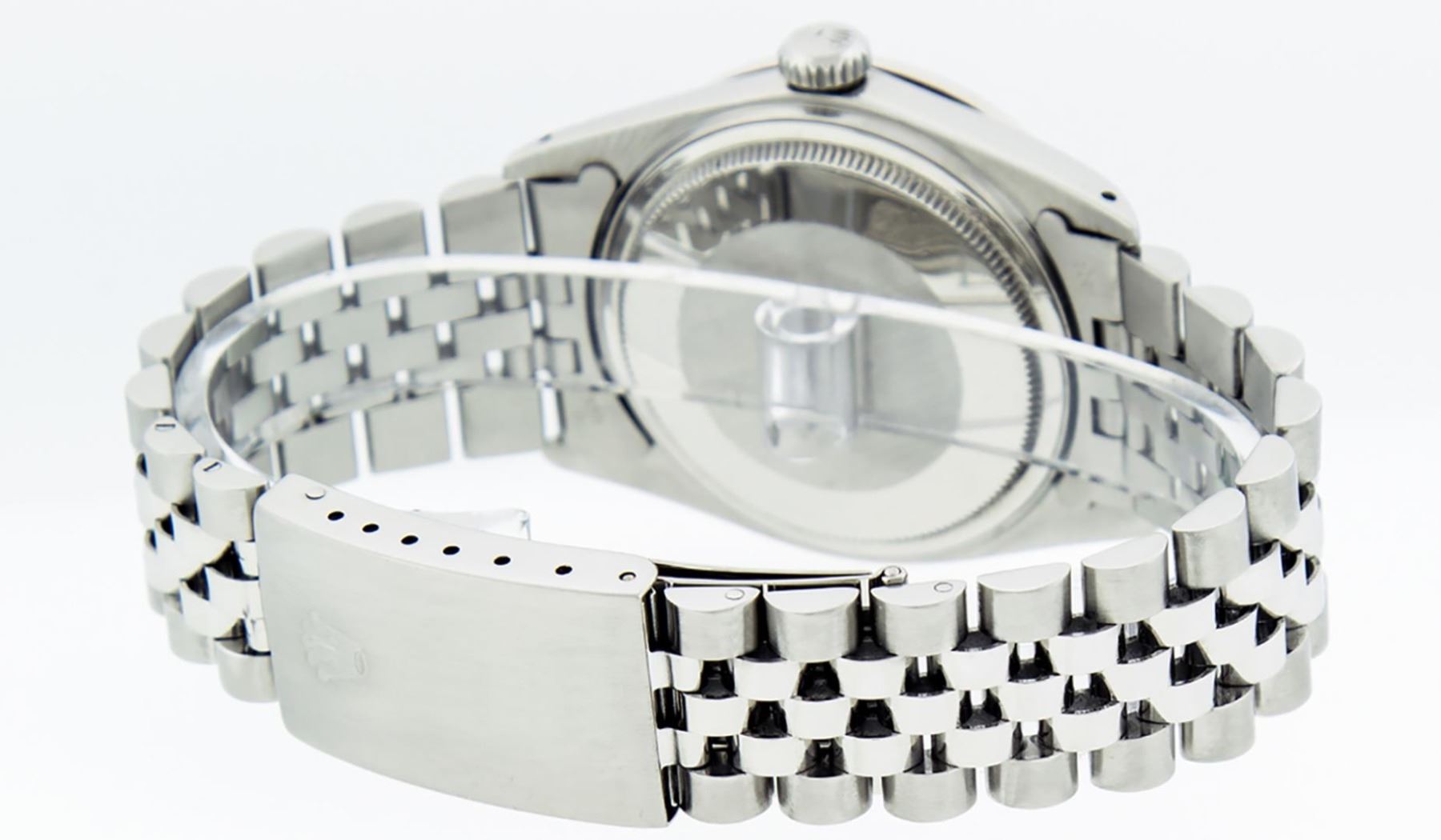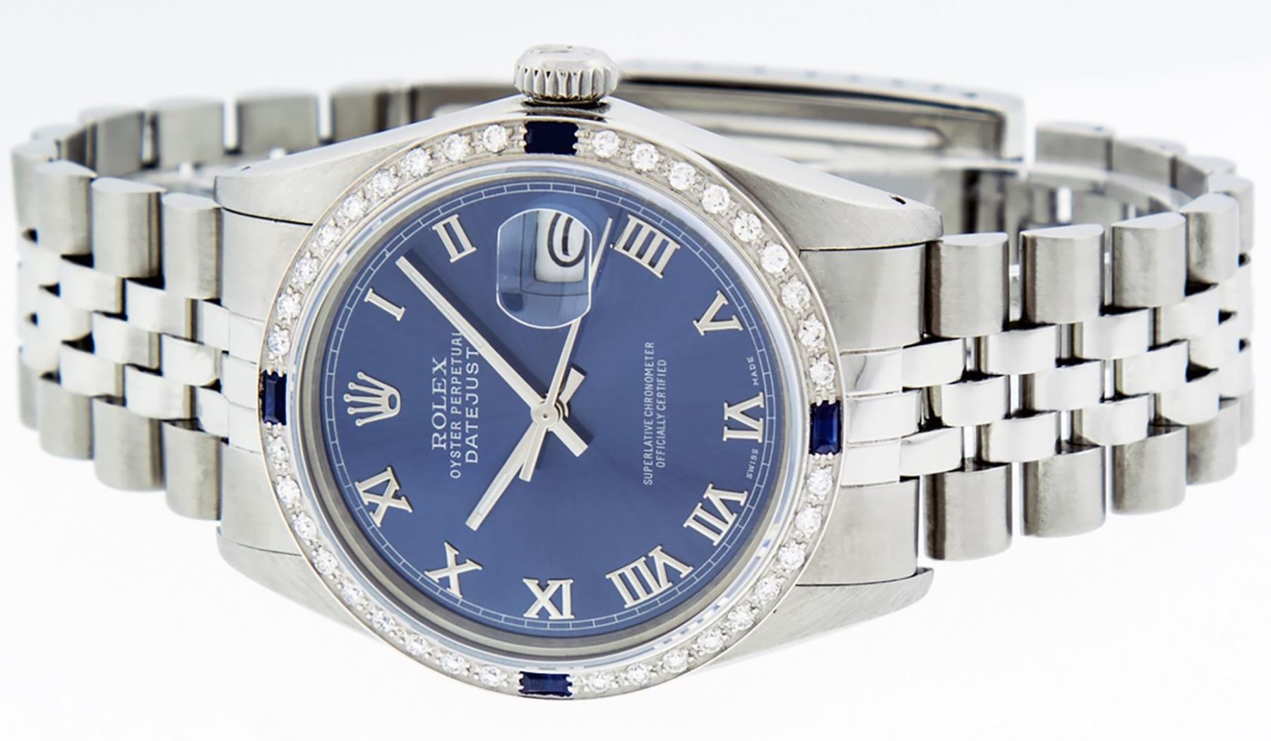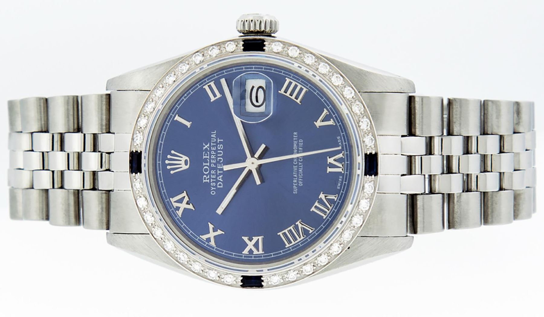 One Mens Stainless Steel Rolex Datejust Polished Bright with Satin Finish, This Watch Has Been Serviced & Electronically Tested, Stainless Steel Case: 36mm, Stainless Steel Crown, Custom Bezel: New 18K White Gold Sapphire Beadset Diamond Bezel, Diamond + Gem Count: 36 Diamonds + 4 Sapphires. Custom Crystal: New Sapphire With Magnified Date Window. Custom Hands: New Luminescent Hands. Rolex Movement: Automatic Winding Movement 3035. Custom Dial: Blue Roman With Square Track. Date Window: 3 O'Clock Position Date Display, Quickset, Model: Quickset Datejust, Condition: G-6 Extra Fine. Bracelet: Stainless Steel Jubilee Band. Bracelet: 7.0 Inch Length, Adjustable. Standard Clasp, With Rolex Logo. This Watch Has Been Serviced Time Tested And Is In Excellent Condition It Is Free Of All Scratches And Dents.