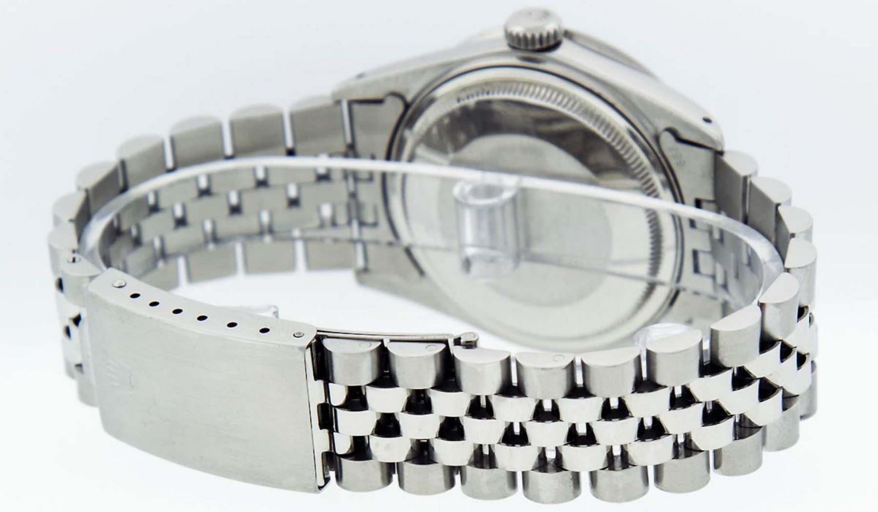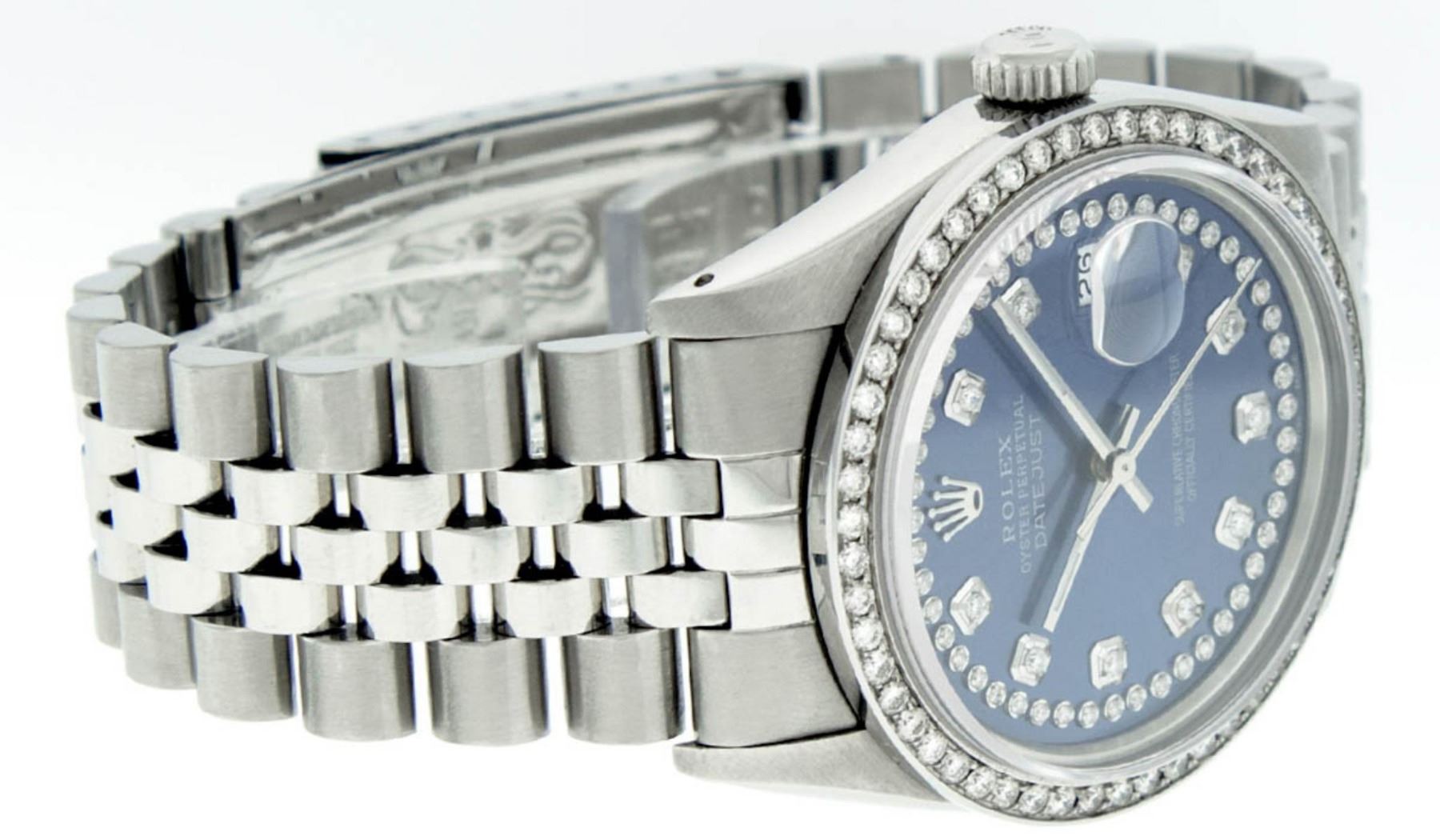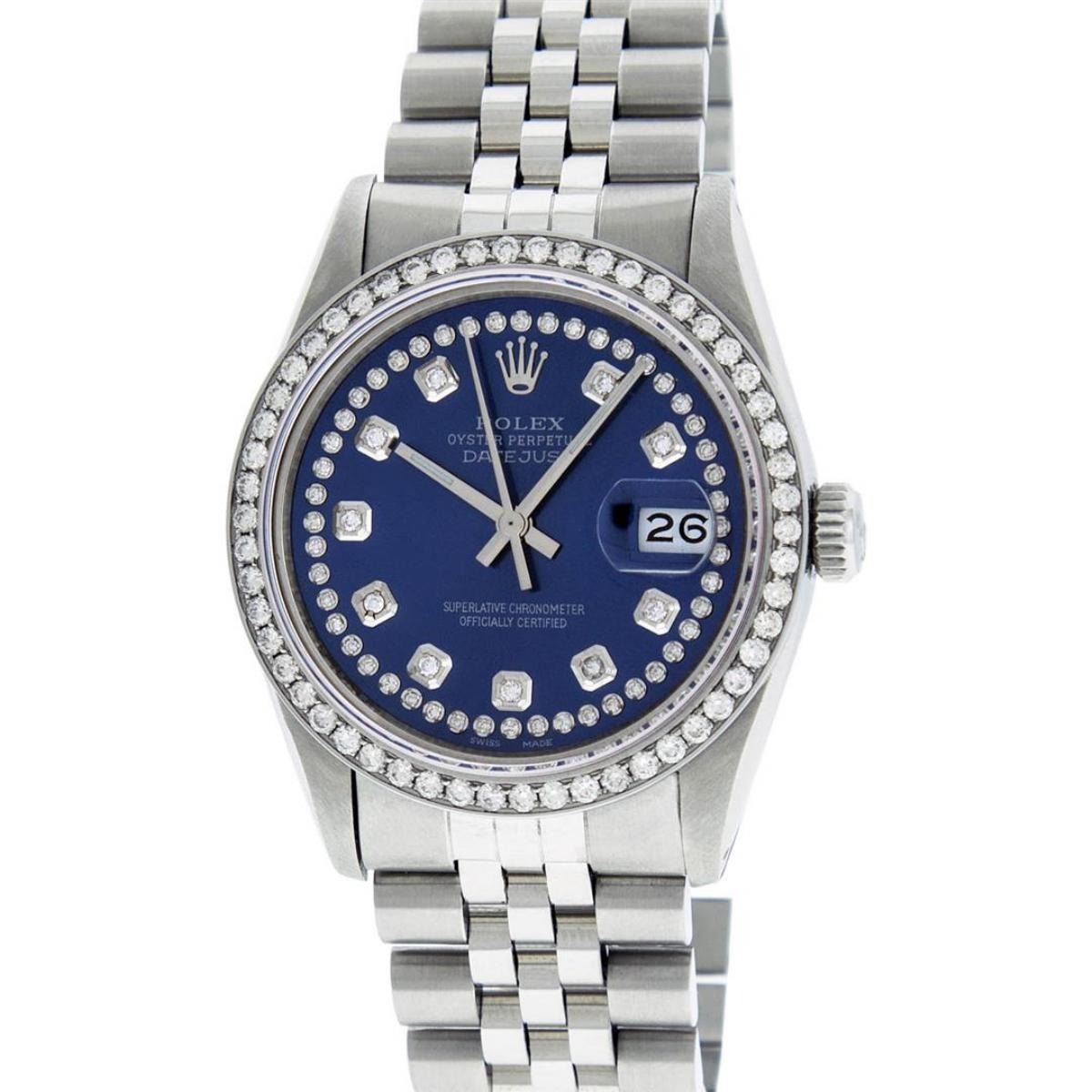 One Mens Rolex Stainless Steel Datejust Polished Bright with Satin Finish, This Watch Has Been Serviced & Electronically Tested, Stainless Steel Case: 36mm, Stainless Steel Crown, Custom Bezel: Stainless Steel Beadset Diamond Bezel, Diamond Count: 54 Diamonds, Total Weight 1.00 Carat, Clarity: SI-VS, Color: G to H. Custom Crystal: New Synthetic Sapphire Cyclops Lens. Custom Hands: New Luminescent Hands. Movement: Automatic Winding Movement Caliber 3035. Custom Dial: Blue String Diamond Dial, Diamond Count: 58 Diamonds In Dial, Color: G to H, Clarity: VS2-SI1. Date Window: 3 O'Clock Position Date Display, Quickset, Model: Datejust. Condition: G-6 Extra Fine. Bracelet: Stainless Steel Jubilee Band. Bright Polish & Satin Finish. 7.0 Inch Length, Adjustable. Standard Clasp, With Rolex Logo. This Watch Has Been Serviced Time Tested And Is In Excellent Condition It Is Free Of All Scratches And Dents.