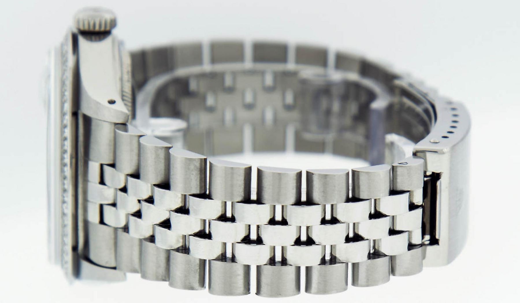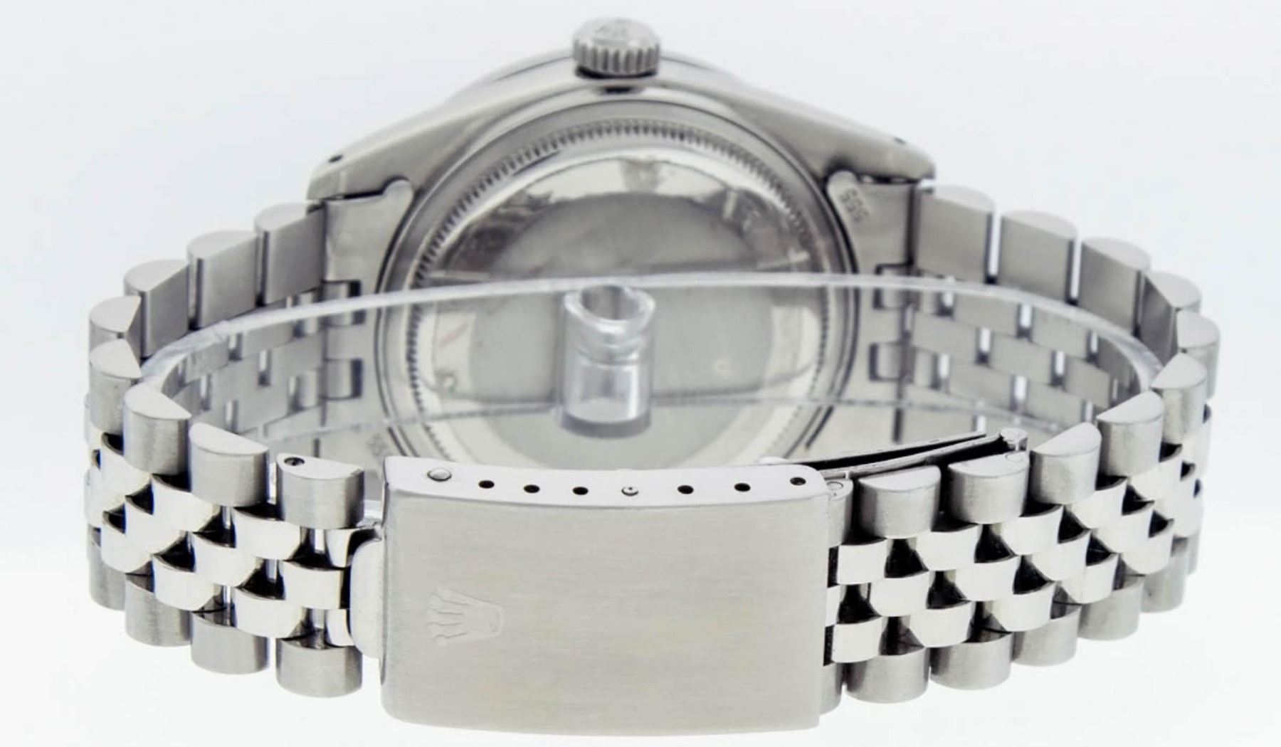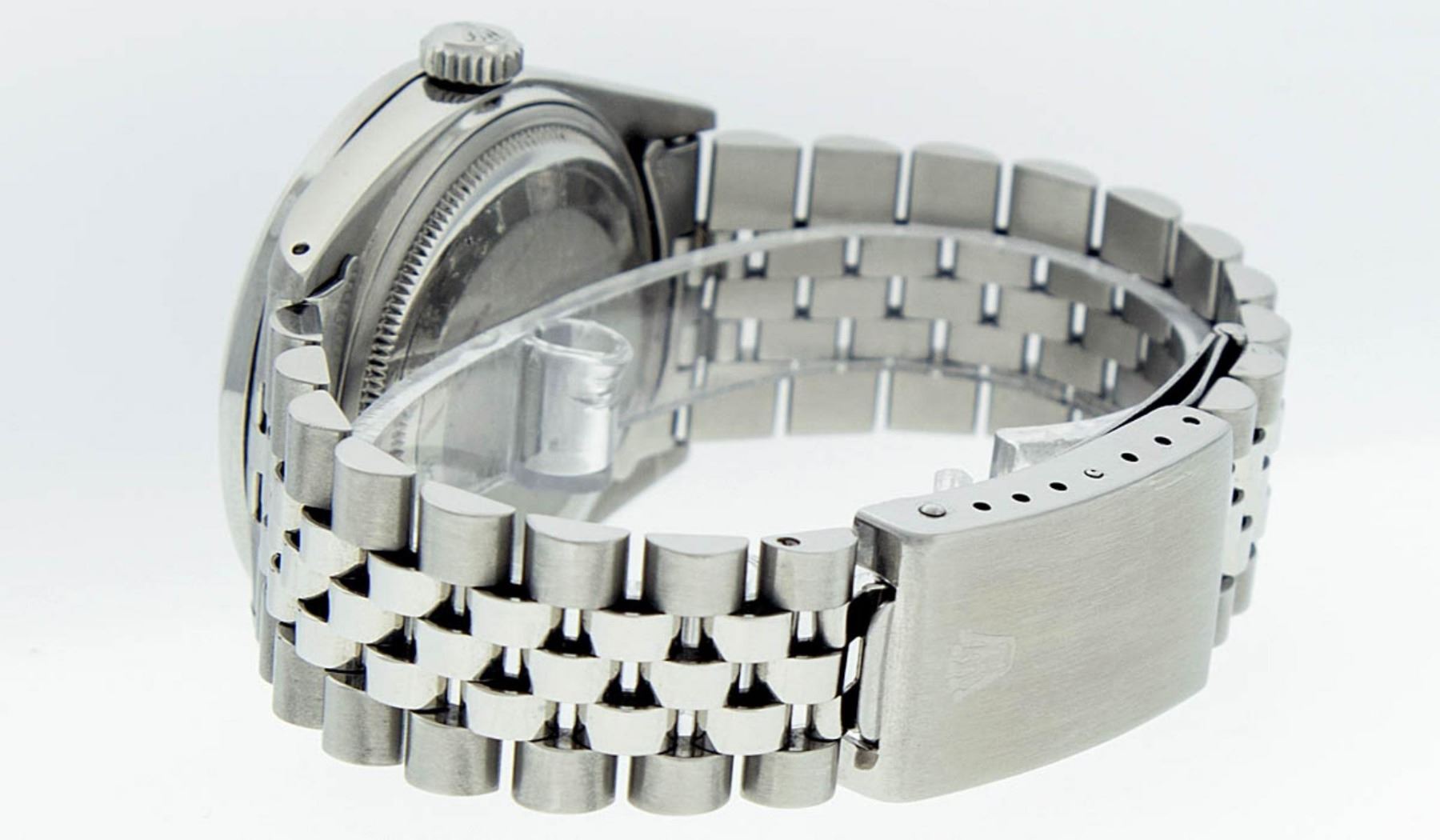 One Mens Rolex Stainless Steel Datejust Polished Bright with Satin Finish, This Watch Has Been Serviced & Electronically Tested, Stainless Steel Case: 36mm, Stainless Steel Crown, Custom Bezel: Stainless Steel Beadset Diamond Bezel, Diamond Count: 54 Diamonds, Total Weight 1.00 Carat, Clarity: SI-VS, Color: G to H. Custom Crystal: New Synthetic Sapphire Cyclops Lens. Custom Hands: New Luminescent Hands. Movement: Automatic Winding Movement Caliber 3035. Custom Dial: Blue String Diamond Dial, Diamond Count: 58 Diamonds In Dial, Color: G to H, Clarity: VS2-SI1. Date Window: 3 O'Clock Position Date Display, Quickset, Model: Datejust. Condition: G-6 Extra Fine. Bracelet: Stainless Steel Jubilee Band. Bright Polish & Satin Finish. 7.0 Inch Length, Adjustable. Standard Clasp, With Rolex Logo. This Watch Has Been Serviced Time Tested And Is In Excellent Condition It Is Free Of All Scratches And Dents.