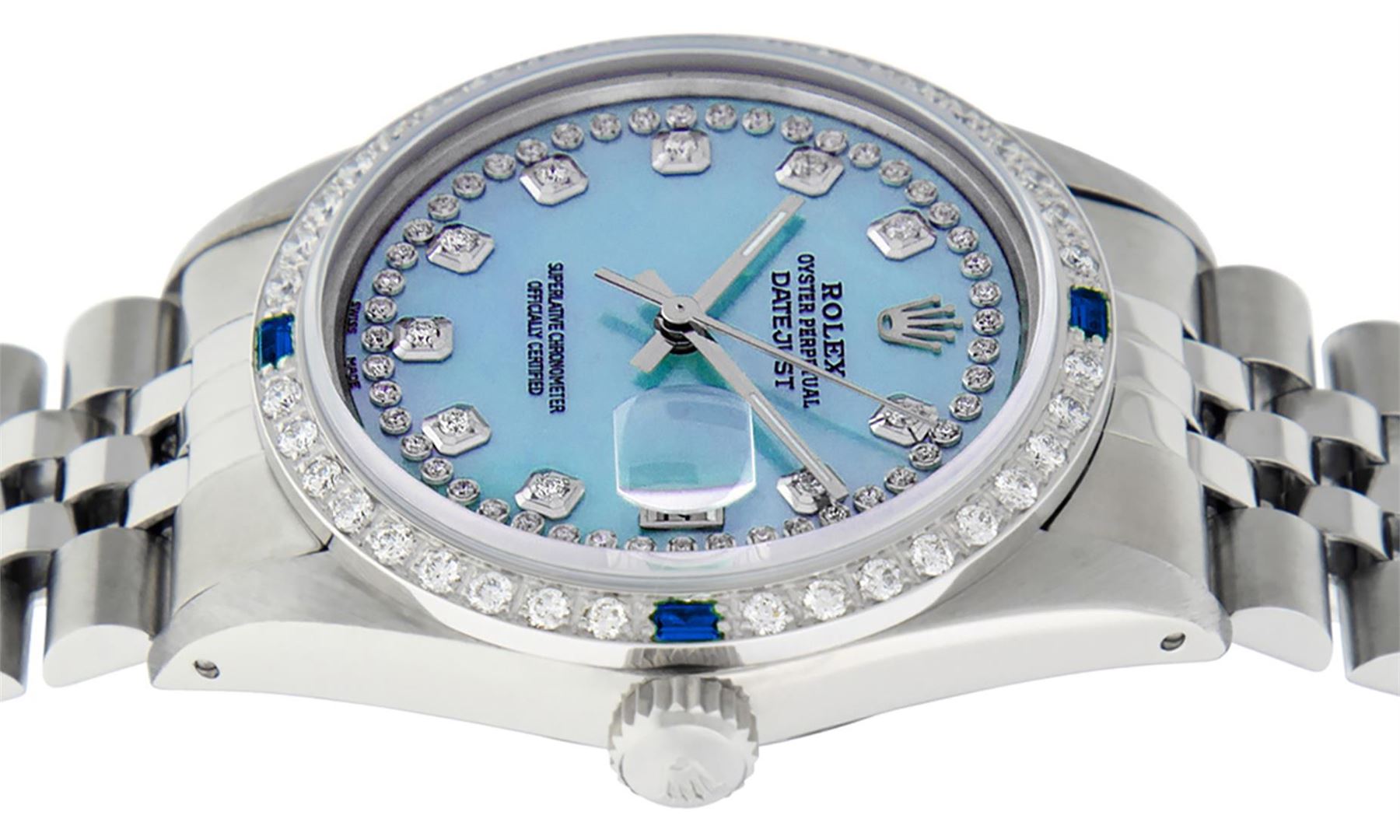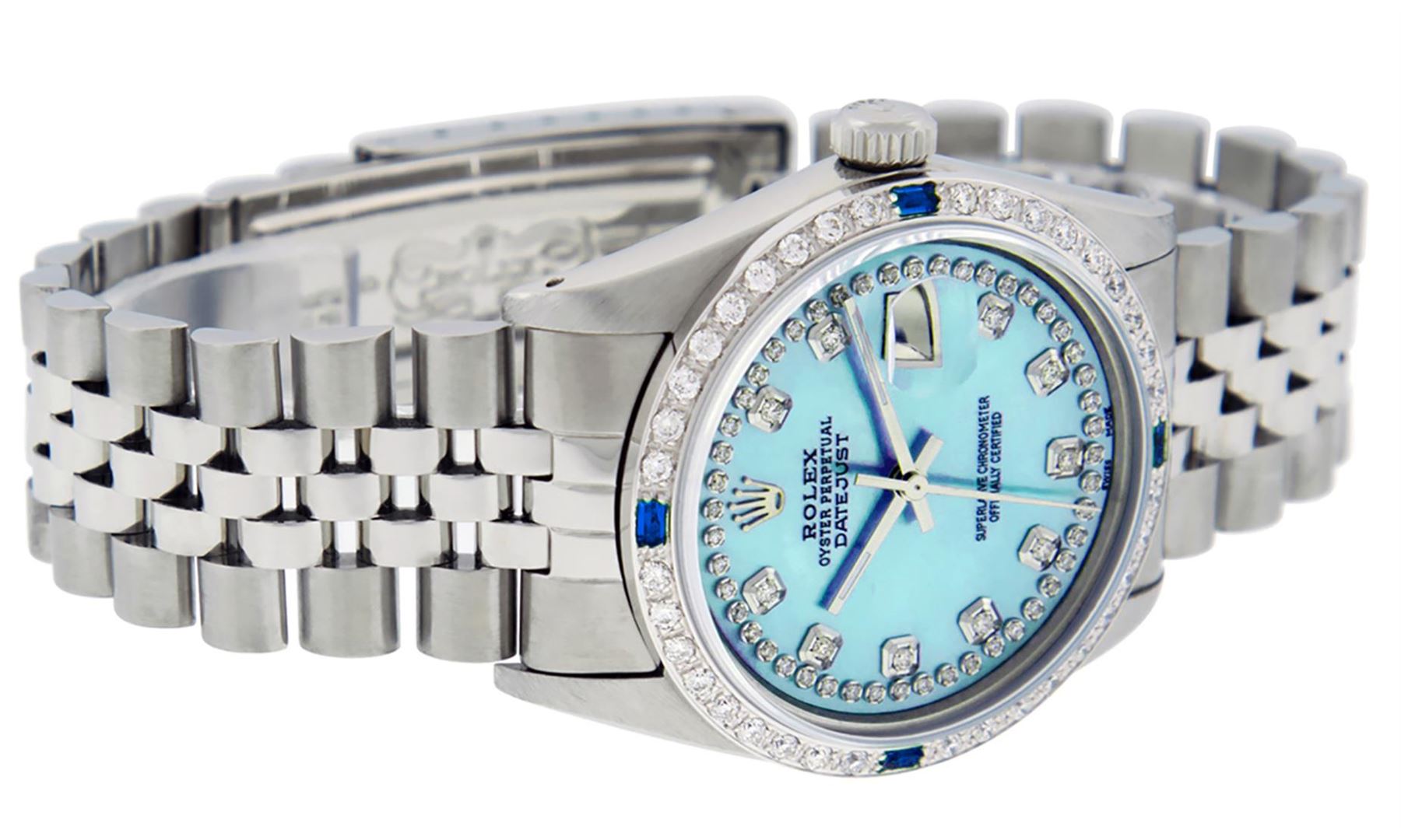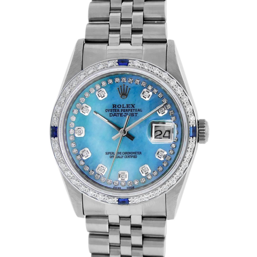 One Mens Rolex Datejust Polished Bright with Satin Finish, Serviced & Electronically Tested, Stainless Steel Case: 36mm, Custom Diamond Lugs: 28 Diamonds In Lugs, Color: G to H, Clarity: SI-VS. Stainless Steel Crown, Custom Bezel: 18K White Gold Diamond + Sapphire Beadset, Diamond Count: 36 Diamonds + 4 Sapphires, Total Weight 1.00 Carat, Clarity: SI-VS, Color: G to H. Custom Crystal: New Scratch Resistant Synthetic Sapphire Cyclops Lens. Custom Hands: New Luminescent Hands. Movement: Automatic Winding Movement Caliber 3035. Custom Dial: Blue Mother Of Pearl String Diamond Dial, Stone Count: 58 Diamonds In Dial, Diamond Color: G To H In Color, Clarity: VS. Date Window: 3 O'Clock Position Date Display, Quickset, Model: Datejust Condition: G-6 Extra Fine. Bracelet: Stainless Steel Jubilee Band. Bright Polish & Satin Finish. 7.0 Inch Length, Adjustable. Standard Clasp, With Rolex Logo. This Watch Has Been Serviced And Polished And Its Free Of All Dents And Scratches.