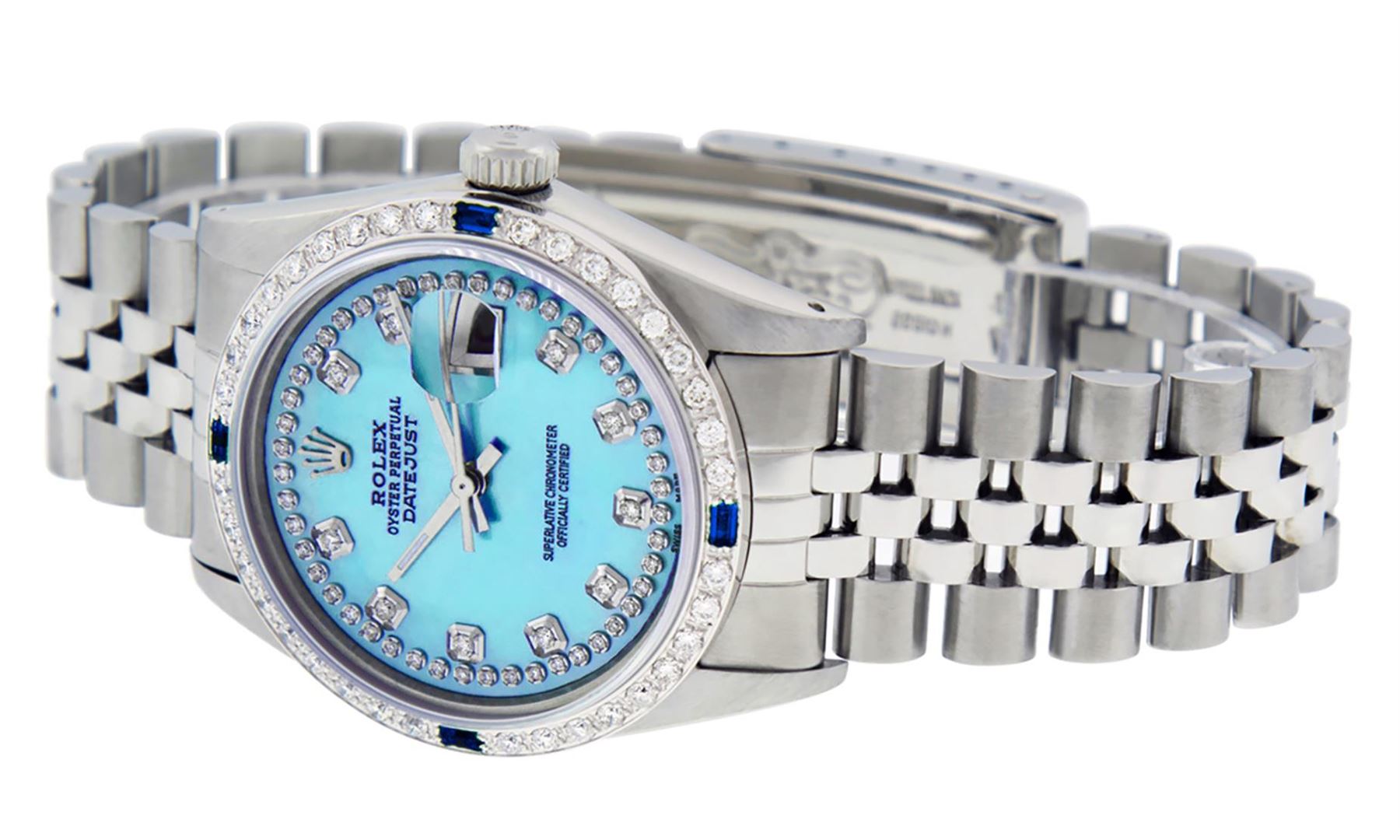 One Mens Rolex Datejust Polished Bright with Satin Finish, Serviced & Electronically Tested, Stainless Steel Case: 36mm, Custom Diamond Lugs: 28 Diamonds In Lugs, Color: G to H, Clarity: SI-VS. Stainless Steel Crown, Custom Bezel: 18K White Gold Diamond + Sapphire Beadset, Diamond Count: 36 Diamonds + 4 Sapphires, Total Weight 1.00 Carat, Clarity: SI-VS, Color: G to H. Custom Crystal: New Scratch Resistant Synthetic Sapphire Cyclops Lens. Custom Hands: New Luminescent Hands. Movement: Automatic Winding Movement. Custom Dial: Blue Mother Of Pearl String Diamond Dial, Stone Count: 58 Diamonds In Dial, Diamond Color: G To H In Color, Clarity: VS. Date Window: 3 O'Clock Position Date Display, Quickset, Model: Datejust Condition: G-6 Extra Fine. Bracelet: Stainless Steel Jubilee Band. Bright Polish & Satin Finish. 7.0 Inch Length, Adjustable. Standard Clasp, With Rolex Logo. This Watch Has Been Serviced And Polished And Its Free Of All Dents And Scratches.