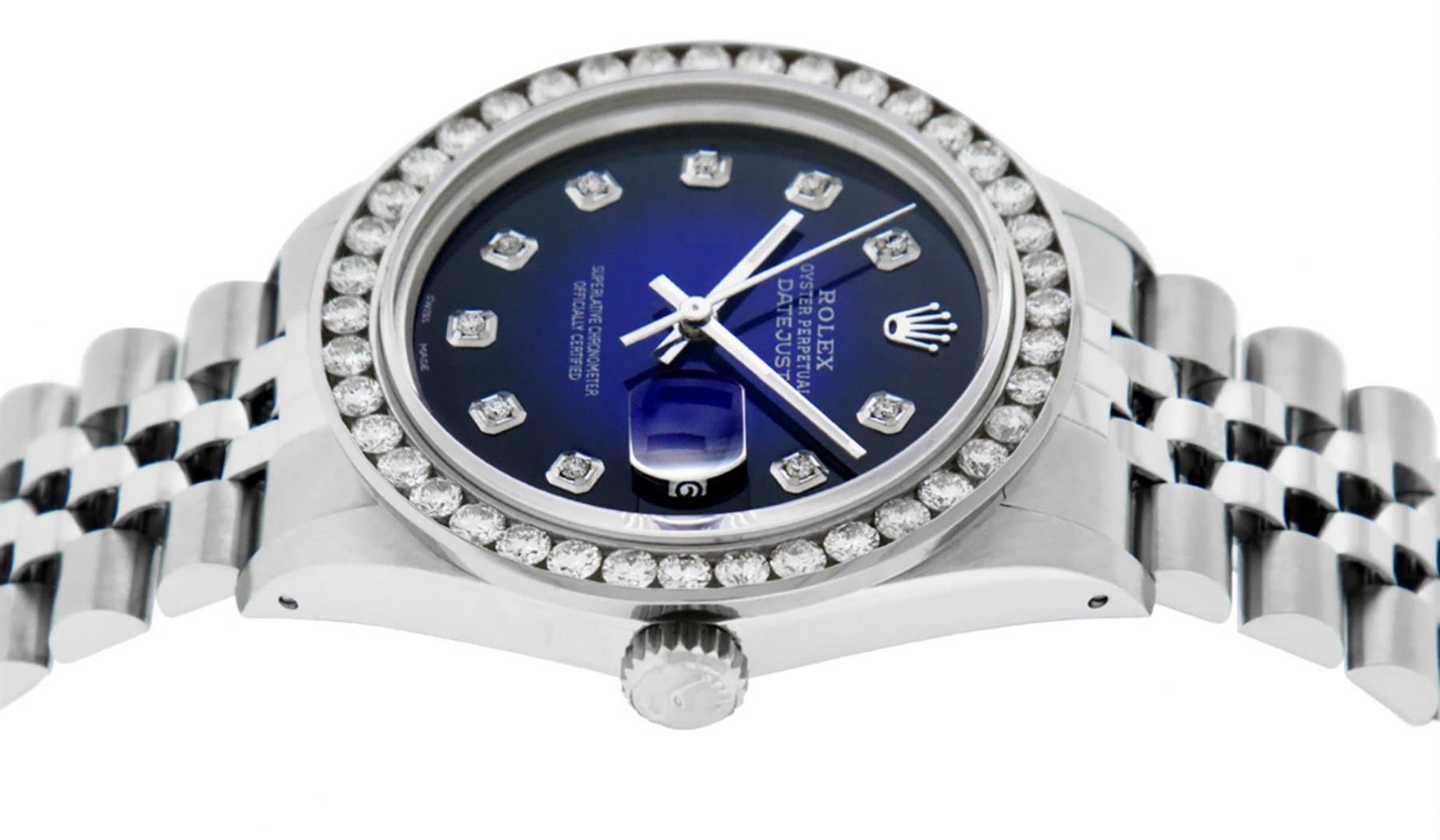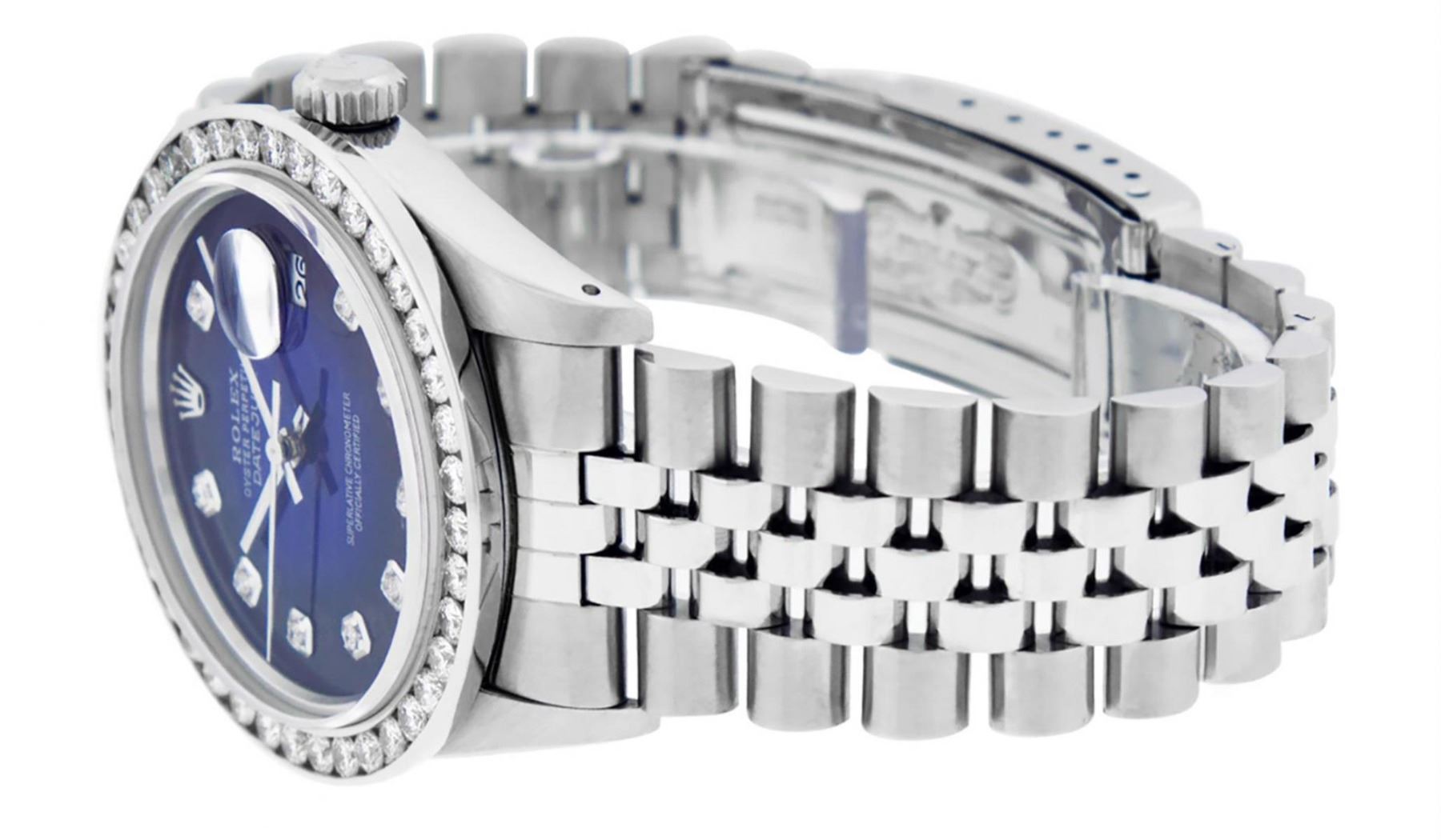 One Mens Stainless Steel Rolex Datejust Polished Bright with Satin Finish, Fully Serviced & Electronically Tested, Stainless Steel Case:36mm, Stainless Steel Crown, Custom Bezel: 18K White Gold 3.00 Ctw Diamond Bezel, Diamond Count: 40 Diamonds, Total Weight 3.0 Carat, Clarity: SI-VS, Color: G to H. Custom Crystal: New Synthetic Sapphire Cyclops Lens. Custom Hands: New Luminecent Hands. Movement: Automatic Winding Movement Caliber 3035. Custom Dial: Blue Vignette Diamond Dial, 10 Diamonds in Dial, G To H In Color, Clarity: SI-VS. Date Window: 3 O'Clock Position Date Display, Quickset, Model: Datejust 36mm, Condition: G-6 Extra Fine. Bracelet: Rolex Stainless Steel Jubilee Band. Bright Polish & Satin Finish. 7.0 Inch Length, Adjustable. Standard Clasp, With Rolex Logo. Watch Has Been Serviced And Polished It Is Free Of All Scratches And Dents.