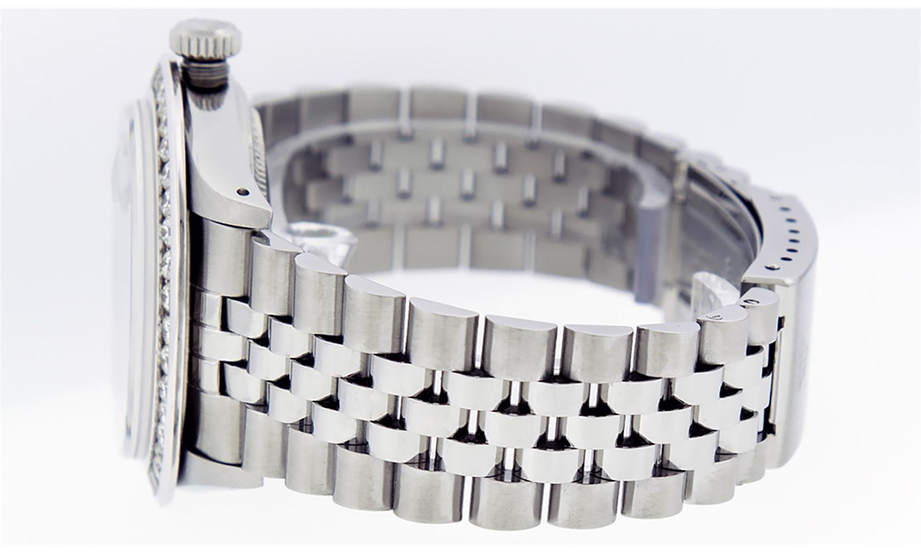 One Mens Stainless Steel Rolex Datejust Polished Bright with Satin Finish, Fully Serviced & Electronically Tested, Stainless Steel Case:36mm, Stainless Steel Crown, Custom Bezel: 18K White Gold 3.00 Ctw Diamond Bezel, Diamond Count: 40 Diamonds, Total Weight 3.0 Carat, Clarity: SI-VS, Color: G to H. Custom Crystal: New Scratch Resistant Synthetic Sapphire Cyclops Lens. Custom Hands: New Luminecent Hands. Movement: Automatic Winding Movement. Custom Dial: Blue Vignette Diamond Dial, 10 Diamonds in Dial, G To H In Color, Clarity: SI-VS. Date Window: 3 O'Clock Position Date Display, Quickset, Model: Datejust 36mm, Condition: G-6 Extra Fine. Bracelet: Rolex Stainless Steel Jubilee Band. Bright Polish & Satin Finish. 7.0 Inch Length, Adjustable. Standard Clasp, With Rolex Logo. Watch Has Been Serviced And Polished It Is Free Of All Scratches And Dents.
