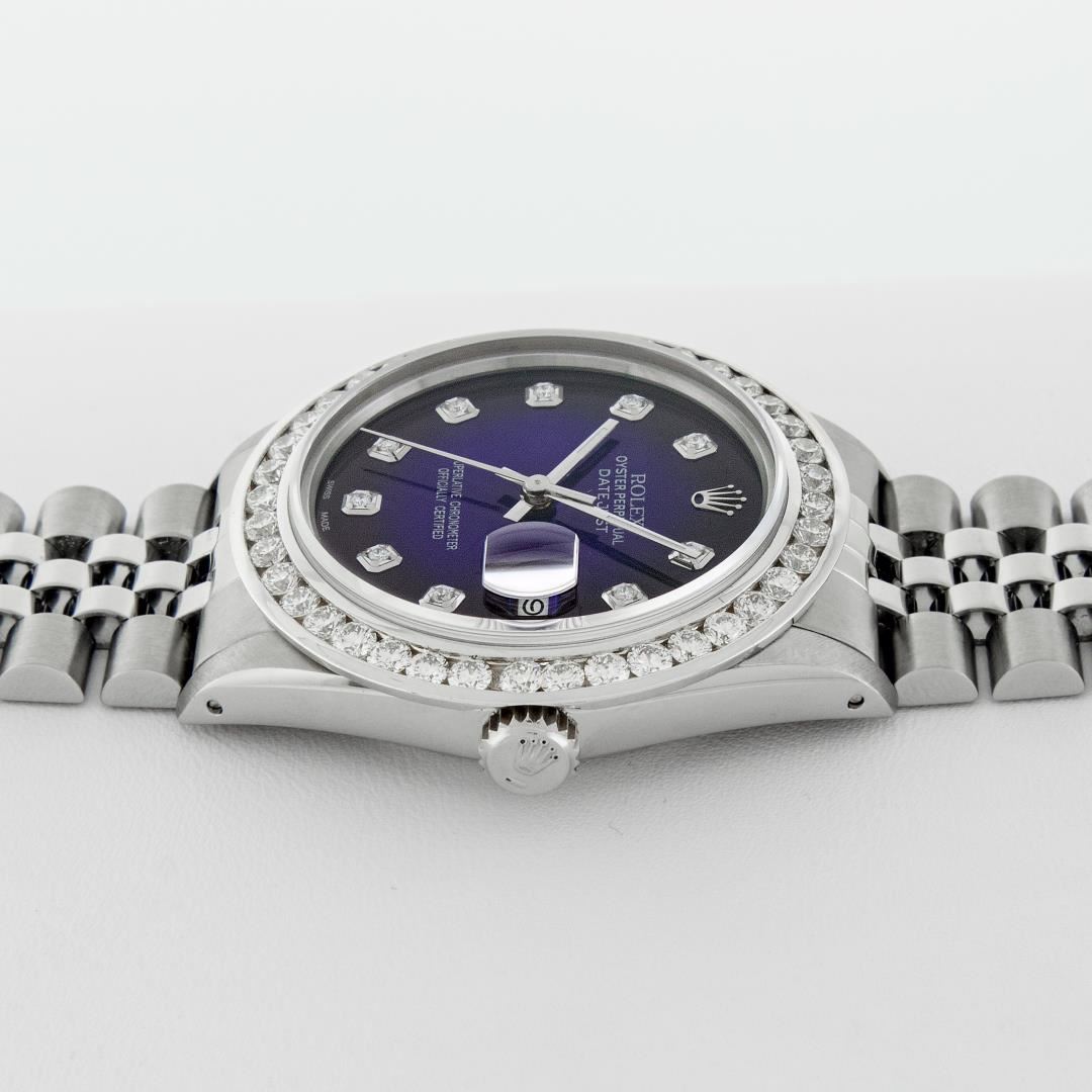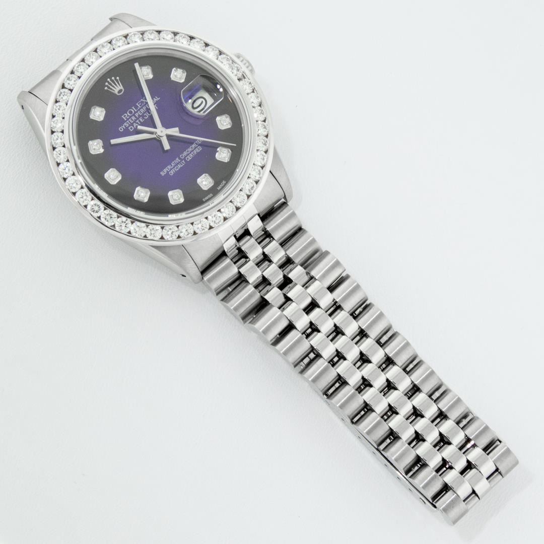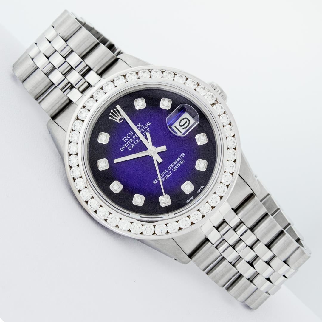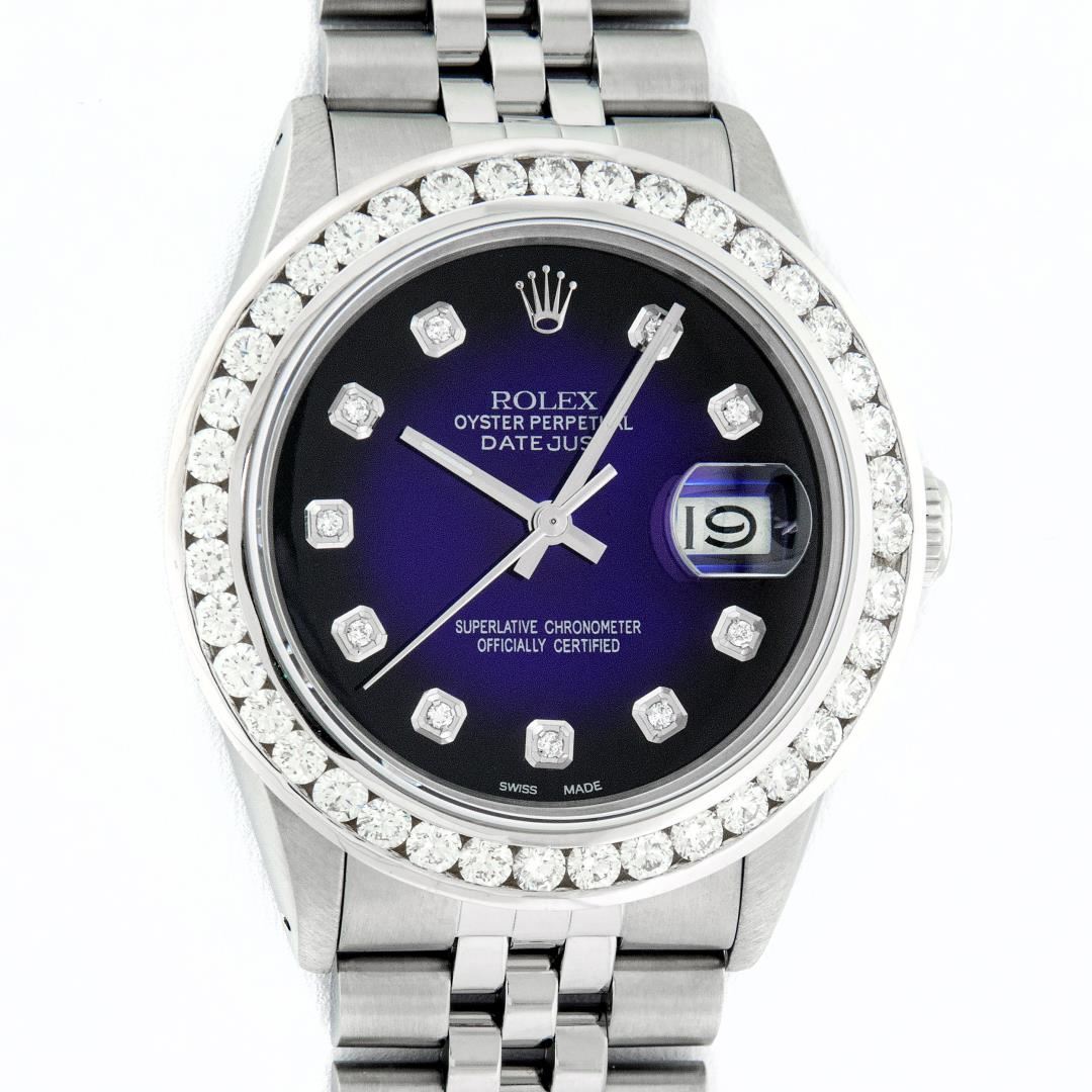 One Mens Pre Owned Stainless Steel Rolex Datejust Polished Bright with Satin Finish, Fully Serviced & Electronically Tested, Rolex Stainless Steel Case: 36mm, Rolex Stainless Steel Crown, Custom Bezel: New 18K White Gold 3.00 Ctw Diamond Bezel, Diamond Count: 40 Diamonds, Total Weight 3.0 Carat. Custom Crystal: New Sapphire With Magnified Date Window. Custom Hands: New Luminescent Hands. Rolex Movement: Automatic Winding Movement 3035. Custom Dial: Custom Blue Vignette Dial With Added Diamond Hour Markers, 10 Diamonds On Dial. Date Window: 3 O'Clock Position Date Display, Quickset, Model: Datejust 36mm, Condition: G-6 Extra Fine. Rolex Bracelet: Rolex Stainless Steel Jubilee Band. Bright Polish And Satin Finish. 7.0 Inch Length, Adjustable. Standard Clasp, With Rolex Logo. This Watch Has Been Serviced And Polished It Is Free Of All Scratches And Dents.