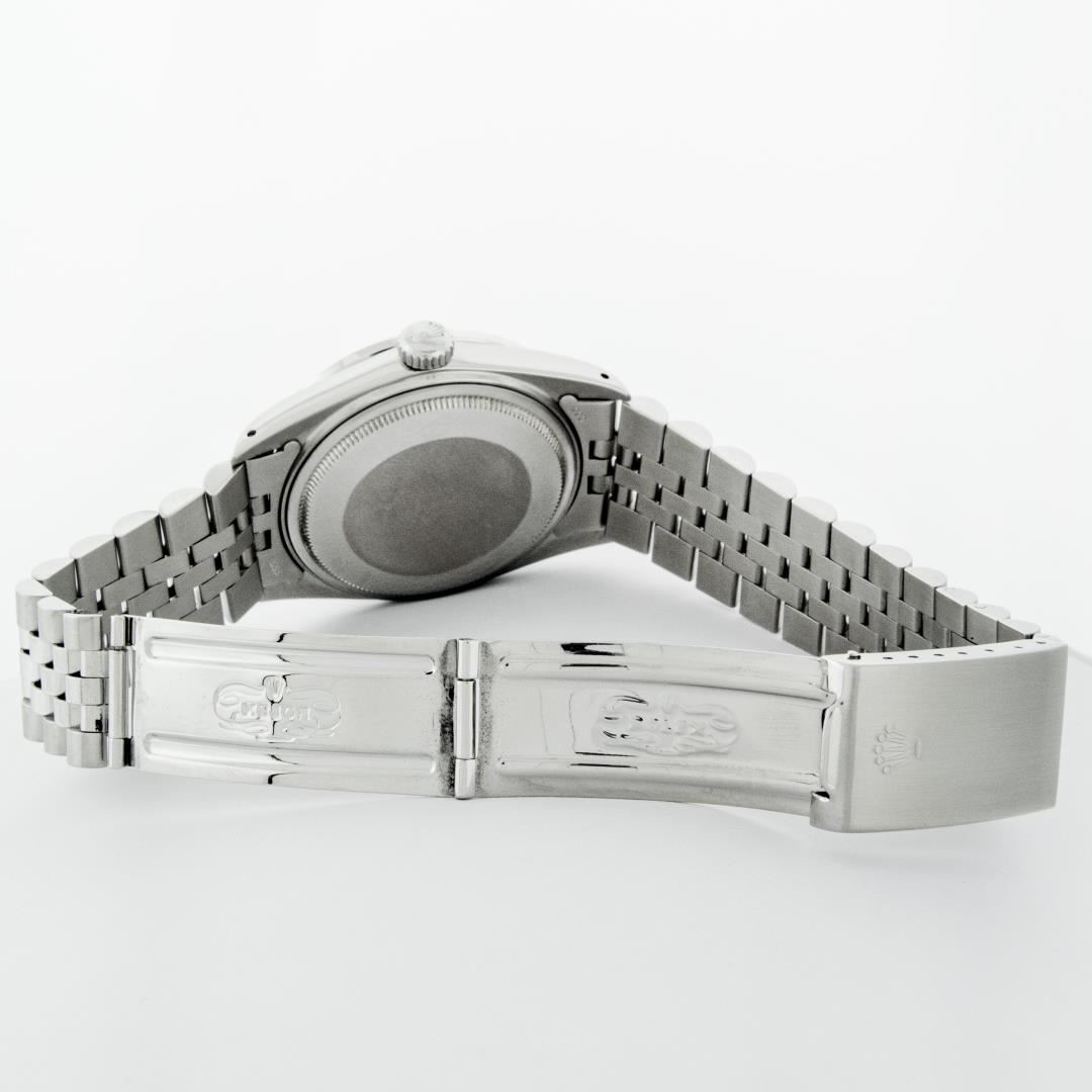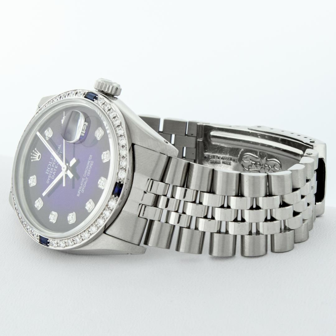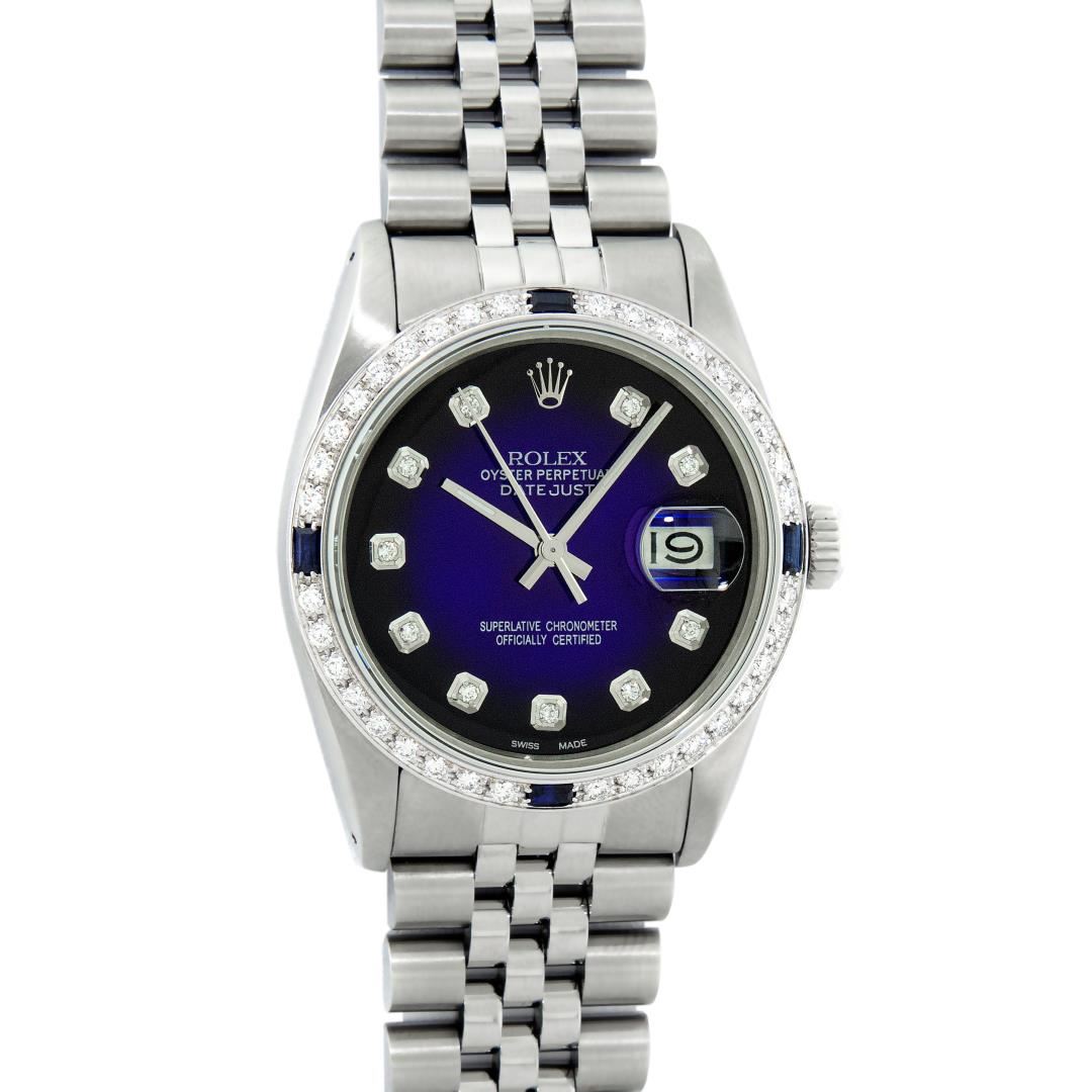 One Pre Owned Rolex Stainless Steel 36MM Datejust Polished Bright with Satin Finish, Rolex Stainless Steel Case: 36mm, Rolex Stainless Steel Crown, Custom Bezel: New 18K White Gold Sapphire Beadset Diamond Bezel. Custom Crystal: New Sapphire With Date Window. Custom Hands: New Luminescent Hands. Rolex Movement: Automatic Winding Movement 3035. Custom Dial: Custom Blue Vignette With Added Diamond Hour Markers, Diamond Count: 10 Diamonds in Dial. Date Window: 3 O'Clock Position Date Display, Quickset, Model: Quickset Datejust, Condition: G-6 Extra Fine. Rolex Bracelet: Stainless Steel Jubilee Band. Bracelet: 7.0 Inch Length, Adjustable. Fold Clasp, With Rolex Logo. This Watch Has Been Serviced Time Tested And Is In Excellent Condition It Is Free Of All Scratches And Dents.