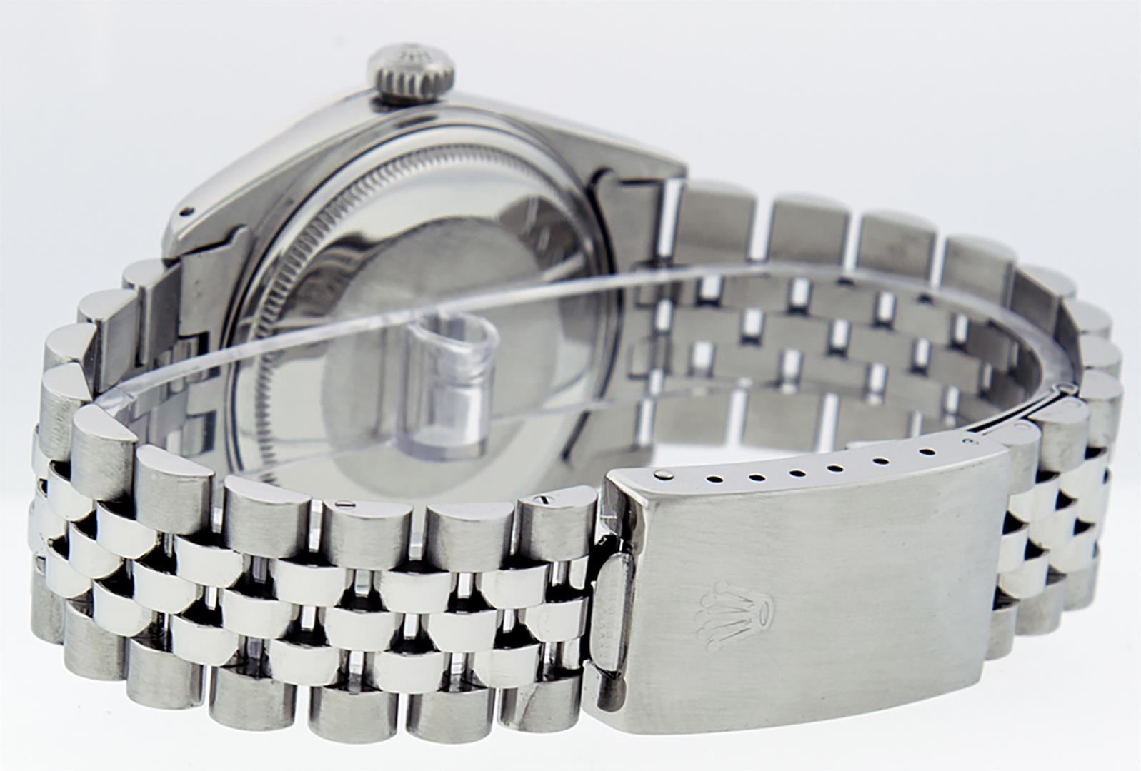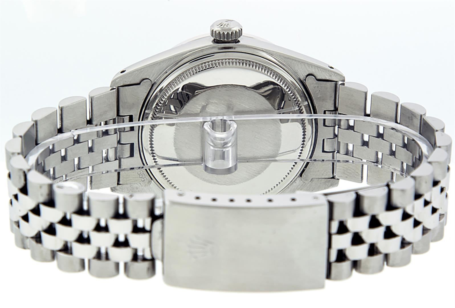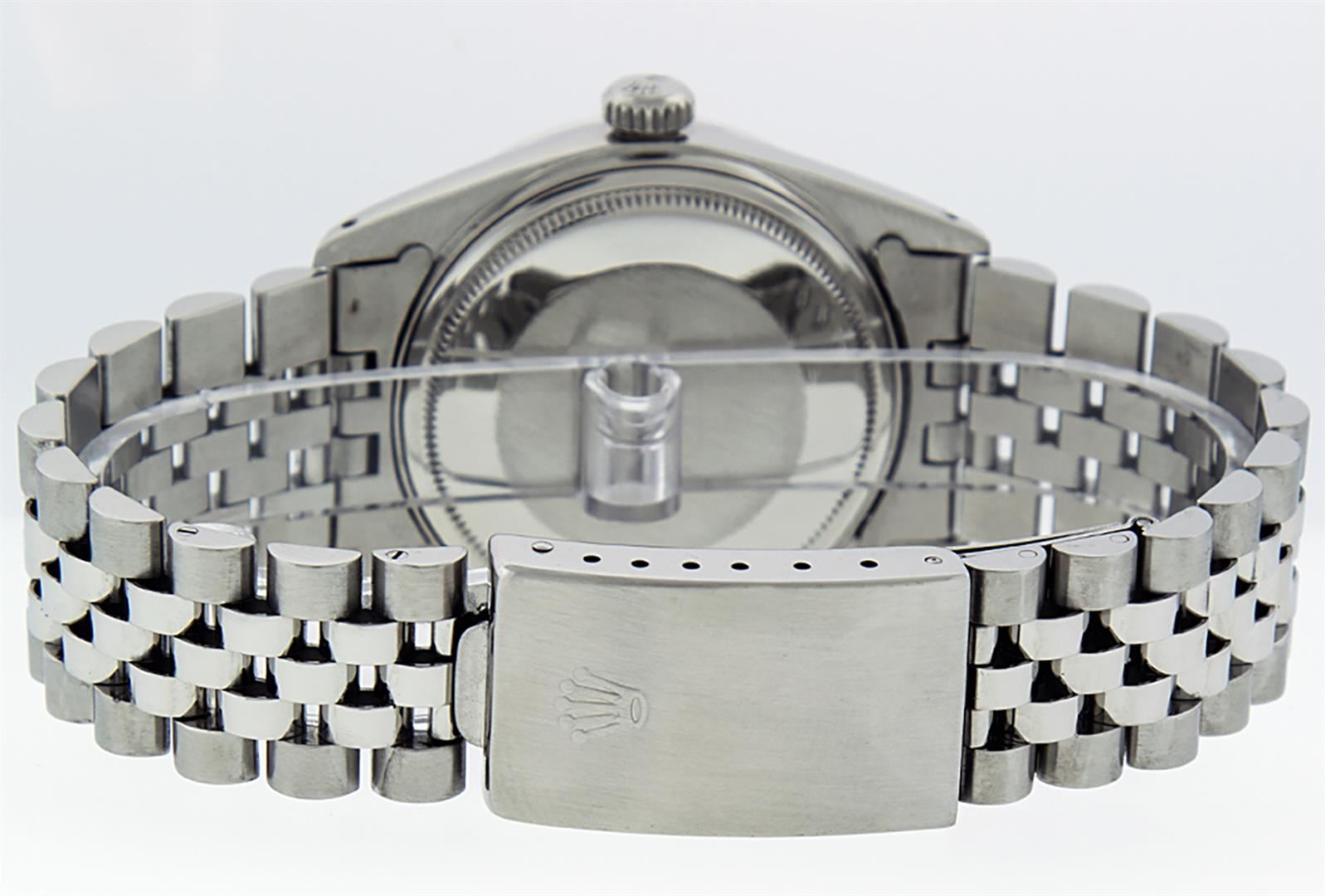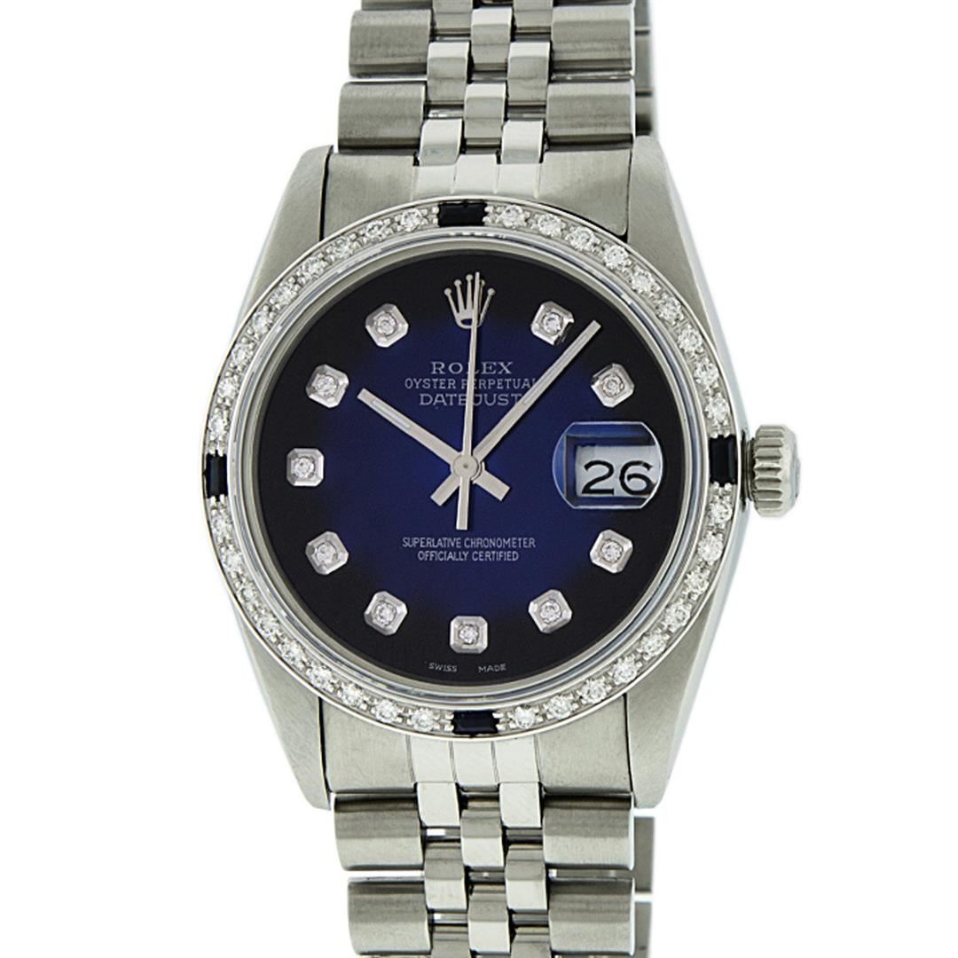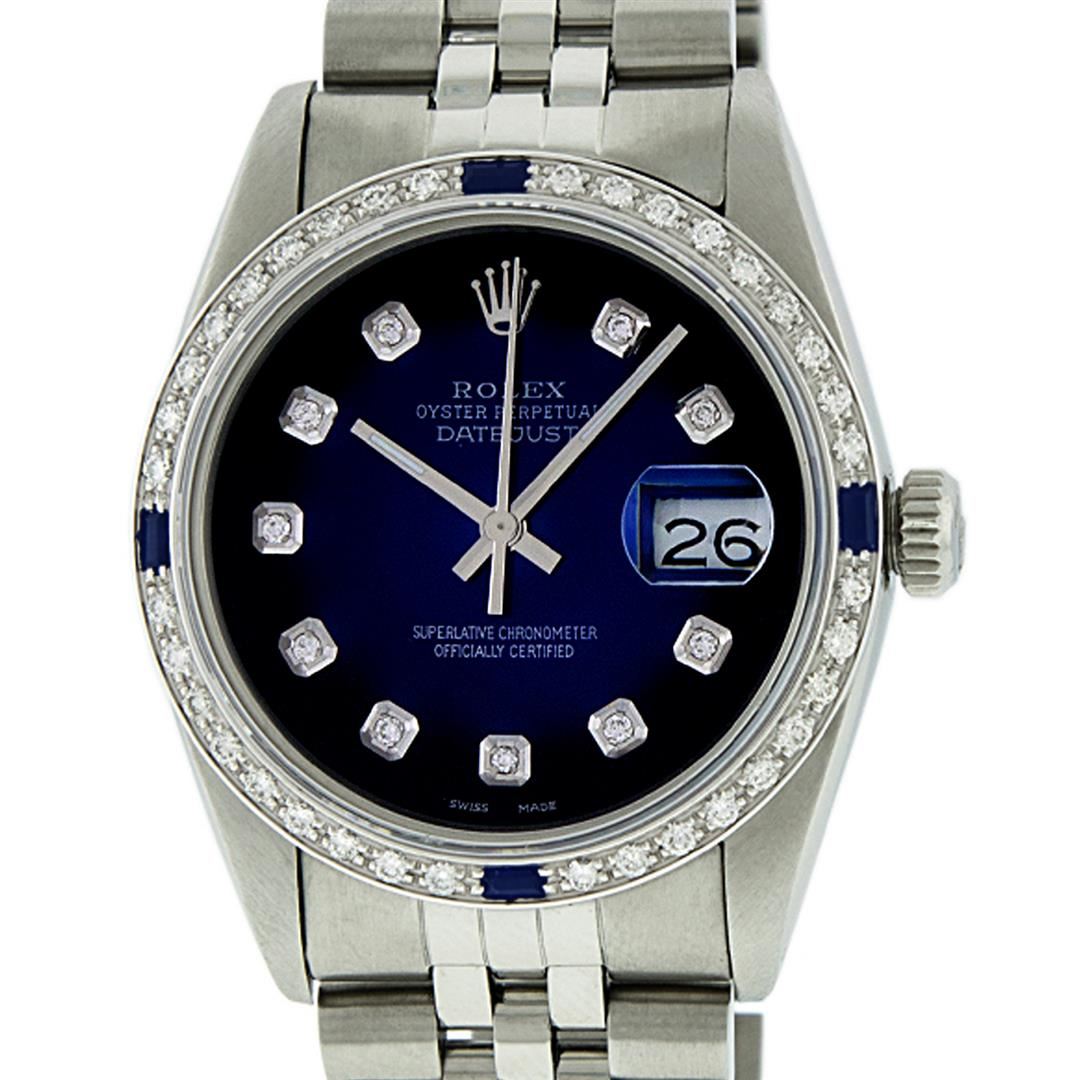 One Mens Rolex Datejust Polished Bright with Satin Finish, This Watch Has Been Serviced & Electronically Tested, Stainless Steel Case: 36mm, Stainless Steel Crown, Custom Bezel: New 18K White Gold Sapphire Beadset Diamond Bezel, Diamond + Gem Count: 36 Diamonds + 4 Sapphires Total Weight 1.00 Carat, Clarity: Si-VS, Color: G to H. Custom Crystal: New Synthetic Sapphire Cyclops Lens. Custom Hands: New Luminescent Hands. Movement: Automatic Winding Movement. Custom Dial: Blue Vignette With Diamond Hour Markers, Diamond Count: 10 Diamonds in Dial, Diamond Color: G To H In Color, Clarity: Si-VS. Date Window: 3 O'Clock Position Date Display, Quickset, Model: Datejust, Condition: G-6 Extra Fine. Bracelet: Stainless Steel Jubilee. Bracelet: 7.0 Inch Length, Adjustable. Standard Clasp, With Rolex Logo. This Watch Has Been Serviced Time Tested And Is In Excellent Condition It Is Free Of All Scratches And Dents.