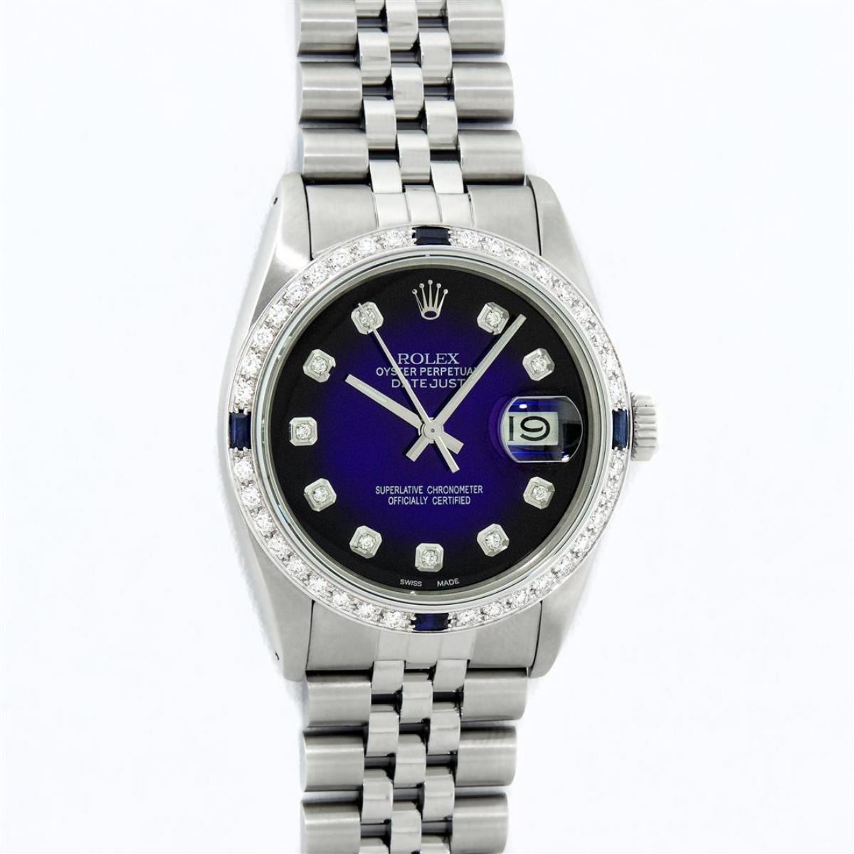 One Mens Rolex Datejust Polished Bright with Satin Finish, This Watch Has Been Serviced & Electronically Tested, Stainless Steel Case: 36mm, Stainless Steel Crown, Custom Bezel: New 18K White Gold Sapphire Beadset Diamond Bezel, Diamond + Gem Count: 36 Diamonds + 4 Sapphires Total Weight 1.00 Carat, Clarity: Si-VS, Color: G to H. Custom Crystal: New Synthetic Sapphire Cyclops Lens. Custom Hands: New Luminescent Hands. Movement: Automatic Winding Movement. Custom Dial: Blue Vignette With Diamond Hour Markers, Diamond Count: 10 Diamonds in Dial, Diamond Color: G To H In Color, Clarity: Si-VS. Date Window: 3 O'Clock Position Date Display, Quickset, Model: Datejust, Condition: G-6 Extra Fine. Bracelet: Stainless Steel Jubilee. Bracelet: 7.0 Inch Length, Adjustable. Standard Clasp, With Rolex Logo. This Watch Has Been Serviced Time Tested And Is In Excellent Condition It Is Free Of All Scratches And Dents.