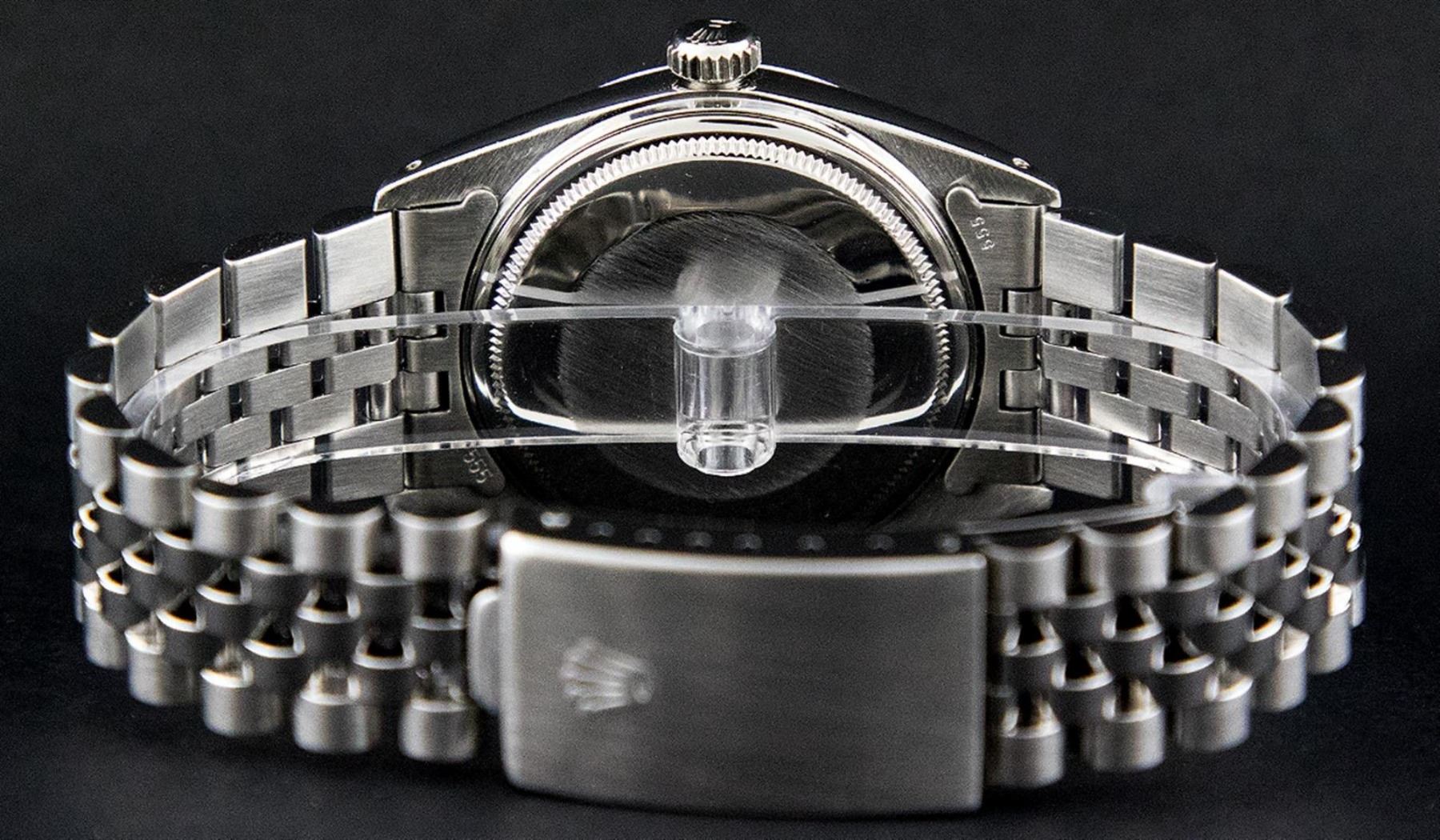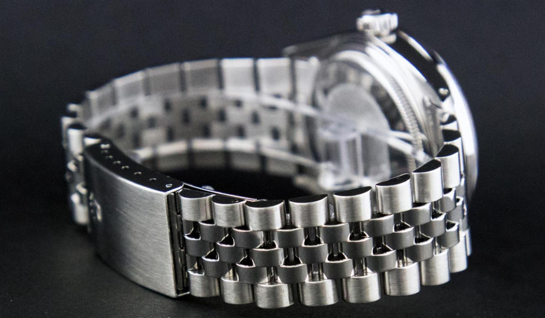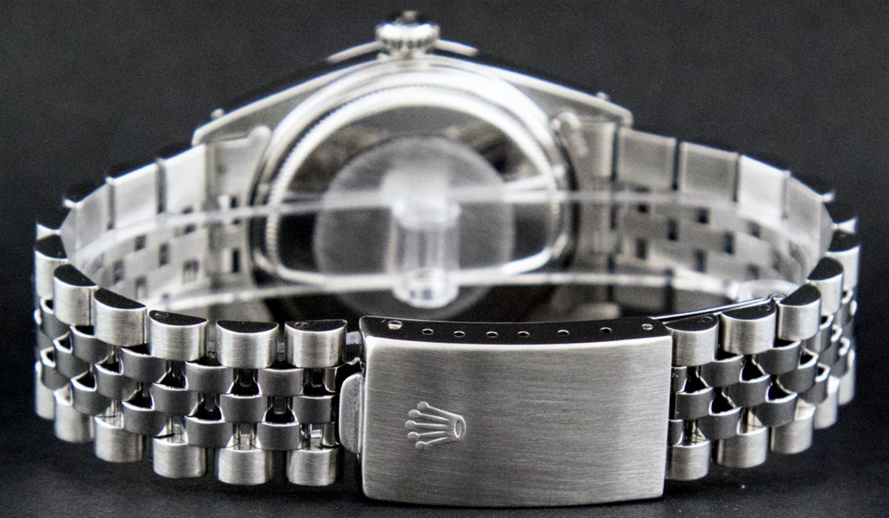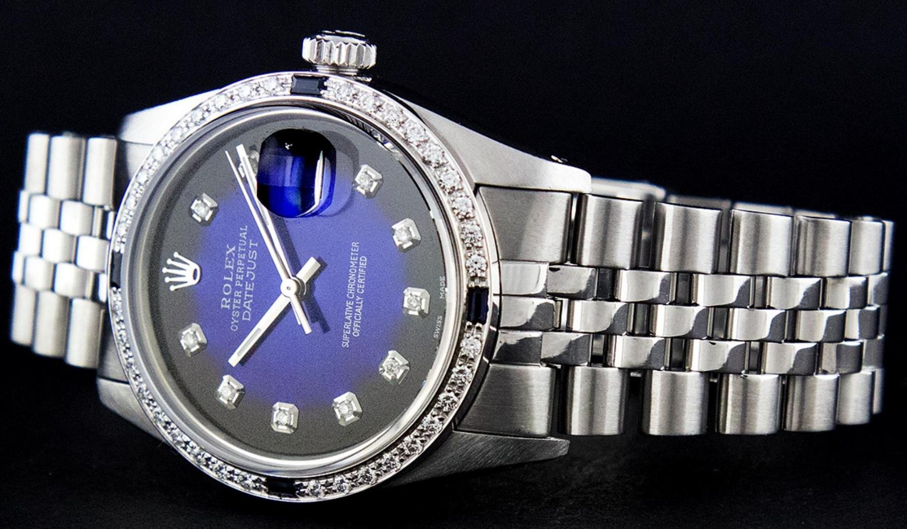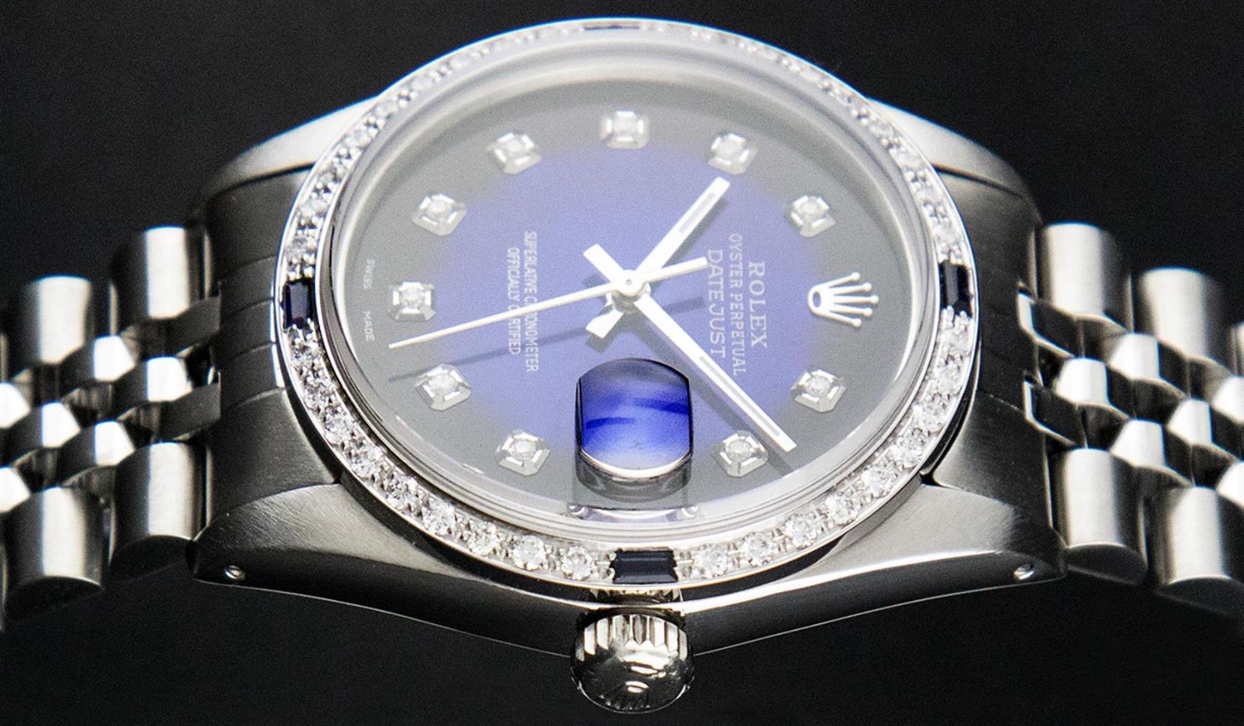 One Mens Rolex Datejust Polished Bright with Satin Finish, This Watch Has Been Serviced & Electronically Tested, Stainless Steel Case: 36mm, Stainless Steel Crown, Custom Bezel: New 18K White Gold Sapphire Beadset Diamond Bezel, Diamond + Gem Count: 36 Diamonds + 4 Sapphires Total Weight 1.00 Carat, Clarity: Si-VS, Color: G to H. Custom Crystal: New Synthetic Sapphire Cyclops Lens. Custom Hands: New Luminescent Hands. Movement: Automatic Winding Movement. Custom Dial: Blue Vignette With Diamond Hour Markers, Diamond Count: 10 Diamonds in Dial, Diamond Color: G To H In Color, Clarity: Si-VS. Date Window: 3 O'Clock Position Date Display, Quickset, Model: Datejust, Condition: G-6 Extra Fine. Bracelet: Stainless Steel Jubilee. Bracelet: 7.0 Inch Length, Adjustable. Standard Clasp, With Rolex Logo. This Watch Has Been Serviced Time Tested And Is In Excellent Condition It Is Free Of All Scratches And Dents.