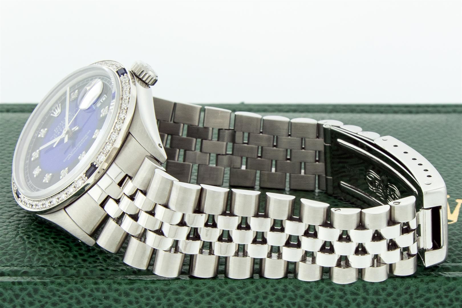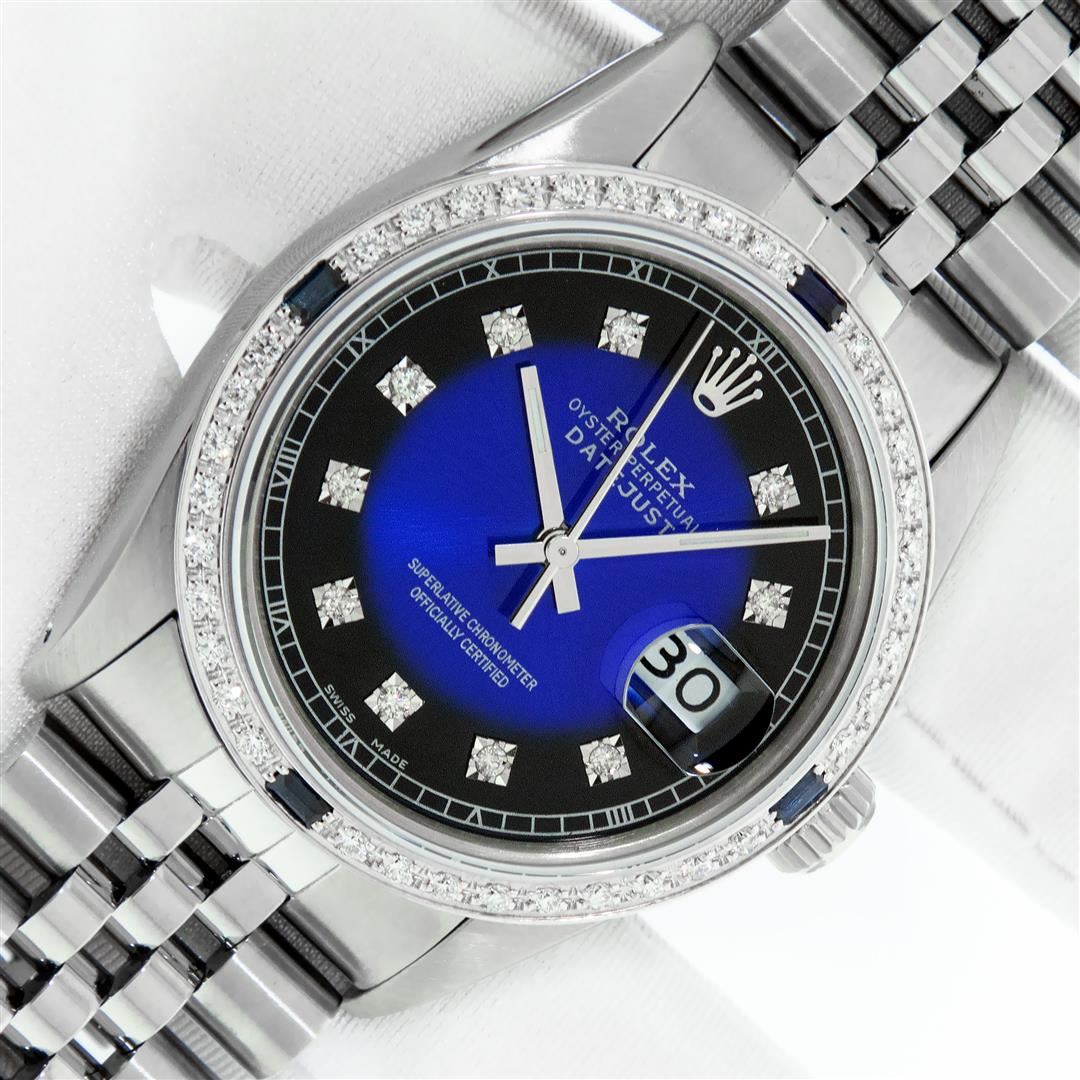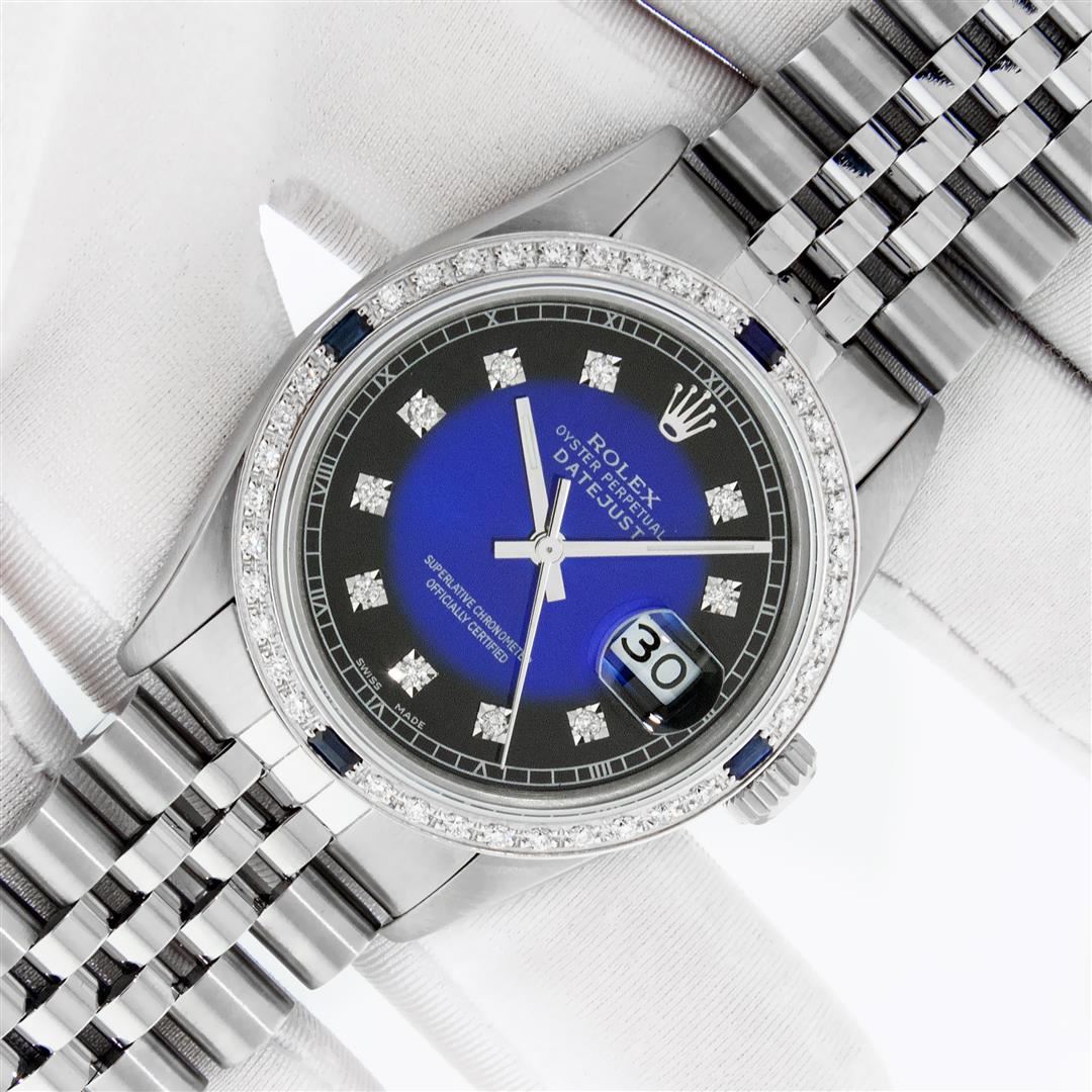 One Mens Stainless Steel Rolex Datejust Polished, Serviced & Electronically Tested, Stainless Steel Case: 36mm, Stainless Steel Crown, Custom Bezel: New 18K White Gold Sapphire Beadset Diamond Bezel, Diamond + Gem Count: 36 Diamonds + 4 Sapphires Total We