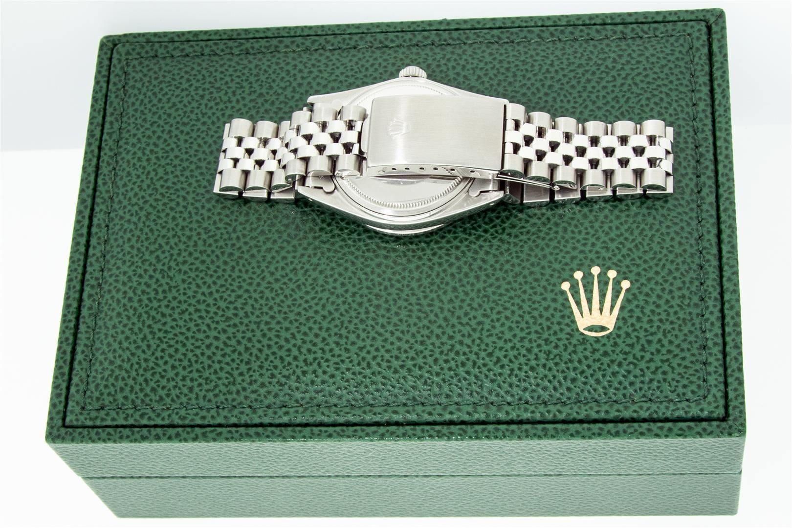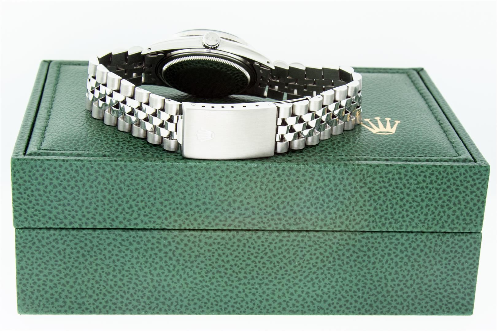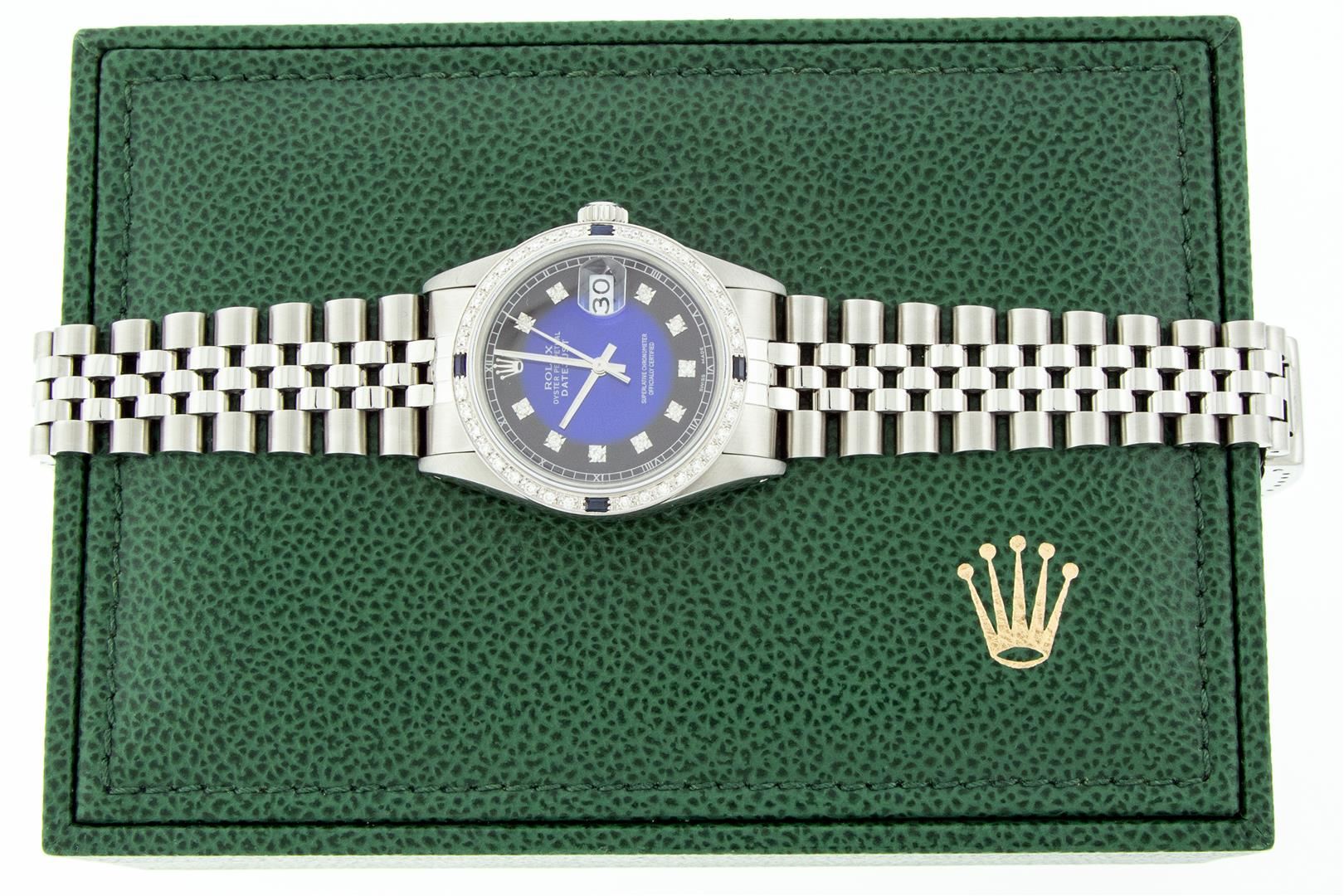One Mens Stainless Steel Rolex Datejust Polished, Serviced & Electronically Tested, Stainless Steel Case: 36mm, Stainless Steel Crown, Custom Bezel: New 18K White Gold Sapphire Beadset Diamond Bezel, Diamond + Gem Count: 36 Diamonds + 4 Sapphires Total We