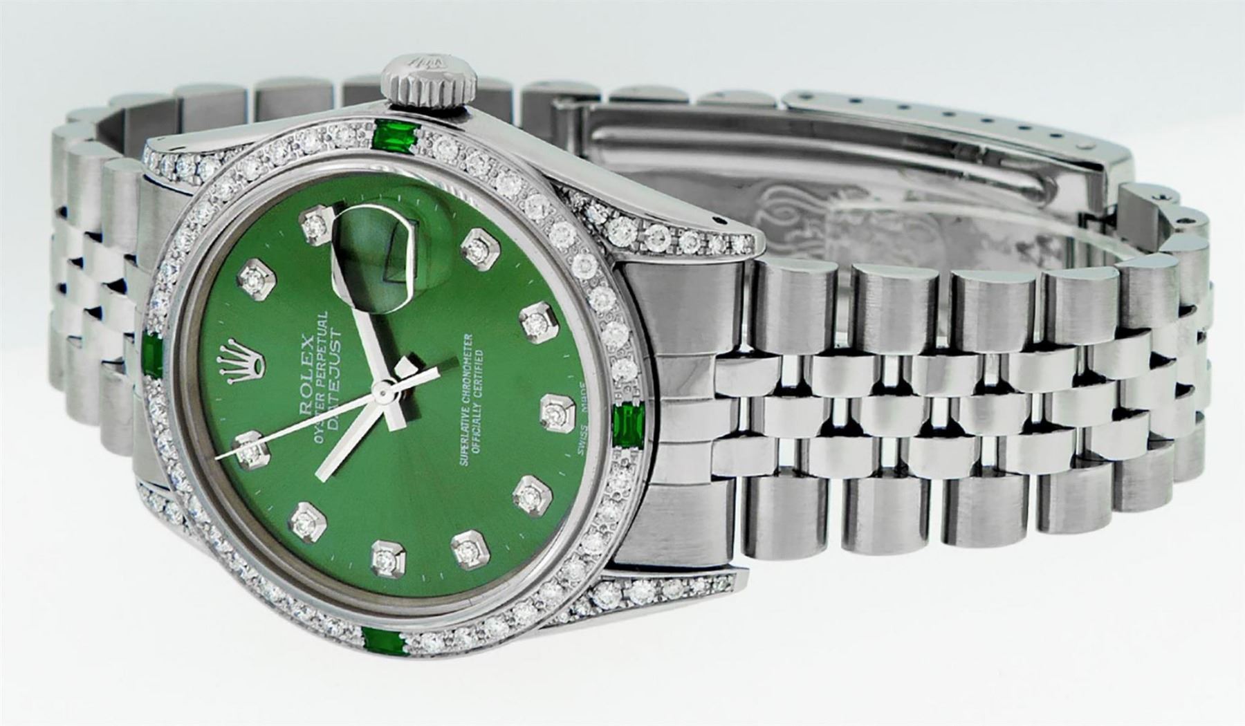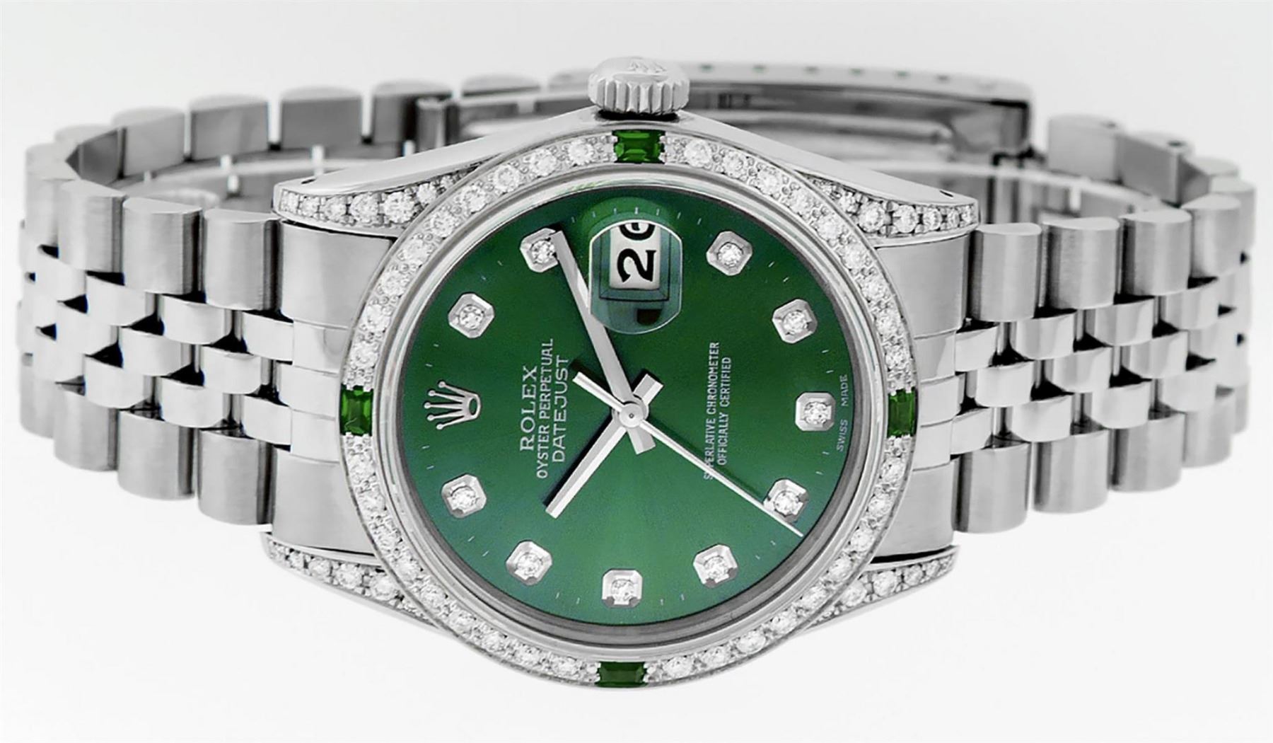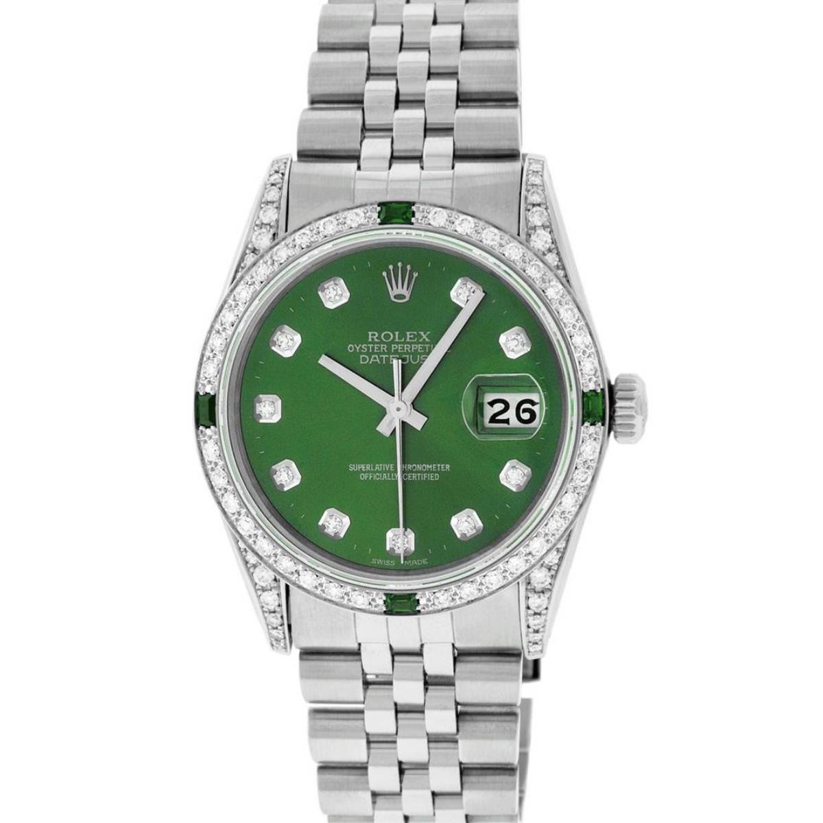 One Mens Rolex Datejust Polished Bright with Satin Finish, Serviced & Electronically Tested, Stainless Steel Case: 36mm, Custom Diamond Lugs: 28 Diamonds In Lugs, Color: G to H, Clarity: SI-VS. Stainless Steel Crown, Custom Bezel: 18K White Gold Diamond + Emerald Beadset, Diamond Count: 36 Diamonds + 4 Emeralds, Total Weight 1.00 Carat, Clarity: SI-VS, Color: G to H. Custom Crystal: New Scratch Resistant Synthetic Sapphire Cyclops Lens. Custom Hands: New Luminescent Hands. Movement: Automatic Winding Movement Caliber 3035. Custom Dial: Green Diamond Dial With Dash Track, Stone Count: 10 Diamonds, Diamond Color: G To H In Color, Clarity: SI-VS. Date Window: 3 O'Clock Position Date Display, Quickset, Model: Datejust Condition: G-6 Extra Fine. Bracelet: Stainless Steel Jubilee Band. Bright Polish & Satin Finish. 7.0 Inch Length, Adjustable. Standard Clasp, With Rolex Logo. This Watch Has Been Serviced And Polished And Its Free Of All Dents And Scratches.