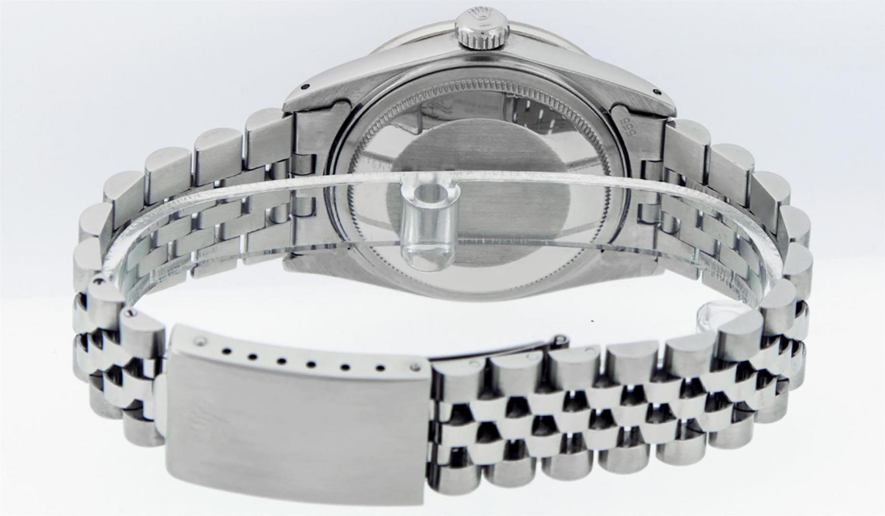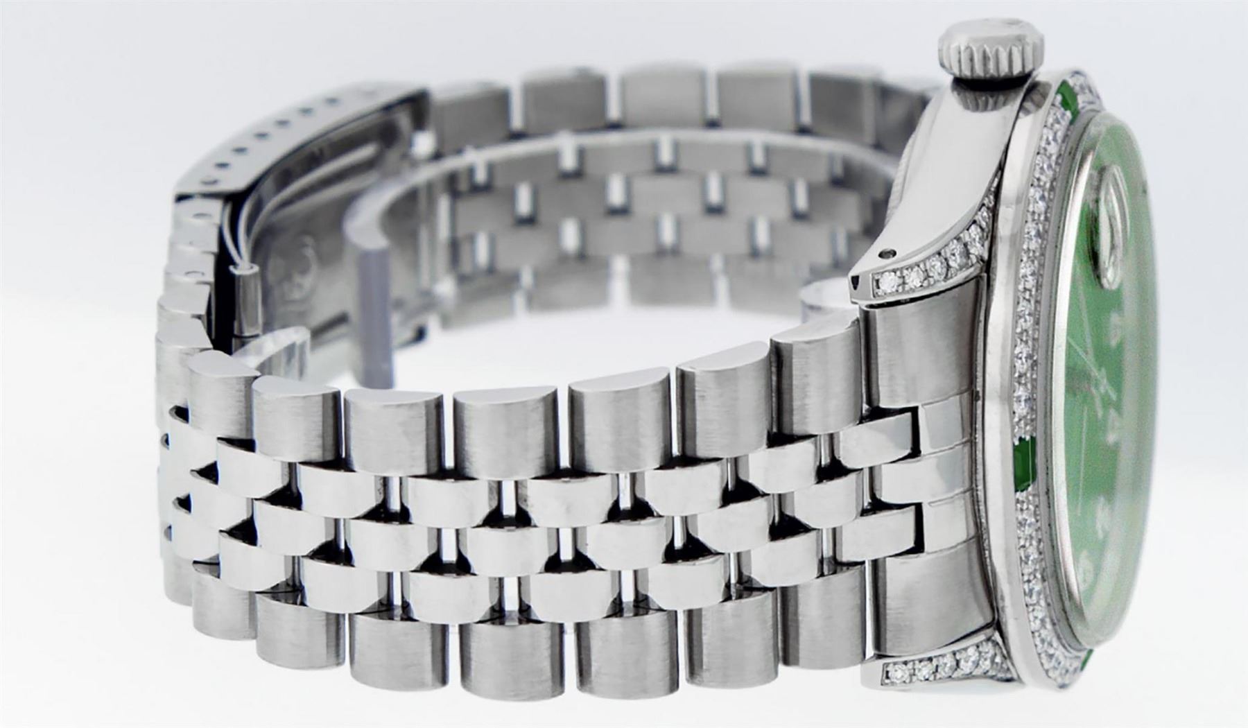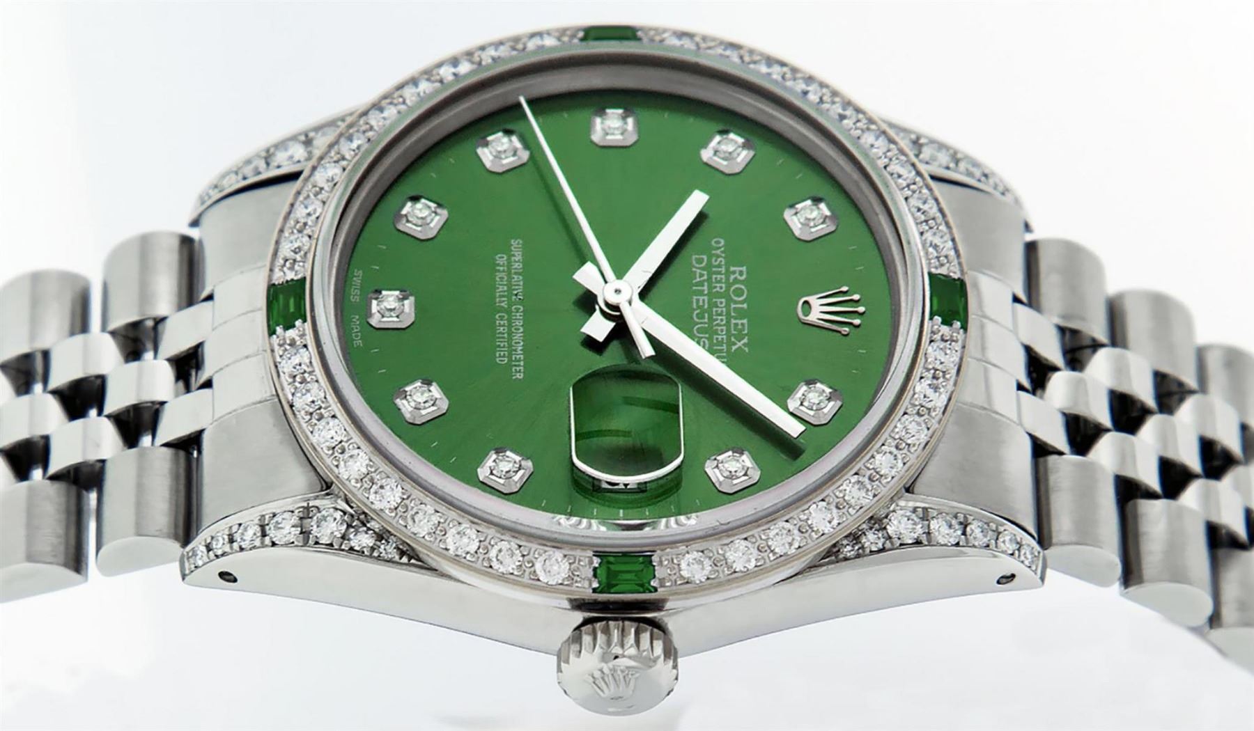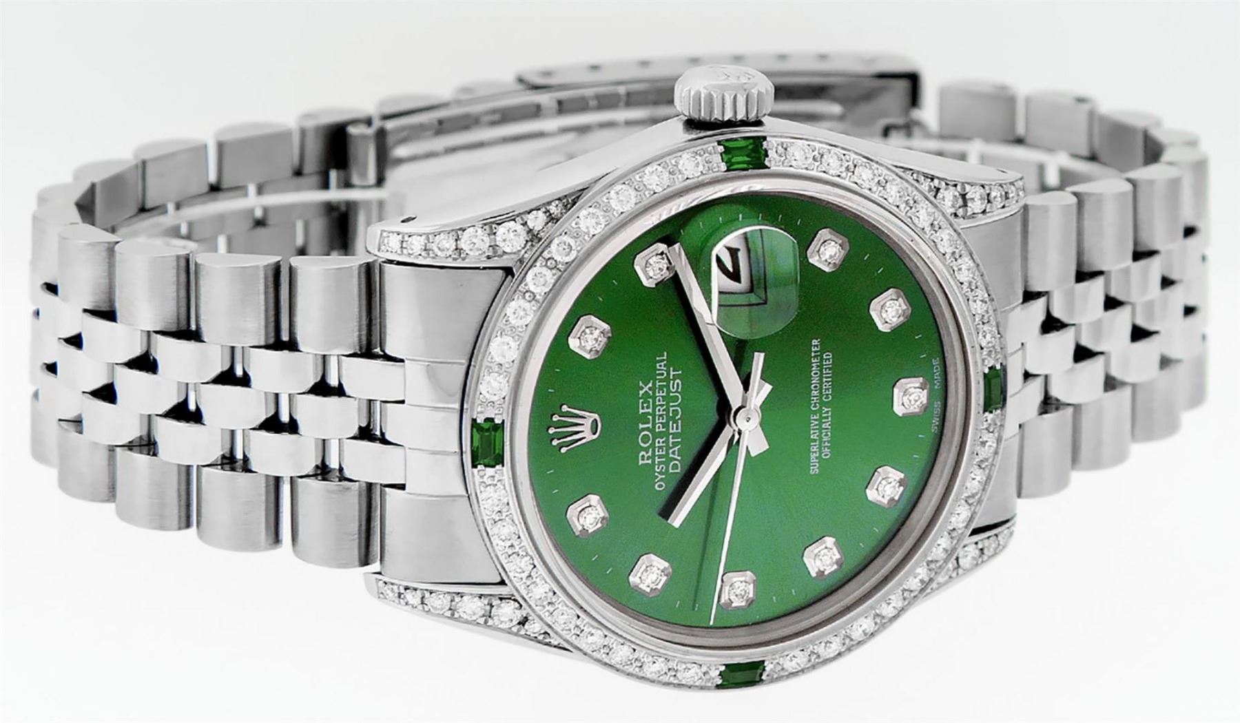 One Mens Rolex Datejust Polished Bright with Satin Finish, Serviced & Electronically Tested, Stainless Steel Case: 36mm, Custom Diamond Lugs: 28 Diamonds In Lugs, Color: G to H, Clarity: SI-VS. Stainless Steel Crown, Custom Bezel: 18K White Gold Diamond + Emerald Beadset, Diamond Count: 36 Diamonds + 4 Emeralds, Total Weight 1.00 Carat, Clarity: SI-VS, Color: G to H. Custom Crystal: New Scratch Resistant Synthetic Sapphire Cyclops Lens. Custom Hands: New Luminescent Hands. Movement: Automatic Winding Movement Caliber 3035. Custom Dial: Green Diamond Dial With Dash Track, Stone Count: 10 Diamonds, Diamond Color: G To H In Color, Clarity: SI-VS. Date Window: 3 O'Clock Position Date Display, Quickset, Model: Datejust Condition: G-6 Extra Fine. Bracelet: Stainless Steel Jubilee Band. Bright Polish & Satin Finish. 7.0 Inch Length, Adjustable. Standard Clasp, With Rolex Logo. This Watch Has Been Serviced And Polished And Its Free Of All Dents And Scratches.