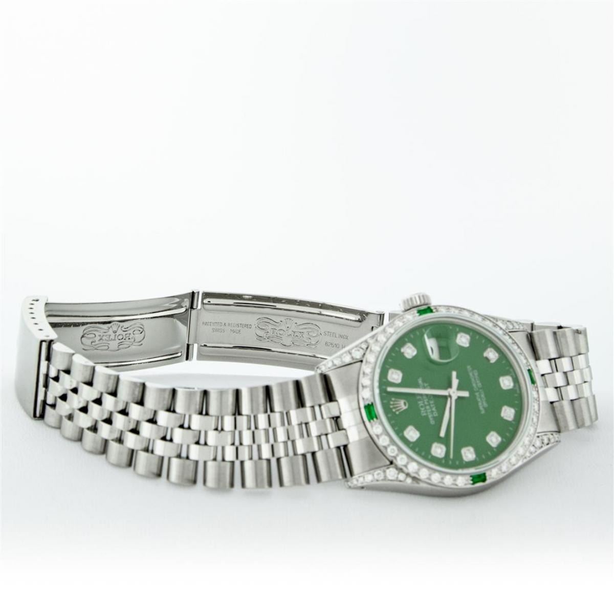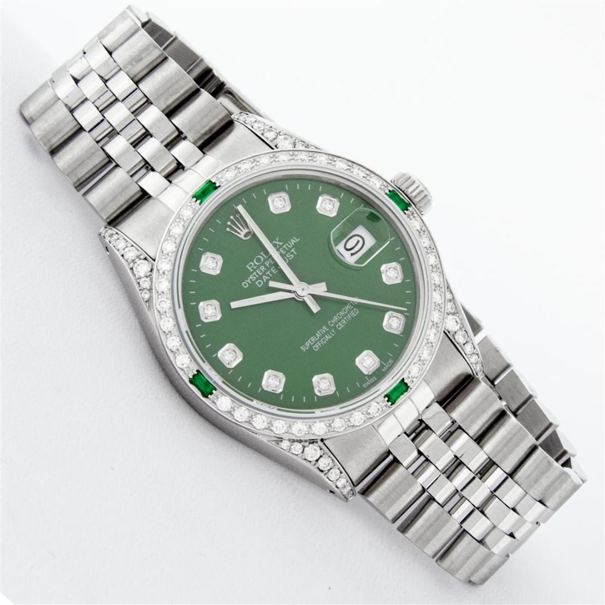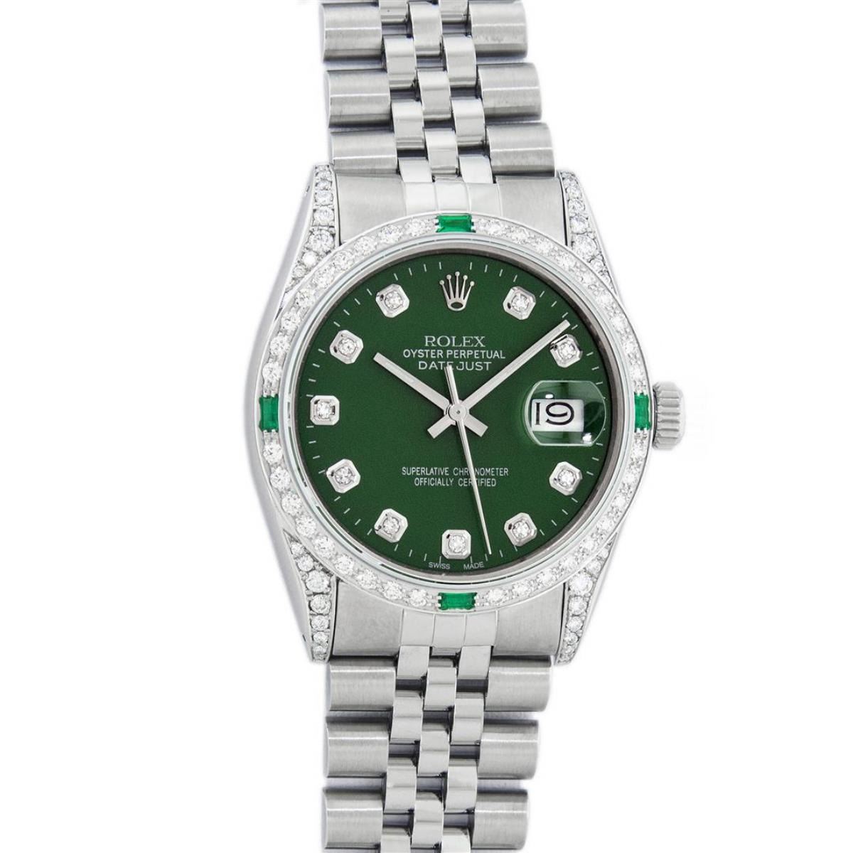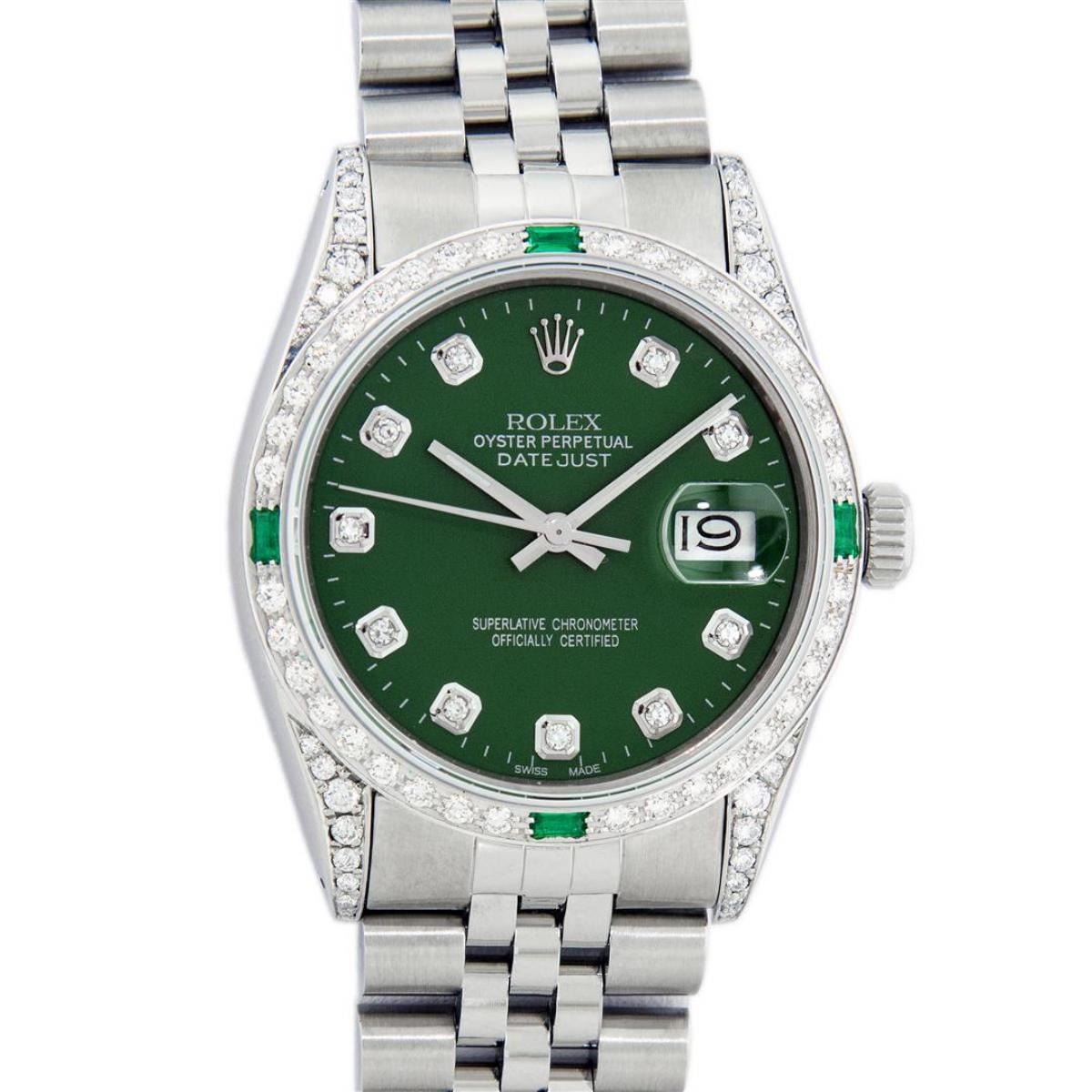 One Mens Rolex Datejust Polished Bright with Satin Finish, Serviced & Electronically Tested, Stainless Steel Case: 36mm, Custom Diamond Lugs: 28 Diamonds On Lugs, Color: G to H, Clarity: SI-VS. Stainless Steel Crown, Custom Bezel: 18K White Gold Diamond + Emerald Beadset, Diamond Count: 36 Diamonds + 4 Emeralds, Total Weight 1.00 Carat, Clarity: SI-VS, Color: G to H. Custom Crystal: New Scratch Resistant Synthetic Sapphire Cyclops Lens. Custom Hands: New Luminescent Hands. Movement: Automatic Winding Movement Caliber 3035. Custom Dial: Green Diamond Dial With Dash Track, Stone Count: 10 Diamonds, Diamond Color: G To H In Color, Clarity: SI-VS. Date Window: 3 O'Clock Position Date Display, Quickset, Model: Datejust Condition: G-6 Extra Fine. Bracelet: Stainless Steel Jubilee Band. Bright Polish & Satin Finish. 7.0 Inch Length, Adjustable. Standard Clasp, With Rolex Logo. This Watch Has Been Serviced And Polished And Its Free Of All Dents And Scratches.