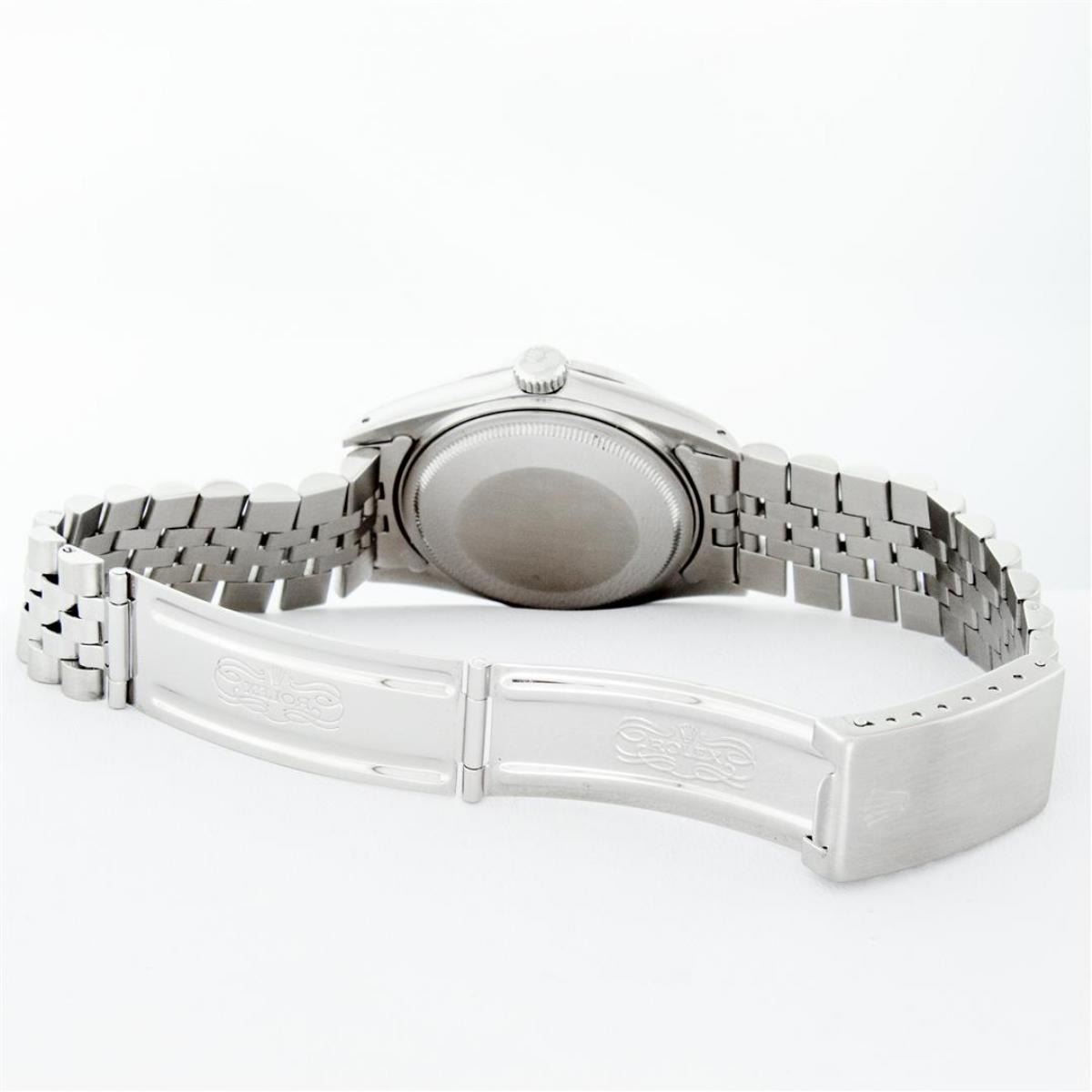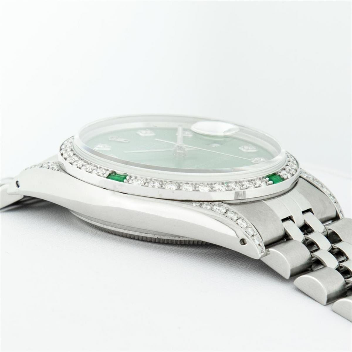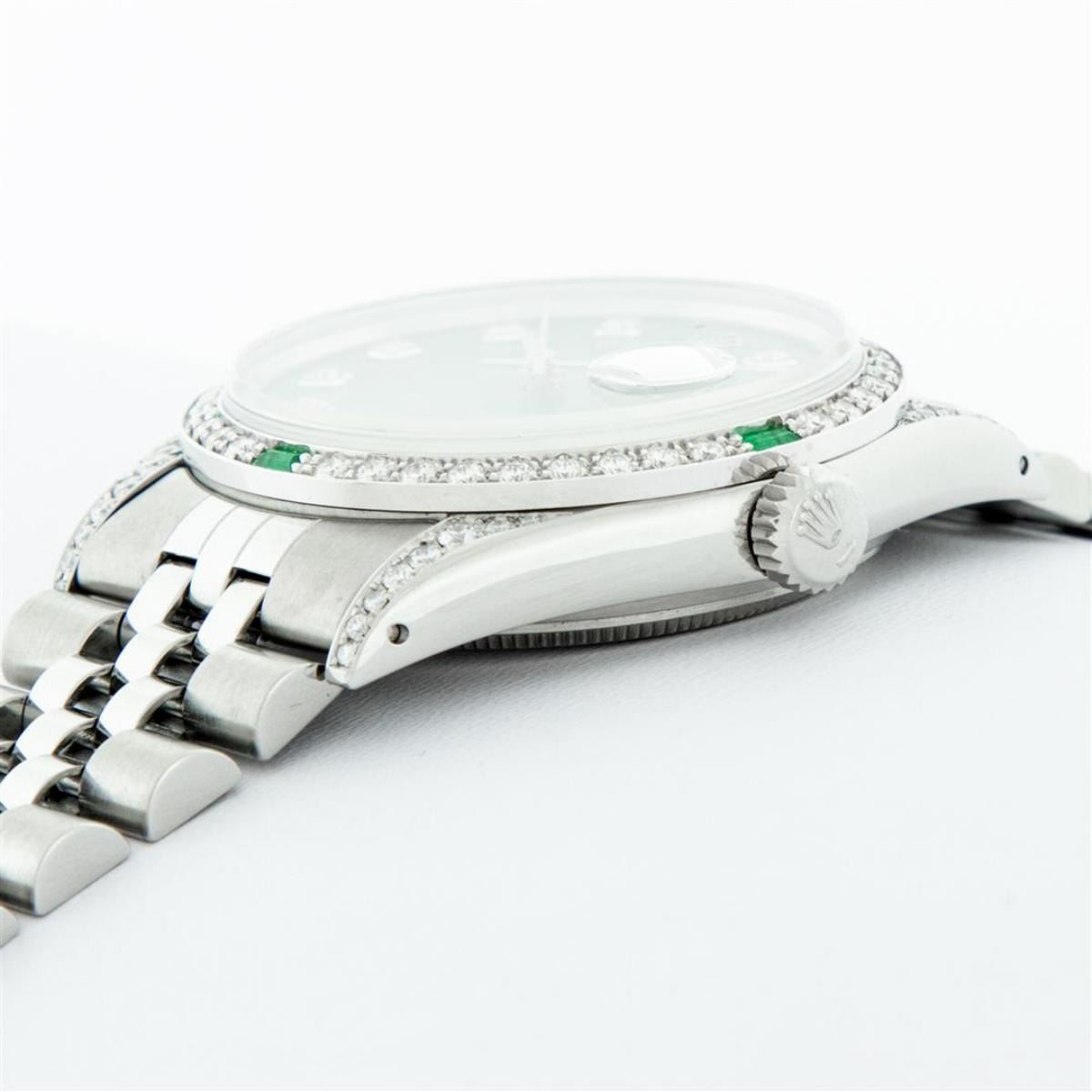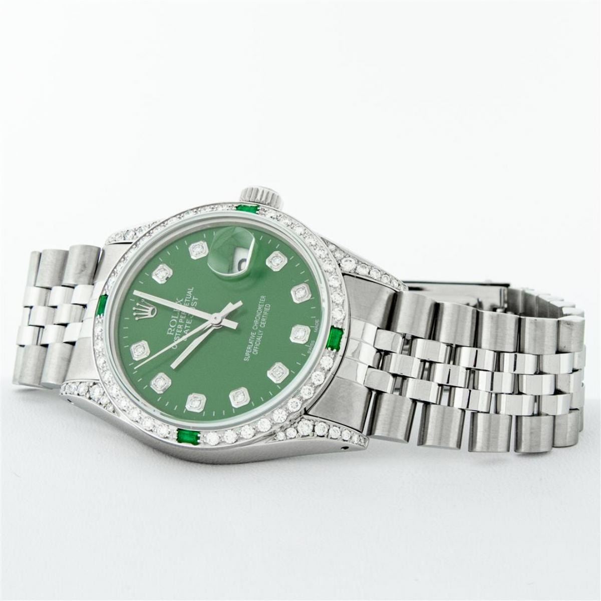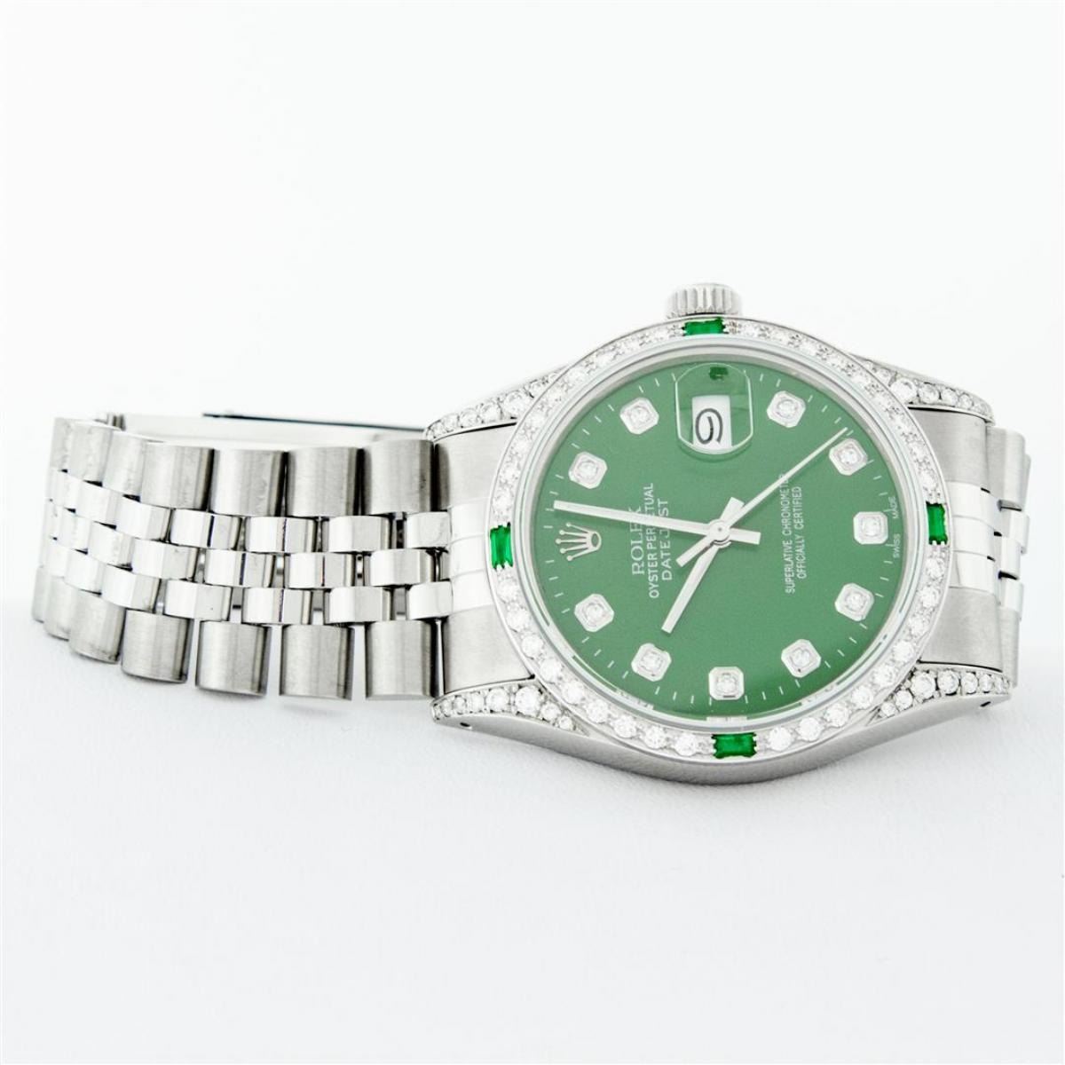 One Mens Rolex Datejust Polished Bright with Satin Finish, Serviced & Electronically Tested, Stainless Steel Case: 36mm, Custom Diamond Lugs: 28 Diamonds On Lugs, Color: G to H, Clarity: SI-VS. Stainless Steel Crown, Custom Bezel: 18K White Gold Diamond + Emerald Beadset, Diamond Count: 36 Diamonds + 4 Emeralds, Total Weight 1.00 Carat, Clarity: SI-VS, Color: G to H. Custom Crystal: New Scratch Resistant Synthetic Sapphire Cyclops Lens. Custom Hands: New Luminescent Hands. Movement: Automatic Winding Movement Caliber 3035. Custom Dial: Green Diamond Dial With Dash Track, Stone Count: 10 Diamonds, Diamond Color: G To H In Color, Clarity: SI-VS. Date Window: 3 O'Clock Position Date Display, Quickset, Model: Datejust Condition: G-6 Extra Fine. Bracelet: Stainless Steel Jubilee Band. Bright Polish & Satin Finish. 7.0 Inch Length, Adjustable. Standard Clasp, With Rolex Logo. This Watch Has Been Serviced And Polished And Its Free Of All Dents And Scratches.