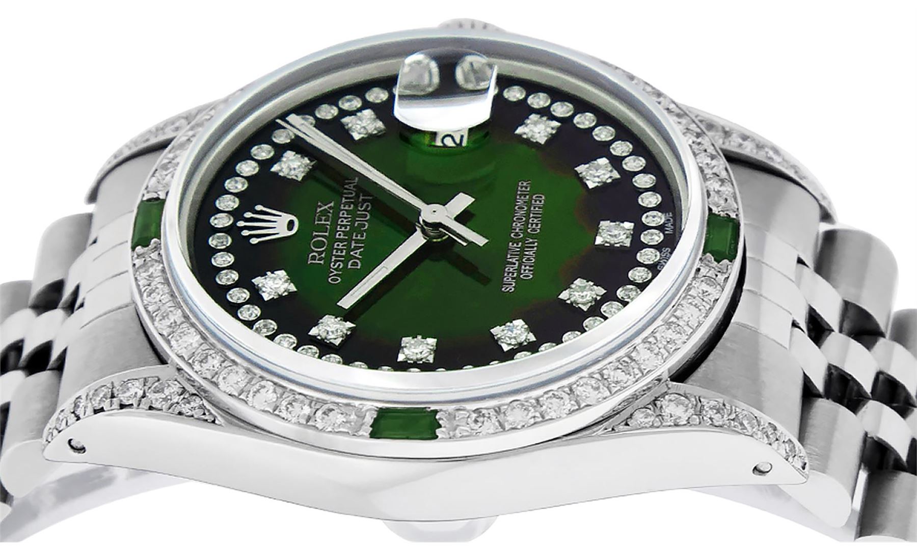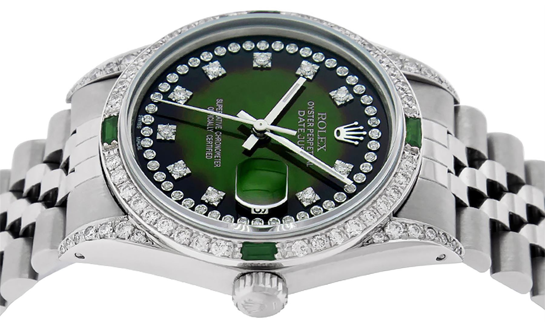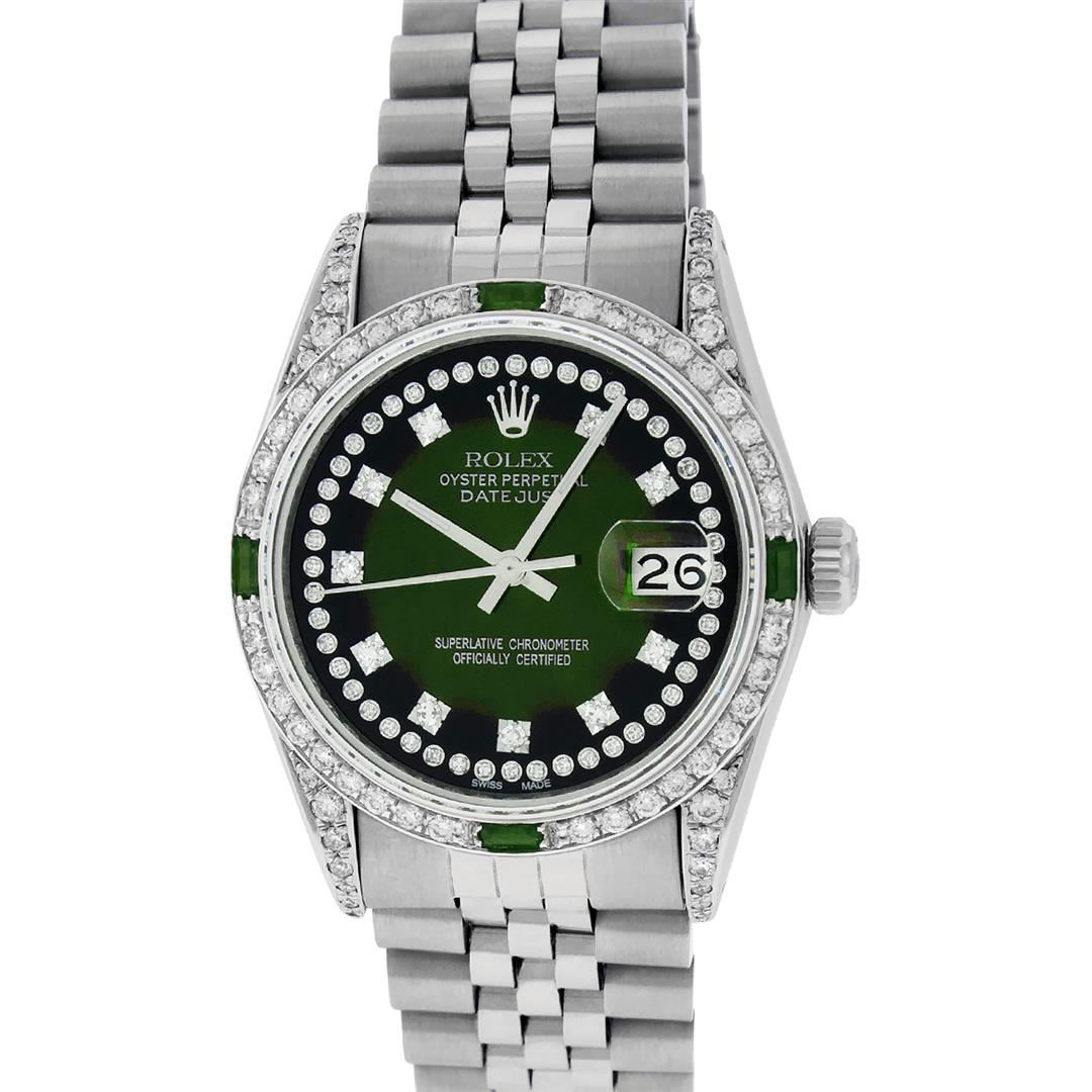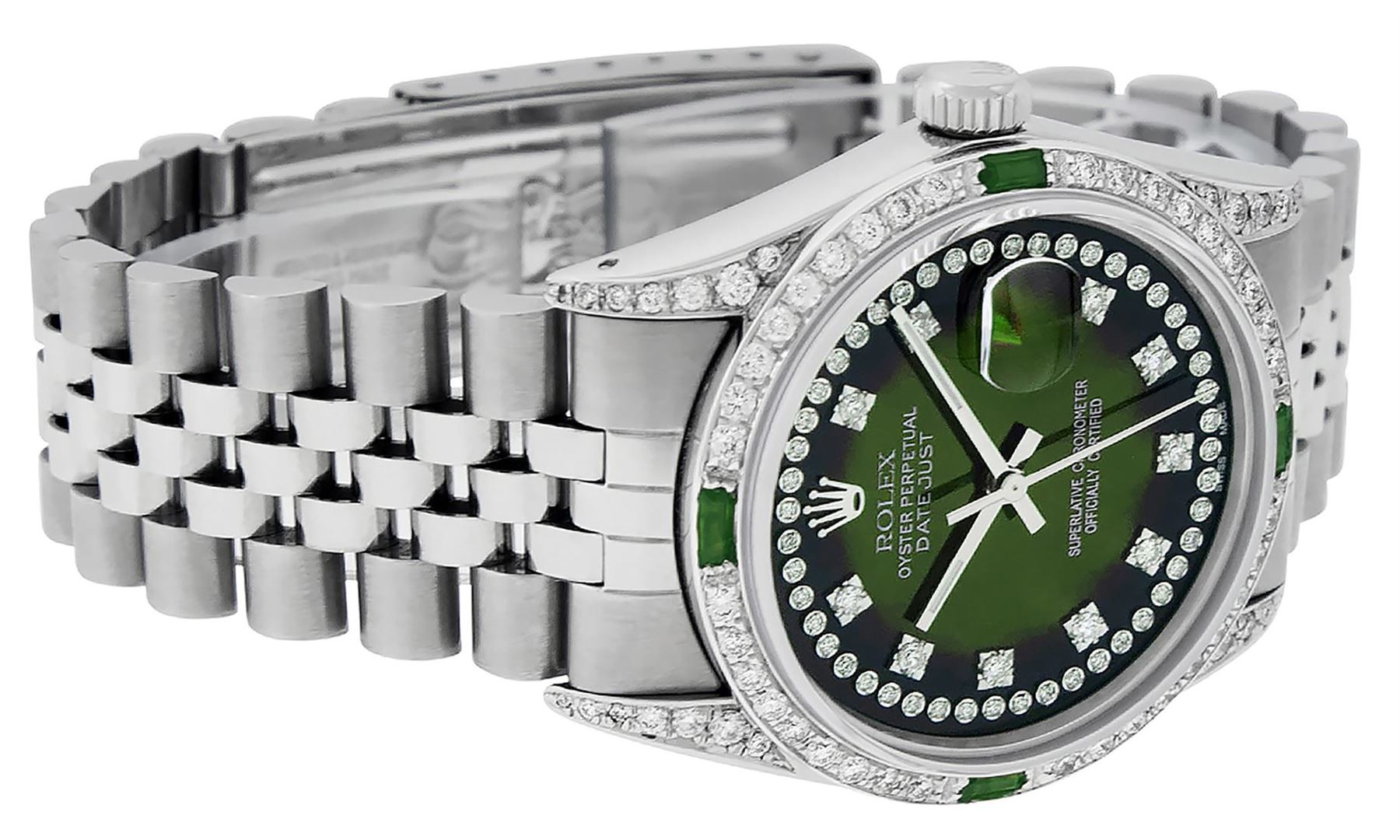 One Mens Rolex Datejust Polished Bright with Satin Finish, Serviced & Electronically Tested, Stainless Steel Case: 36mm, Custom Diamond Lugs: 28 Diamonds In Lugs, Color: G to H, Clarity: SI-VS. Stainless Steel Crown, Custom Bezel: 18K White Gold Diamond + Emerald Beadset, Diamond Count: 36 Diamonds + 4 Emeralds, Total Weight 1.00 Carat, Clarity: SI-VS, Color: G to H. Custom Crystal: New Scratch Resistant Synthetic Sapphire Cyclops Lens. Custom Hands: New Luminescent Hands. Movement: Automatic Winding Movement Caliber 3035. Custom Dial: Green Vignette String Diamond Dial, Stone Count: 58 Diamonds In Dial, Diamond Color: G To H In Color, Clarity: SI-VS. Date Window: 3 O'Clock Position Date Display, Quickset, Model: Datejust Condition: G-6 Extra Fine. Bracelet: Stainless Steel Jubilee Band. Bright Polish & Satin Finish. 7.0 Inch Length, Adjustable. Standard Clasp, With Rolex Logo. This Watch Has Been Serviced And Polished And Its Free Of All Dents And Scratches.