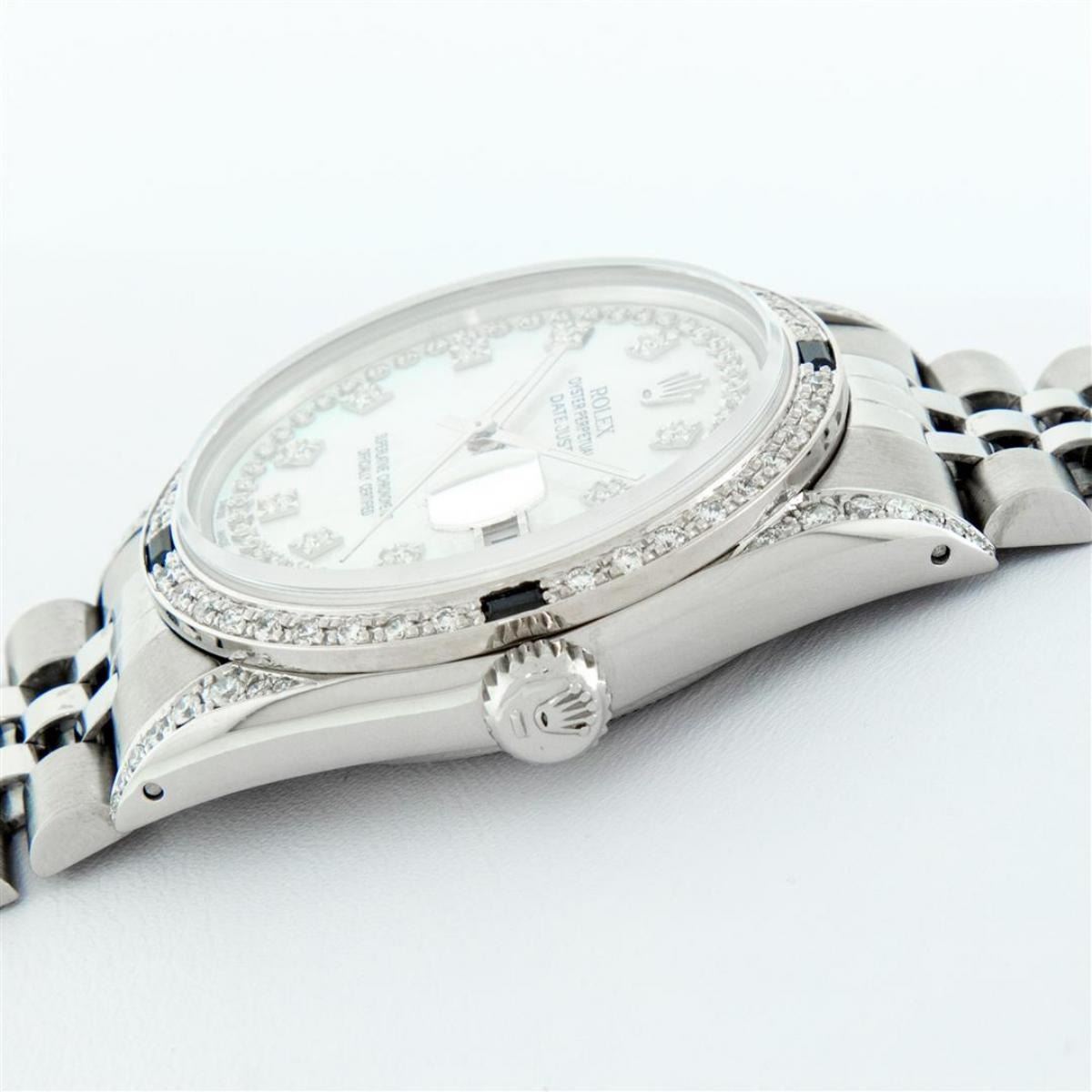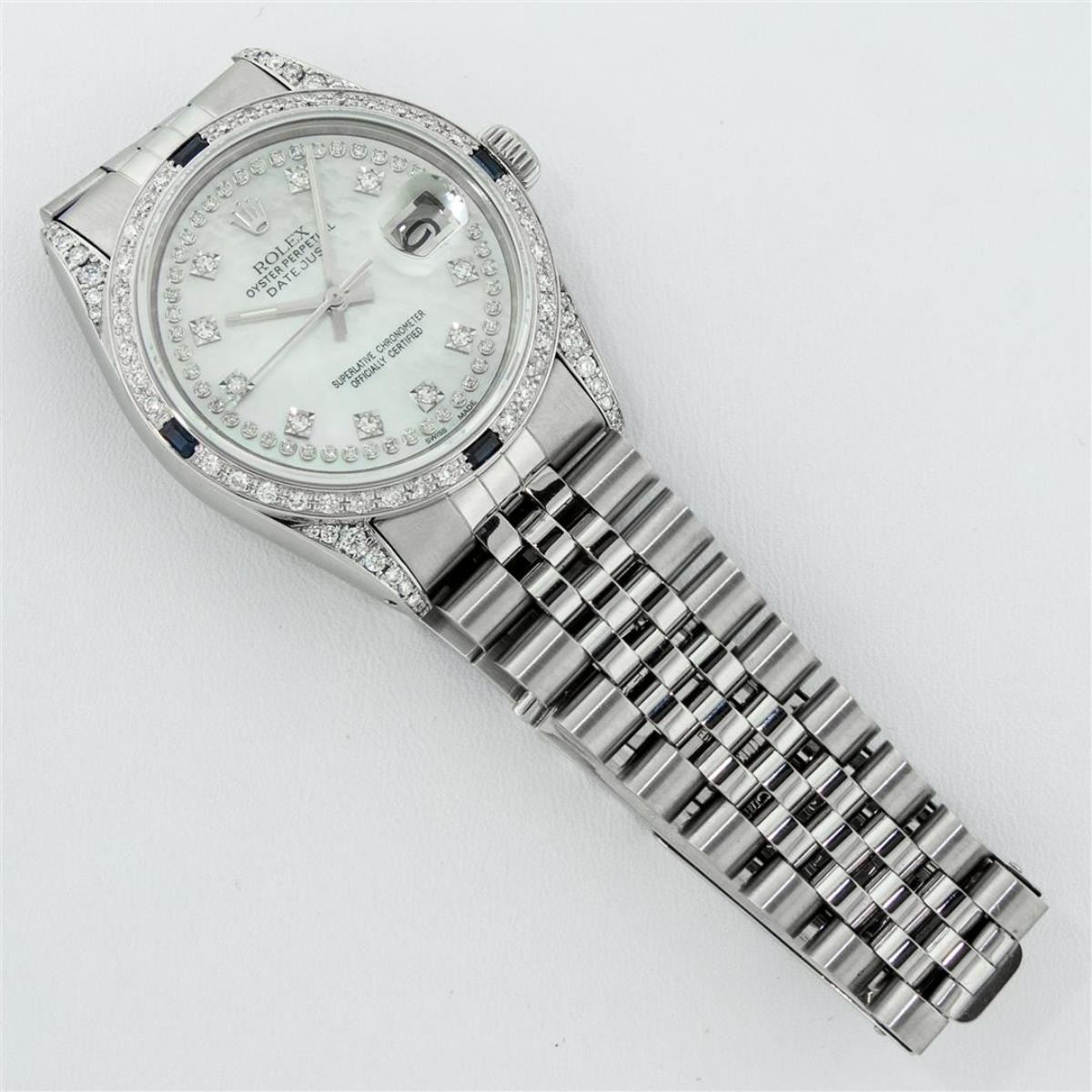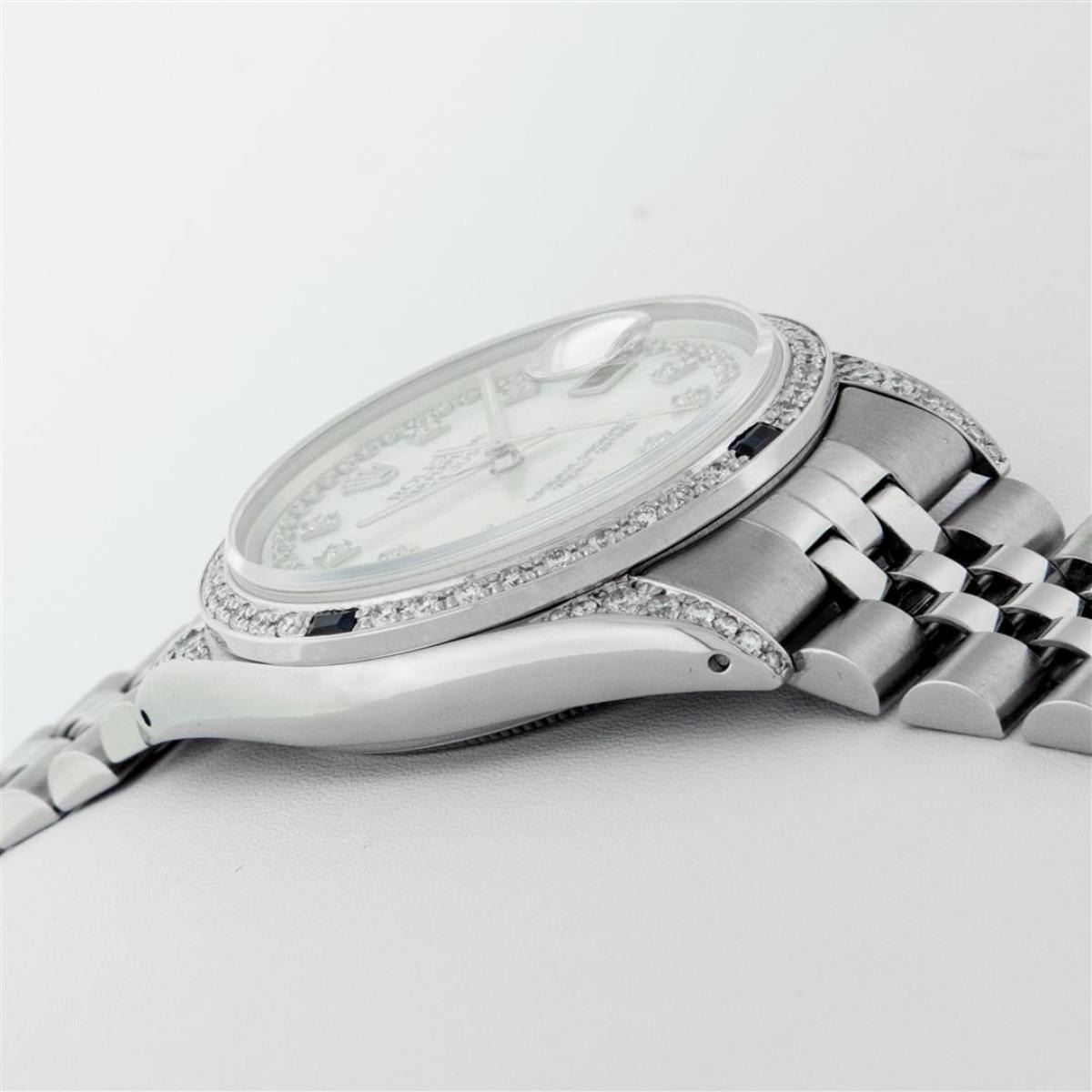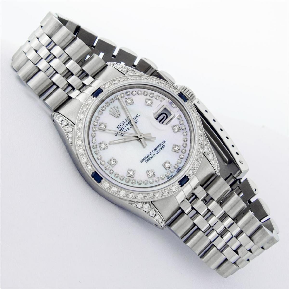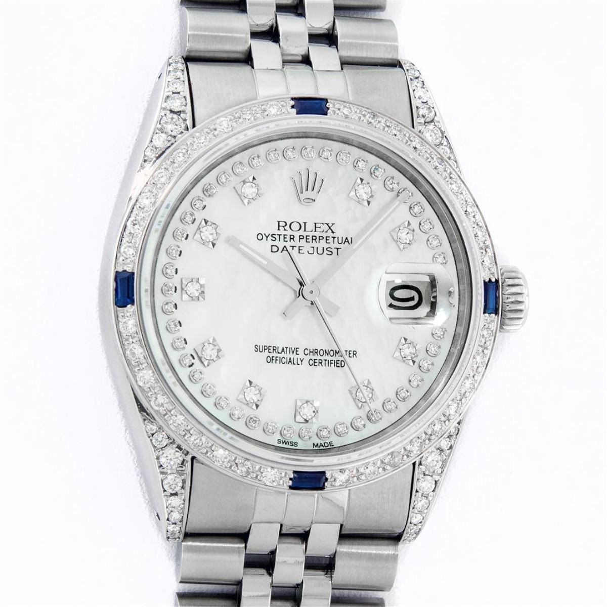One Mens Rolex Datejust Polished Bright with Satin Finish, Serviced & Electronically Tested, Stainless Steel Case: 36mm, Custom Diamond Lugs: 28 Diamonds In Lugs, Color: G to H, Clarity: SI-VS. Stainless Steel Crown, New Custom Bezel: 18K White Gold Diamond + Sapphire Beadset, Diamond Count: 36 Diamonds + 4 Sapphires, Total Weight 1.00 Carat, Clarity: SI-VS, Color: G to H. Custom Crystal: New Scratch Resistant Synthetic Sapphire Cyclops Lens. Custom Hands: New Luminescent Hands. Movement: Automatic Winding Movement Caliber 3035. Custom Dial: Single Cut Mother Of Pearl String Diamond Dial, Stone Count: 58 Diamonds In Dial, Diamond Color: G To H In Color, Clarity: VS. Date Window: 3 O'Clock Position Date Display, Quickset, Model: Datejust Condition: G-6 Extra Fine. Bracelet: Stainless Steel Jubilee Band. Bright Polish & Satin Finish. 7.0 Inch Length, Adjustable. Standard Clasp, With Rolex Logo. This Watch Has Been Serviced And Polished And Its Free Of All Dents And Scratches.