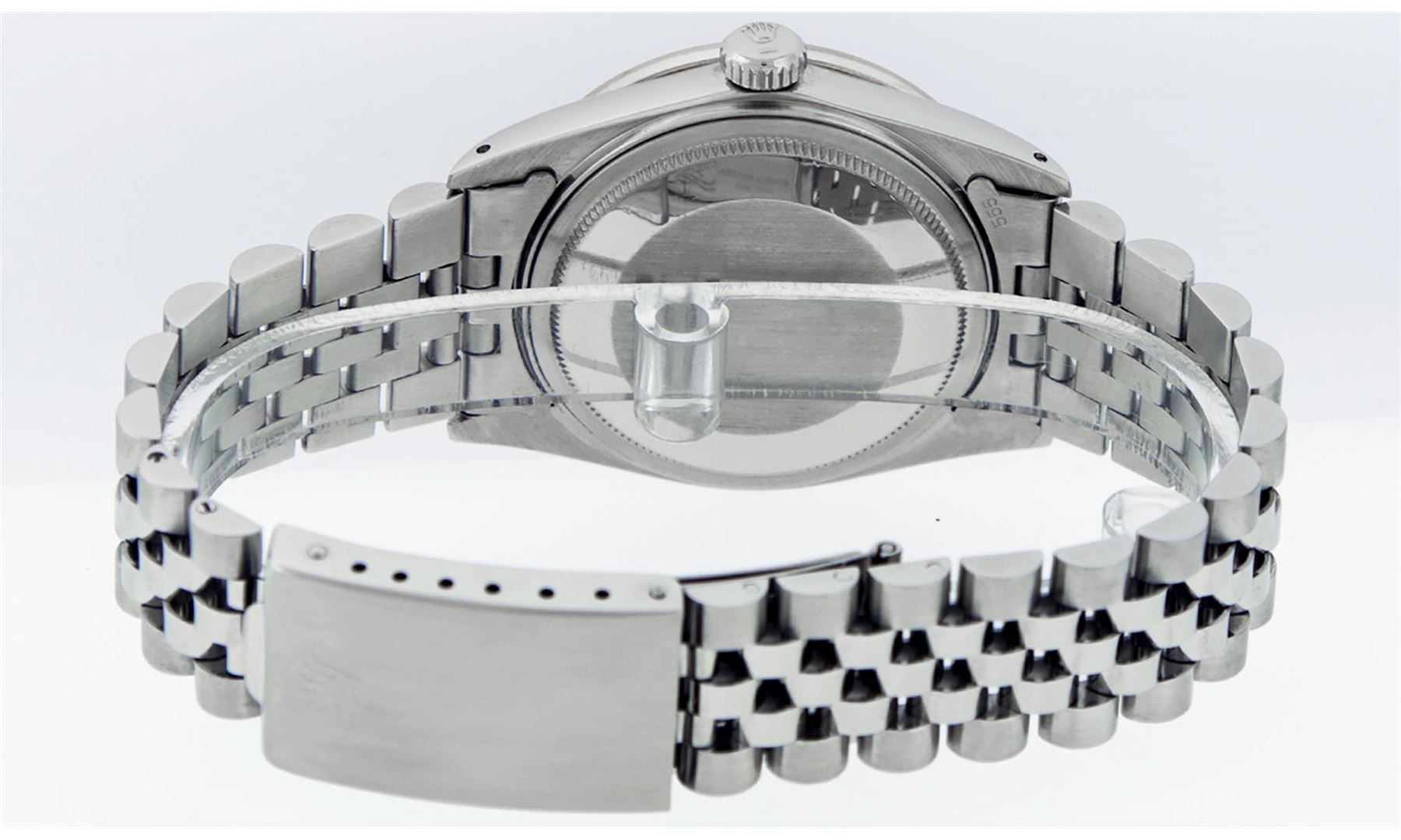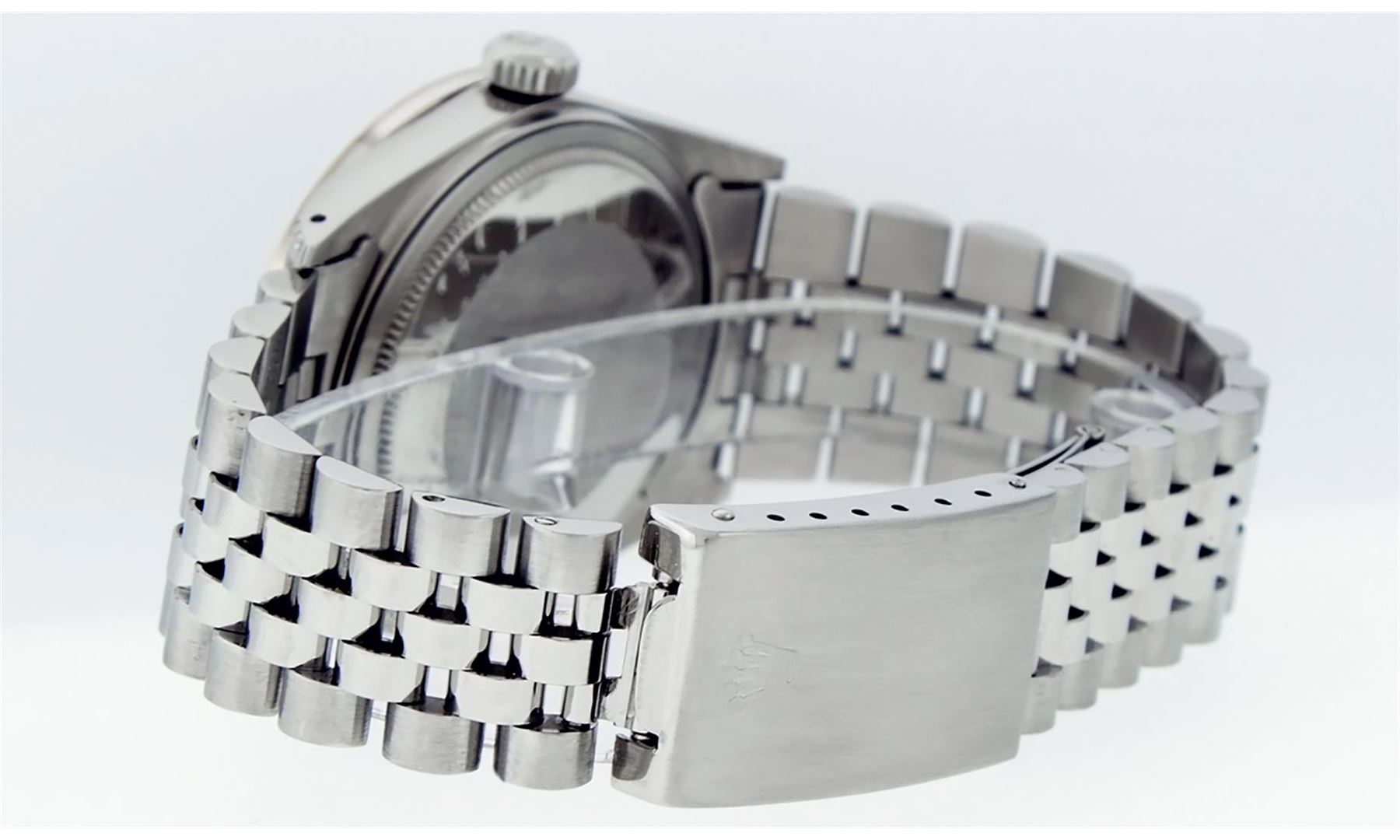 One Mens Rolex Datejust Polished Bright with Satin Finish, Serviced & Electronically Tested, Stainless Steel Case: 36mm, Custom Diamond Lugs: 28 Diamonds In Lugs, Color: G to H, Clarity: SI-VS. Stainless Steel Crown, New Custom Bezel: 18K White Gold Diamond + Sapphire Beadset, Diamond Count: 36 Diamonds + 4 Sapphires, Total Weight 1.00 Carat, Clarity: SI-VS, Color: G to H. Custom Crystal: New Scratch Resistant Synthetic Sapphire Cyclops Lens. Custom Hands: New Luminescent Hands. Movement: Automatic Winding Movement Caliber 3035. Custom Dial: Single Cut Mother Of Pearl String Diamond Dial, Stone Count: 58 Diamonds In Dial, Diamond Color: G To H In Color, Clarity: VS. Date Window: 3 O'Clock Position Date Display, Quickset, Model: Datejust Condition: G-6 Extra Fine. Bracelet: Stainless Steel Jubilee Band. Bright Polish & Satin Finish. 7.0 Inch Length, Adjustable. Standard Clasp, With Rolex Logo. This Watch Has Been Serviced And Polished And Its Free Of All Dents And Scratches.