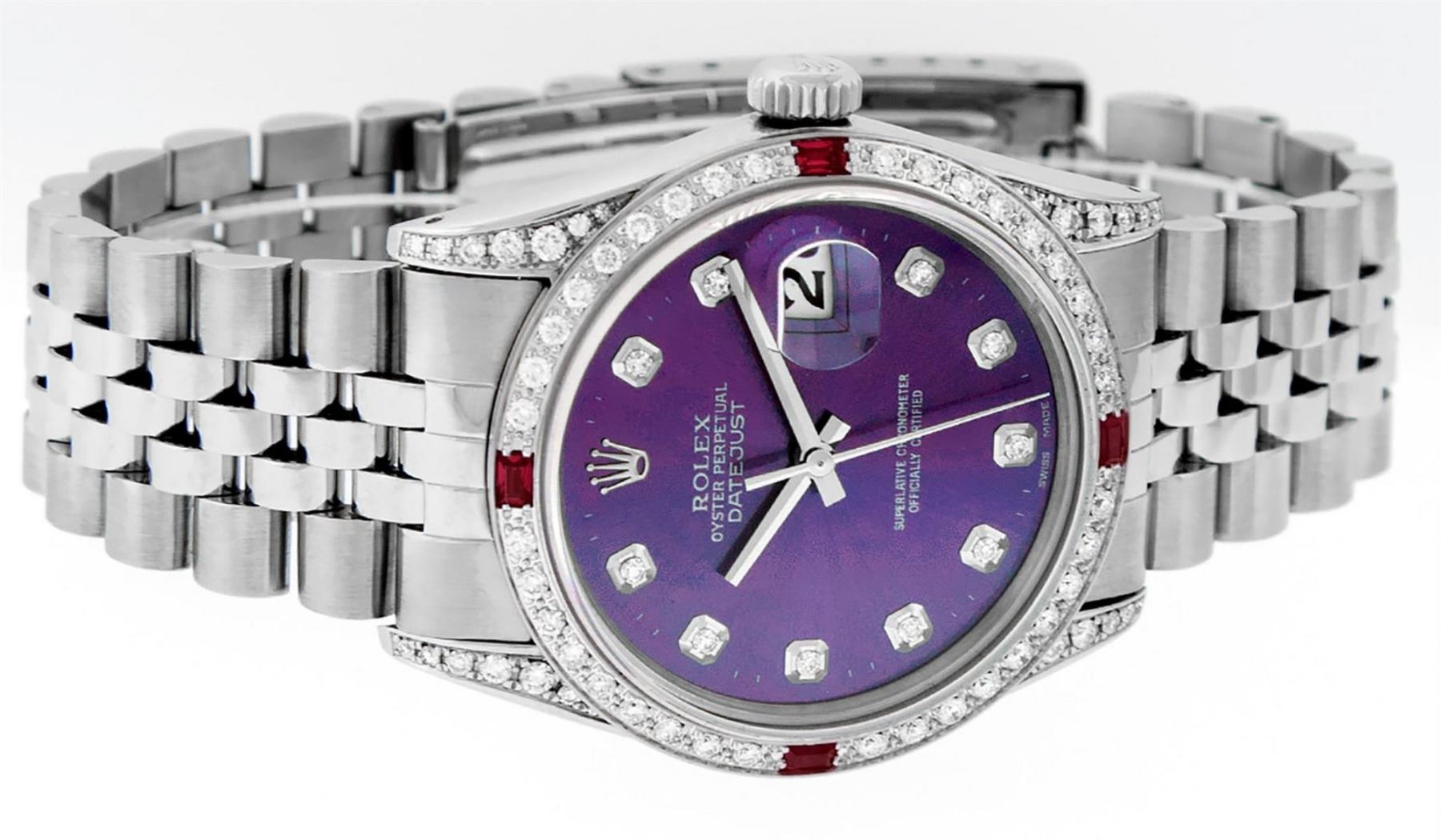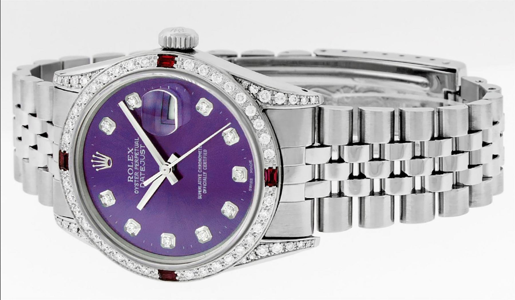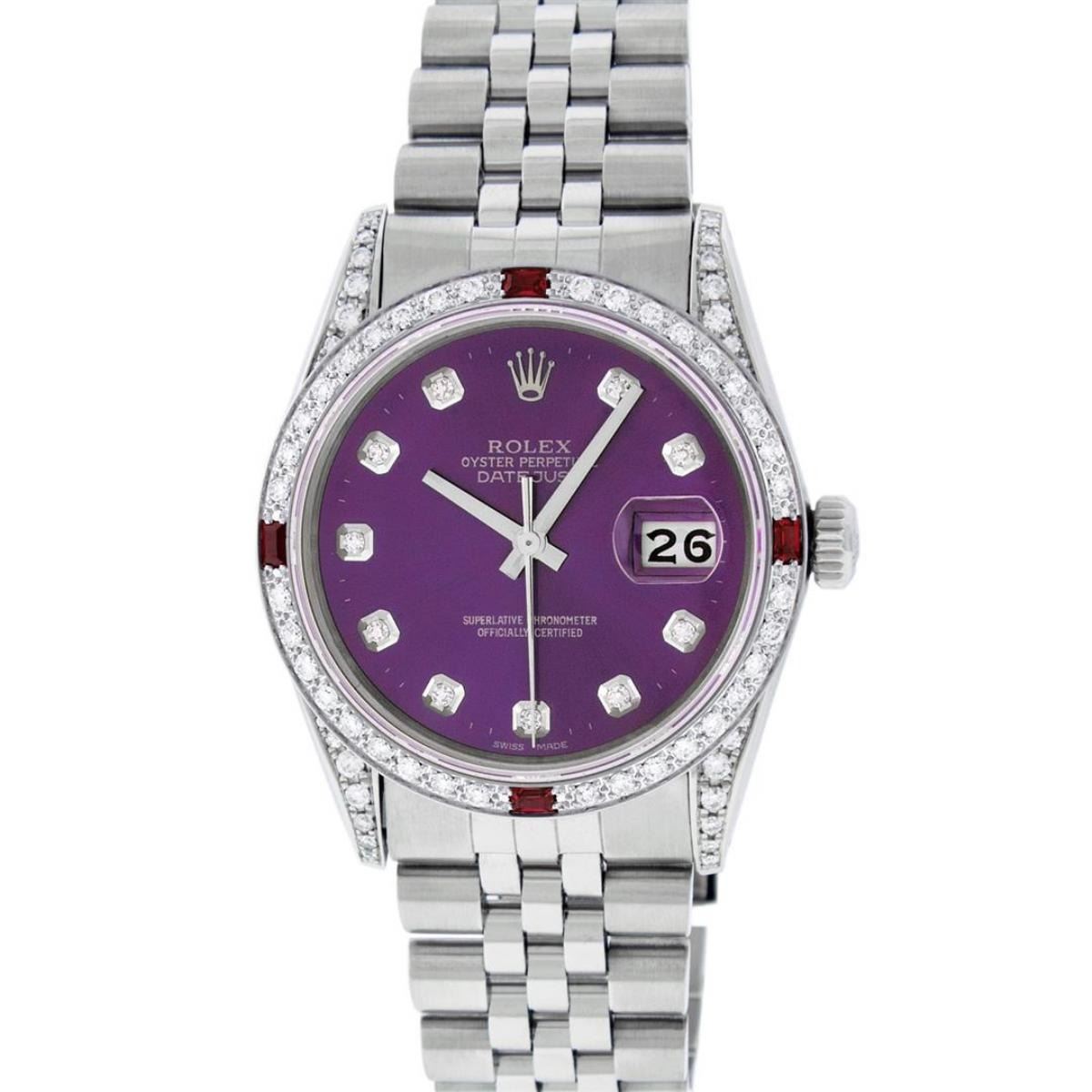 One Mens Rolex Datejust Polished Bright with Satin Finish, Serviced & Electronically Tested, Stainless Steel Case: 36mm, Custom Diamond Lugs: 28 Diamonds In Lugs, Color: G to H, Clarity: SI-VS. Stainless Steel Crown, Custom Bezel: 18K White Gold Diamond + Ruby Beadset, Diamond Count: 36 Diamonds + 4 Rubies, Total Weight 1.00 Carat, Clarity: SI-VS, Color: G to H. Custom Crystal: New Scratch Resistant Synthetic Sapphire Cyclops Lens. Custom Hands: New Luminescent Hands. Movement: Automatic Winding Movement Caliber 3035. Custom Dial: Purple Single Cut Diamond Dial With Dash Track, Stone Count: 10 Diamonds In Dial, Diamond Color: G To H In Color, Clarity: VS. Date Window: 3 O'Clock Position Date Display, Quickset, Model: Datejust Condition: G-6 Extra Fine. Bracelet: Stainless Steel Jubilee Band. Bright Polish & Satin Finish. 7.0 Inch Length, Adjustable. Standard Clasp, With Rolex Logo. This Watch Has Been Serviced And Polished And Its Free Of All Dents And Scratches.