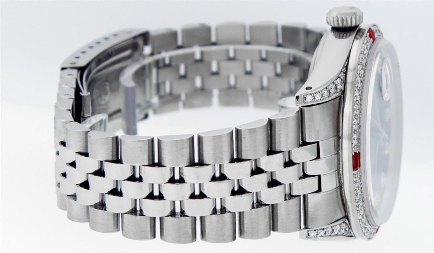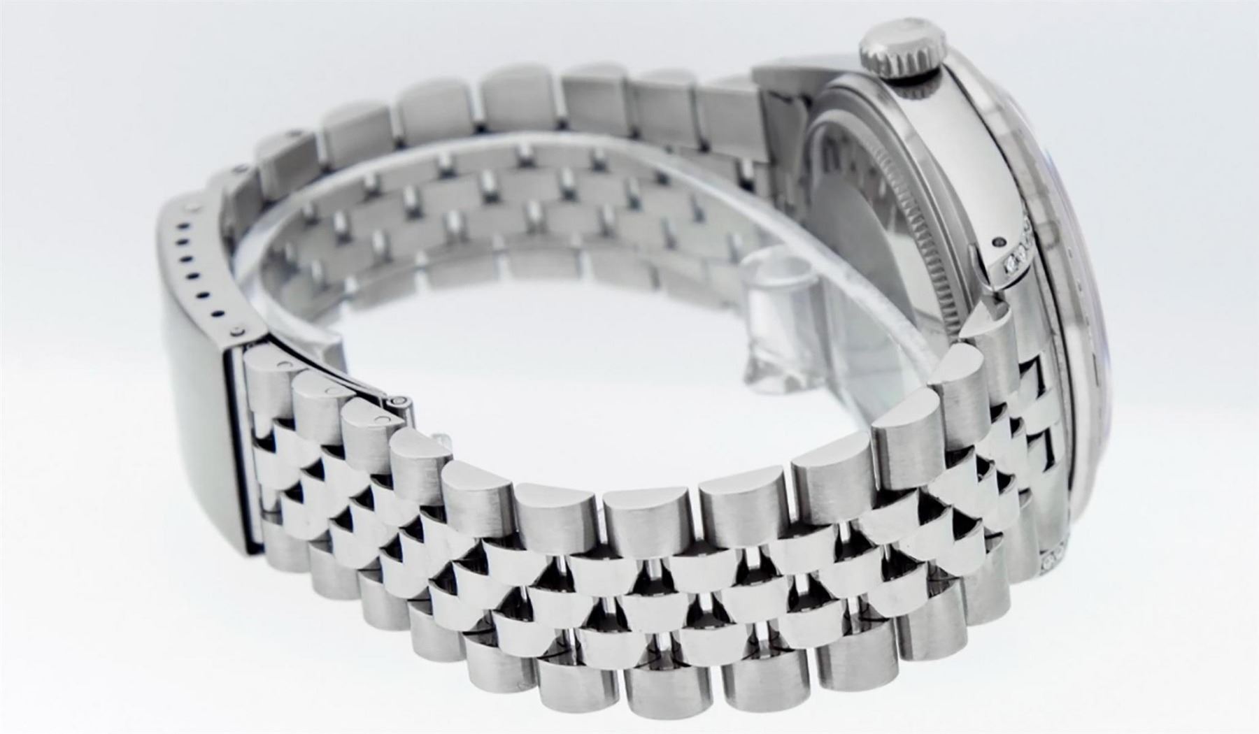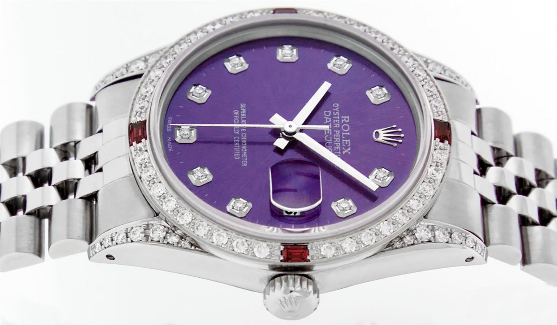 One Mens Rolex Datejust Polished Bright with Satin Finish, Serviced & Electronically Tested, Stainless Steel Case: 36mm, Custom Diamond Lugs: 28 Diamonds In Lugs, Color: G to H, Clarity: SI-VS. Stainless Steel Crown, Custom Bezel: 18K White Gold Diamond + Ruby Beadset, Diamond Count: 36 Diamonds + 4 Rubies, Total Weight 1.00 Carat, Clarity: SI-VS, Color: G to H. Custom Crystal: New Scratch Resistant Synthetic Sapphire Cyclops Lens. Custom Hands: New Luminescent Hands. Movement: Automatic Winding Movement Caliber 3035. Custom Dial: Purple Single Cut Diamond Dial With Dash Track, Stone Count: 10 Diamonds In Dial, Diamond Color: G To H In Color, Clarity: VS. Date Window: 3 O'Clock Position Date Display, Quickset, Model: Datejust Condition: G-6 Extra Fine. Bracelet: Stainless Steel Jubilee Band. Bright Polish & Satin Finish. 7.0 Inch Length, Adjustable. Standard Clasp, With Rolex Logo. This Watch Has Been Serviced And Polished And Its Free Of All Dents And Scratches.