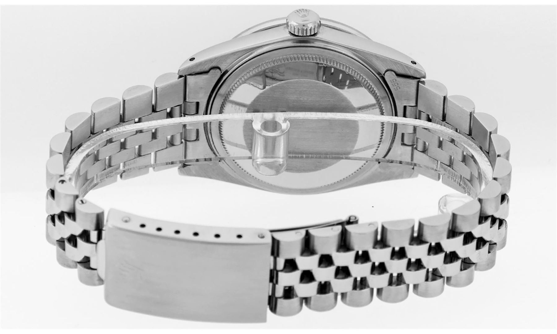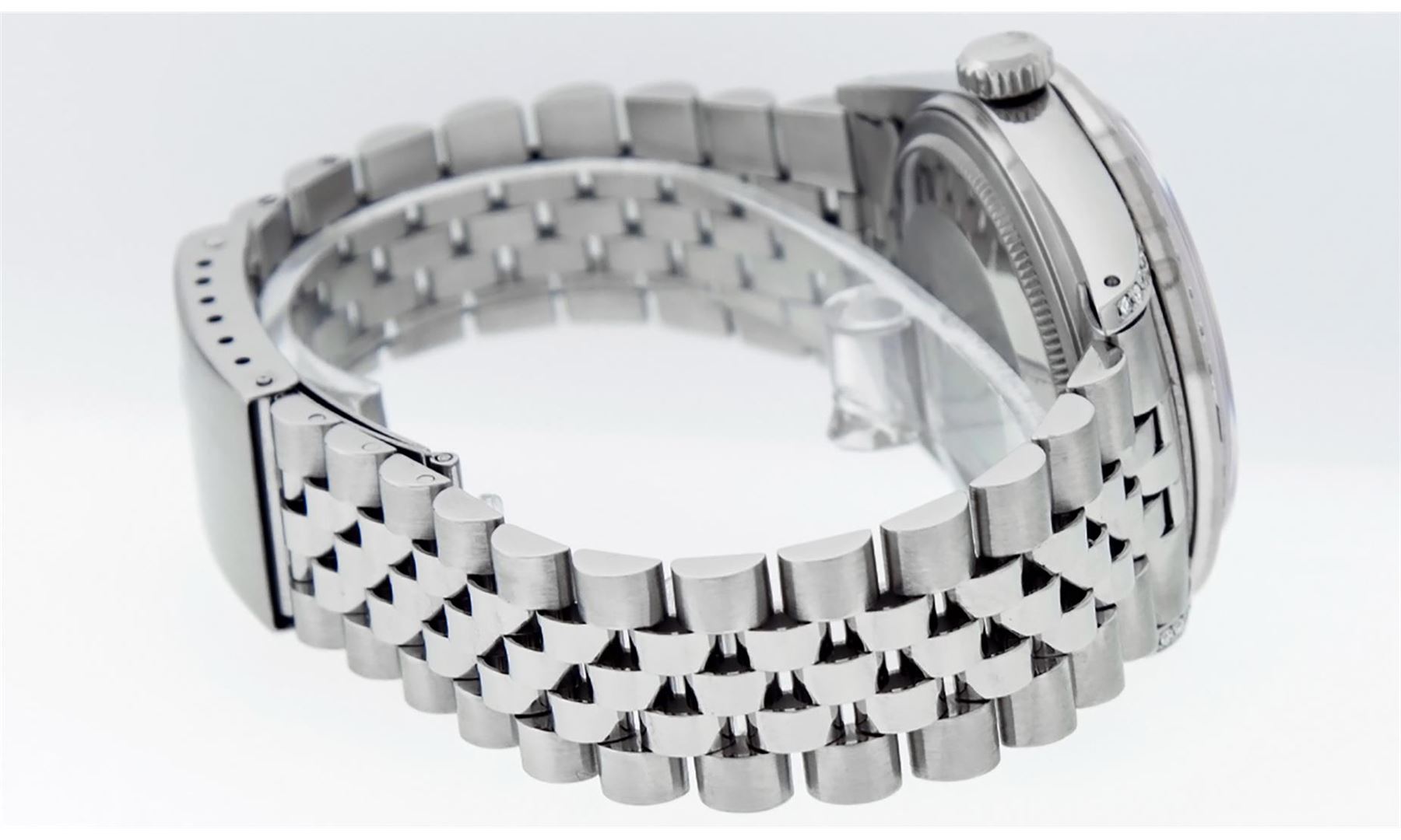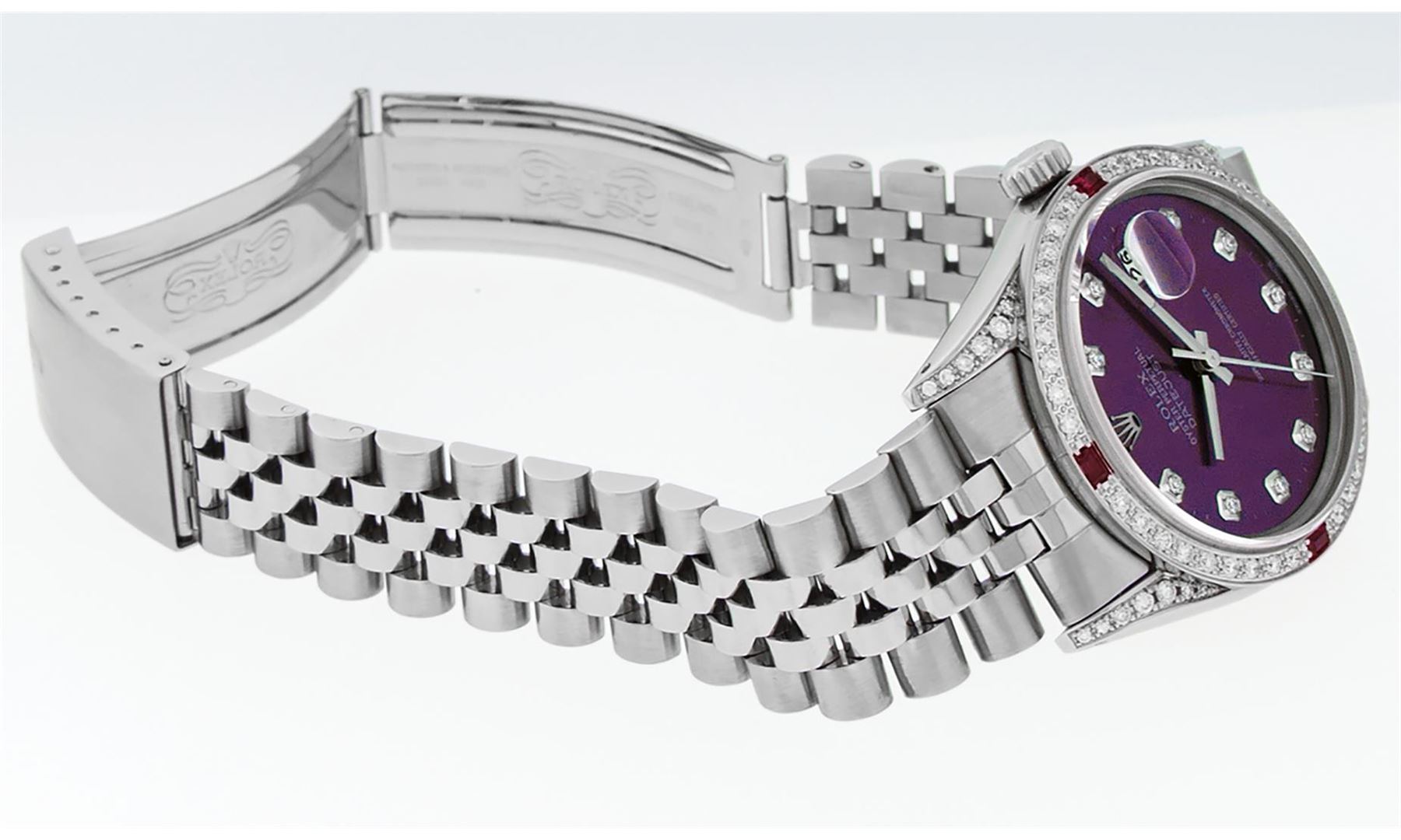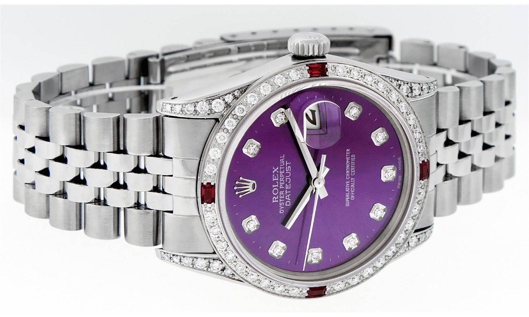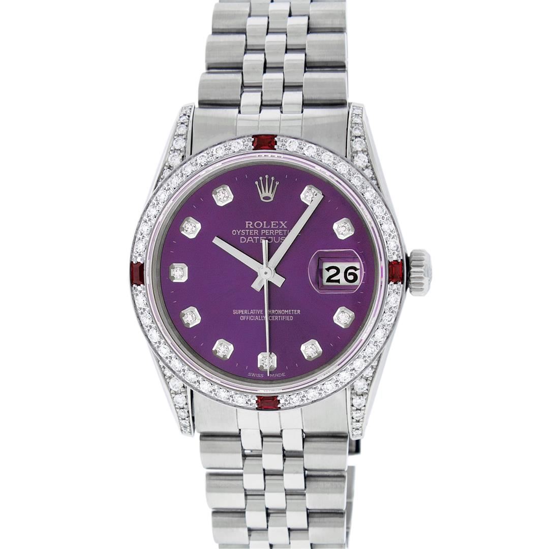 One Mens Rolex Datejust Polished Bright with Satin Finish, Serviced & Electronically Tested, Stainless Steel Case: 36mm, Custom Diamond Lugs: 28 Diamonds In Lugs, Color: G to H, Clarity: SI-VS. Stainless Steel Crown, Custom Bezel: 18K White Gold Diamond + Ruby Beadset, Diamond Count: 36 Diamonds + 4 Rubies, Total Weight 1.00 Carat, Clarity: SI-VS, Color: G to H. Custom Crystal: New Scratch Resistant Synthetic Sapphire Cyclops Lens. Custom Hands: New Luminescent Hands. Movement: Automatic Winding Movement. Custom Dial: Purple Single Cut Diamond Dial With Dash Track, Stone Count: 10 Diamonds In Dial, Diamond Color: G To H In Color, Clarity: VS. Date Window: 3 O'Clock Position Date Display, Quickset, Model: Datejust Condition: G-6 Extra Fine. Bracelet: Stainless Steel Jubilee Band. Bright Polish & Satin Finish. 7.0 Inch Length, Adjustable. Standard Clasp, With Rolex Logo. This Watch Has Been Serviced And Polished And Its Free Of All Dents And Scratches.
