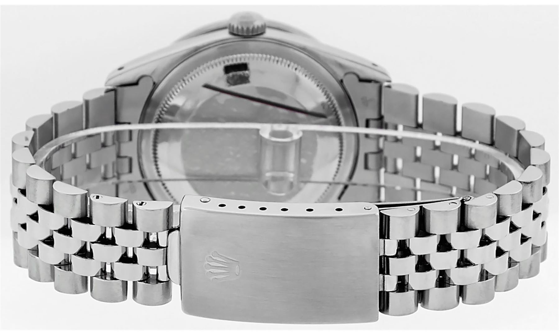 One Mens Rolex Datejust Polished Bright with Satin Finish, Serviced & Electronically Tested, Stainless Steel Case: 36mm, Custom Diamonds On Lugs: 28 Diamonds On Lugs, Color: G to H, Clarity: SI-VS. Stainless Steel Crown, Custom Bezel: 18K White Gold Pyramid Diamond Bezel, Diamond Count: 24 Diamonds On Bezel, Total Weight .75 Carat, Clarity: SI-VS, Color: G to H. Custom Crystal: New Synthetic Sapphire Cyclops Lens. Custom Hands: New Solid Hands. Movement: Automatic Winding Movement. Custom Dial: Silver Diamond Dial, Diamond Count: 10 Diamonds In Dial, Diamond Color: G To H In Color, Clarity: SI-VS. Date Window: 3 O'Clock Position Date Display, Quickset, Model: Datejust Condition: G-6 Extra Fine. Bracelet: Stainless Steel Jubilee Band. Bright Polish & Satin Finish. 7.0 Inch Length, Adjustable. Standard Clasp, With Rolex Logo. This Watch Has Been Serviced And Polished And Its Free Of All Dents And Scratches.