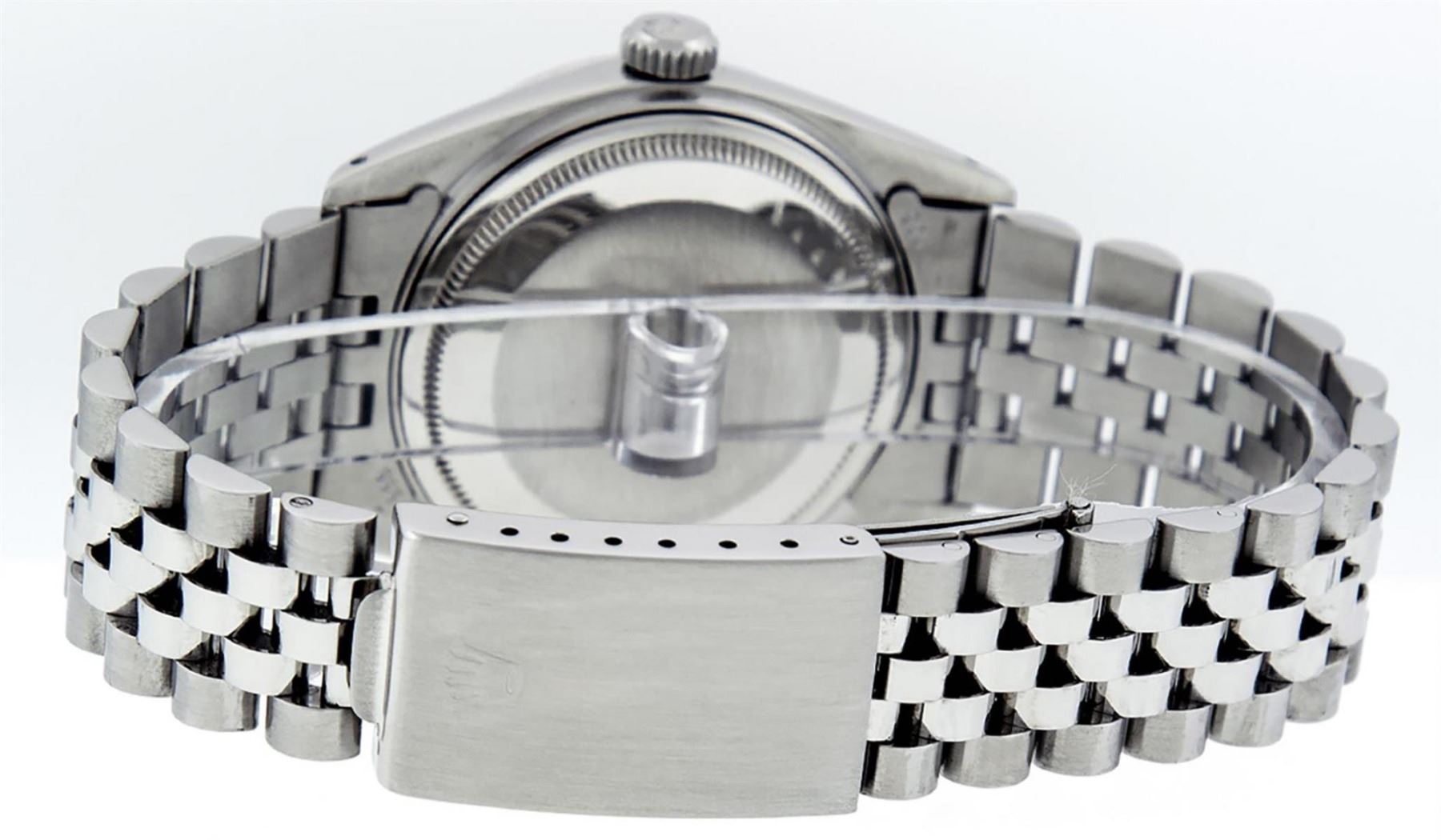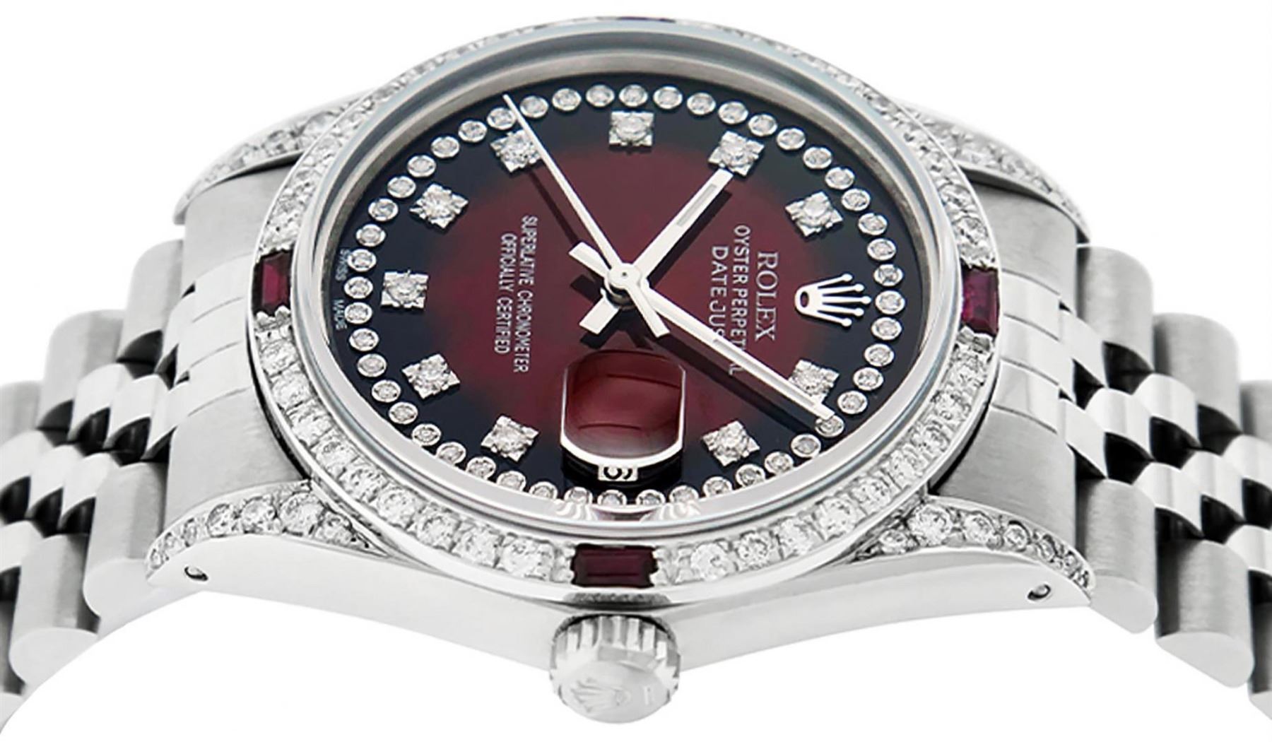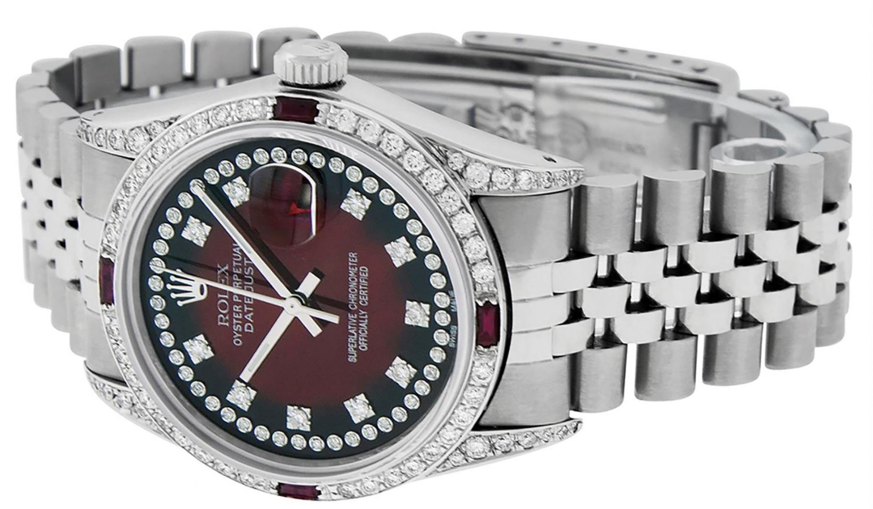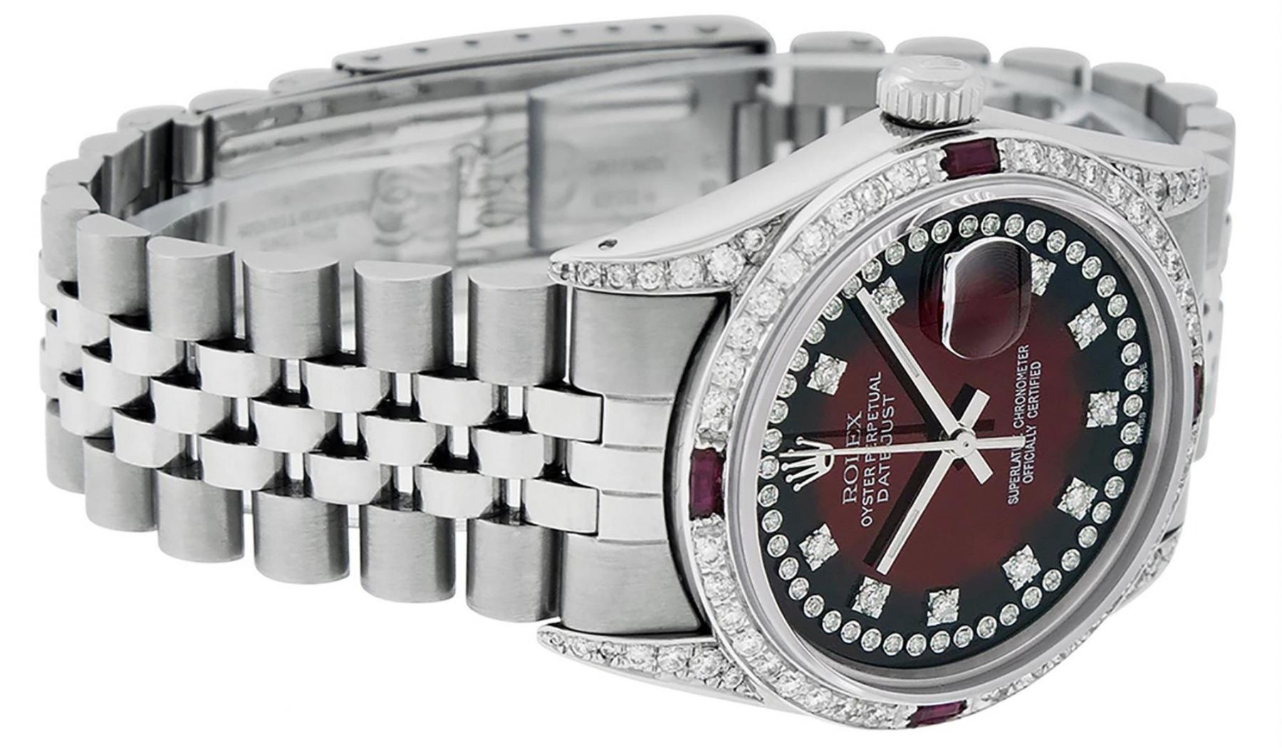 One Mens Rolex Datejust Polished Bright with Satin Finish, Serviced & Electronically Tested, Stainless Steel Case: 36mm, Custom Diamond Lugs: 28 Diamonds In Lugs, Color: G to H, Clarity: SI-VS. Stainless Steel Crown, Custom Bezel: 18K White Gold Diamond + Ruby Beadset, Diamond Count: 36 Diamonds + 4 Rubies, Total Weight 1.00 Carat, Clarity: SI-VS, Color: G to H. Custom Crystal: New Scratch Resistant Synthetic Sapphire Cyclops Lens. Custom Hands: New Luminescent Hands. Movement: Automatic Winding Movement Caliber 3035. Custom Dial: Red Vignette String Diamond Dial, Stone Count: 58 Diamonds In Dial, Diamond Color: G To H In Color, Clarity: SI-VS. Date Window: 3 O'Clock Position Date Display, Quickset, Model: Datejust Condition: G-6 Extra Fine. Bracelet: Stainless Steel Jubilee Band. Bright Polish & Satin Finish. 7.0 Inch Length, Adjustable. Standard Clasp, With Rolex Logo. This Watch Has Been Serviced And Polished And Its Free Of All Dents And Scratches.