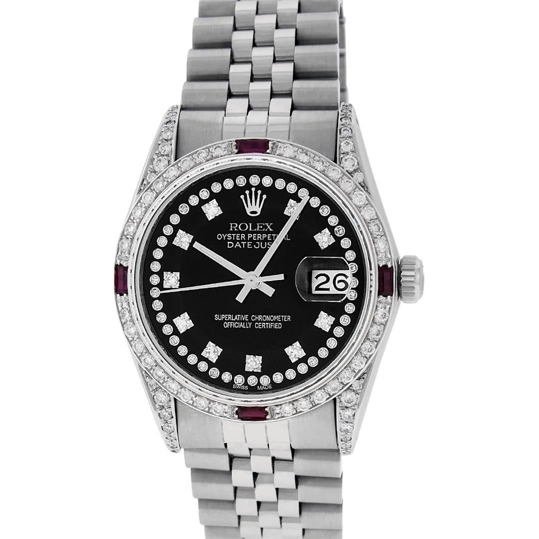 One Mens Rolex Datejust Polished Bright with Satin Finish, Serviced & Electronically Tested, Stainless Steel Case: 36mm, Custom Diamond Lugs: 28 Diamonds In Lugs, Color: G to H, Clarity: SI-VS. Stainless Steel Crown, Custom Bezel: 18K White Gold Diamond + Ruby Beadset, Diamond Count: 36 Diamonds + 4 Rubies, Total Weight 1.00 Carat, Clarity: SI-VS, Color: G to H. Custom Crystal: New Scratch Resistant Synthetic Sapphire Cyclops Lens. Custom Hands: New Luminescent Hands. Movement: Automatic Winding Movement Caliber 3035. Custom Dial: Black String Diamond Dial, Stone Count: 58 Diamonds In Dial, Diamond Color: G To H In Color, Clarity: VS. Date Window: 3 O'Clock Position Date Display, Quickset, Model: Datejust Condition: G-6 Extra Fine. Bracelet: Stainless Steel Jubilee Band. Bright Polish & Satin Finish. 7.0 Inch Length, Adjustable. Standard Clasp, With Rolex Logo. This Watch Has Been Serviced And Polished And Its Free Of All Dents And Scratches.