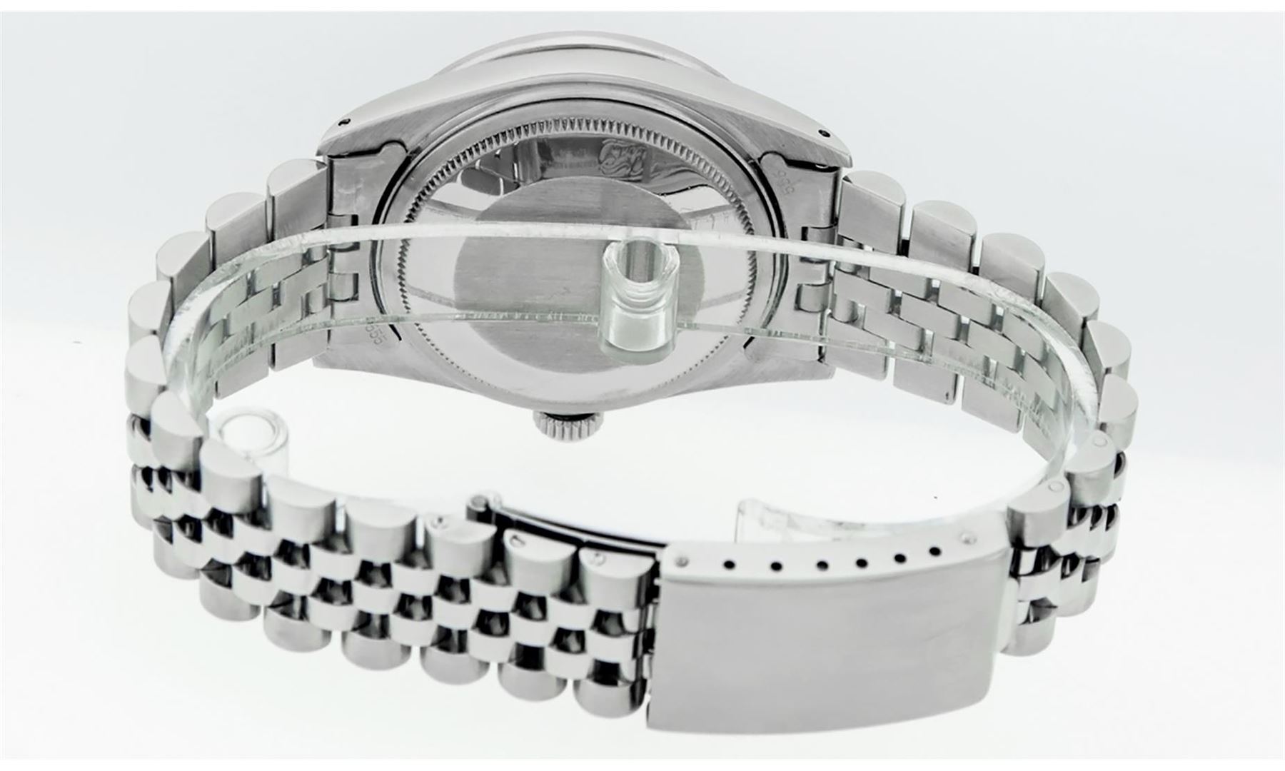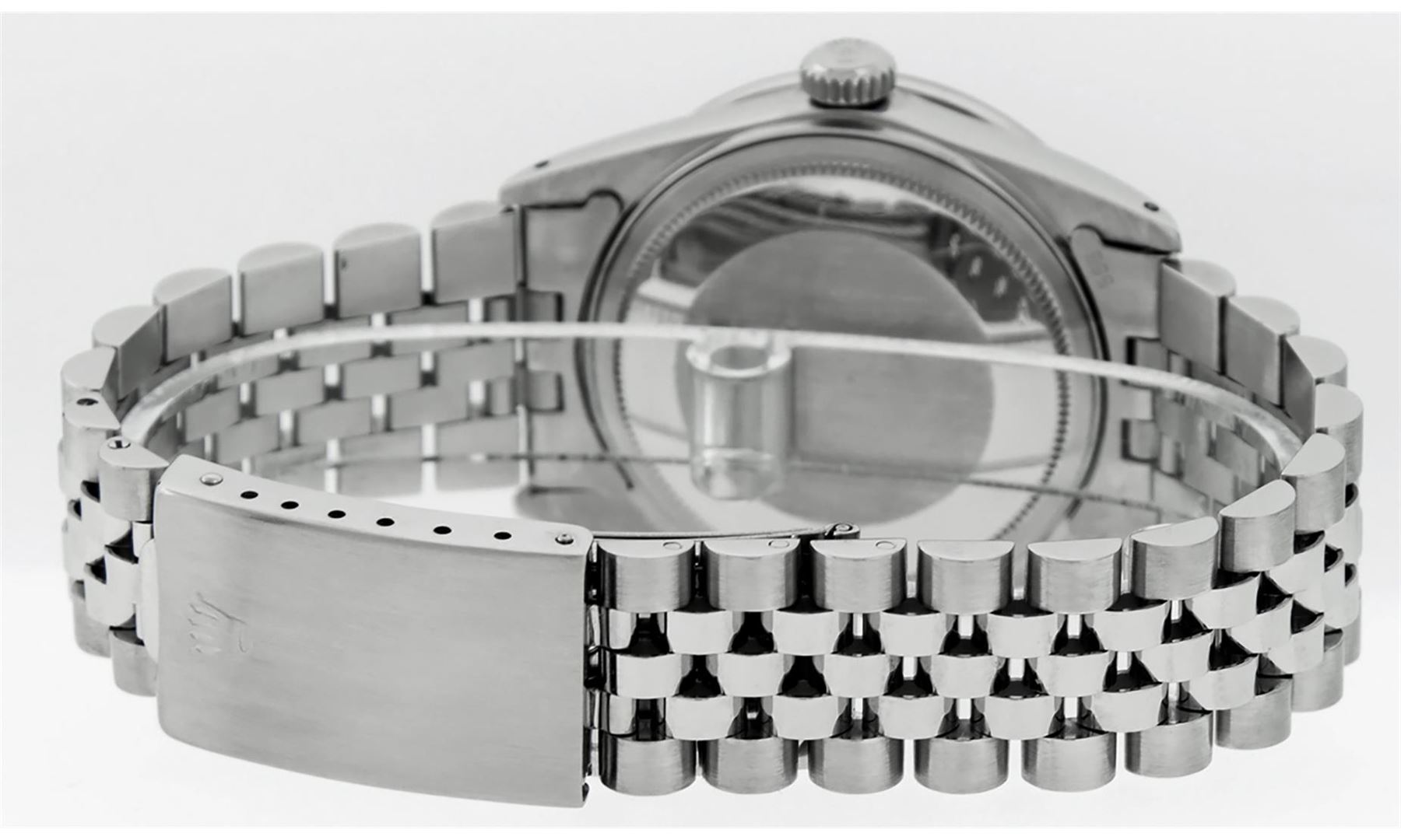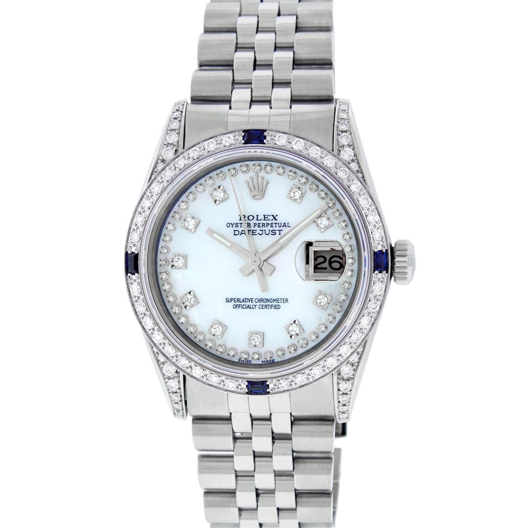 One Mens Rolex Datejust Polished Bright with Satin Finish, Serviced & Electronically Tested, Stainless Steel Case: 36mm, Custom Diamonds On Lugs: 28 Diamonds On Lugs, Color: G to H, Clarity: SI-VS. Stainless Steel Crown, Custom Bezel: 18K White Gold Diamond + Sapphire Beadset, Diamond Count: 36 Diamonds + 4 Sapphires, Total Weight 1.00 Carat, Clarity: SI-VS, Color: G to H. Custom Crystal: New Synthetic Sapphire Cyclops Lens. Custom Hands: New Luminescent Hands. Movement: Automatic Winding Movement Caliber 3035. Custom Dial: Mother Of Pearl String Diamond Dial, Diamond Count: 58 Diamonds In Dial, Diamond Color: G To H In Color, Clarity: SI-VS. Date Window: 3 O'Clock Position Date Display, Quickset, Model: Datejust Condition: G-6 Extra Fine. Bracelet: Stainless Steel Jubilee Band. Bright Polish & Satin Finish. 7.0 Inch Length, Adjustable. Standard Clasp, With Rolex Logo. This Watch Has Been Serviced And Polished And Its Free Of All Dents And Scratches.