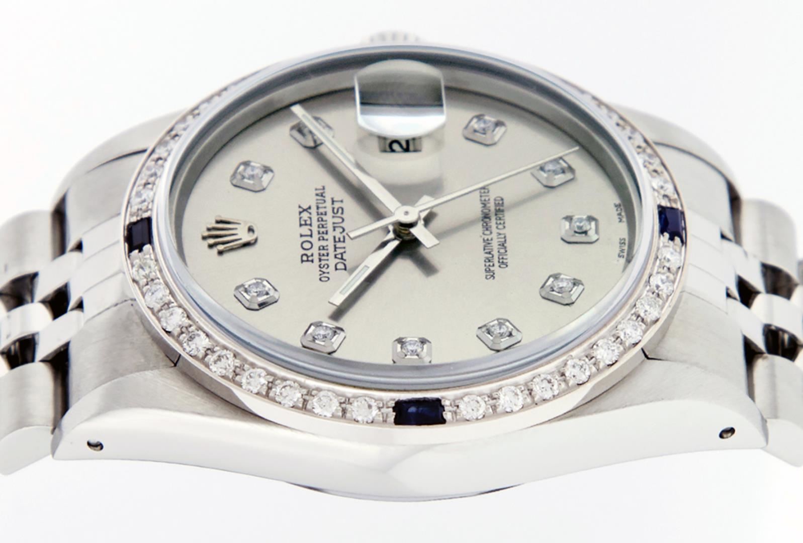 One Mens Pre Owned Stainless Steel Rolex Datejust Polished Bright with Satin Finish, This Watch Has Been Serviced And Electronically Tested, Stainless Steel Case: 36mm, Stainless Steel Crown, Custom Bezel: New 18K White Gold Sapphire Beadset Diamond Bezel, Diamond + Gem Count: 36 Diamonds + 4 Sapphires. Custom Crystal: New Sapphire With Magnified Date Window. Custom Hands: New Luminescent Hands. Rolex Movement: Automatic Winding Movement 3035. Custom Dial: Custom Slate Grey With Added Diamond Hour Markers, Diamond Count: 10 Diamonds in Dial. Date Window: 3 O'Clock Position Date Display, Quickset, Model: Quickset Datejust, Condition: G-6 Extra Fine. Rolex Bracelet: Stainless Steel Jubilee Band. Bracelet: 7.0 Inch Length, Adjustable. Standard Clasp, With Rolex Logo. This Watch Has Been Serviced Time Tested And Is In Excellent Condition It Is Free Of All Scratches And Dents.