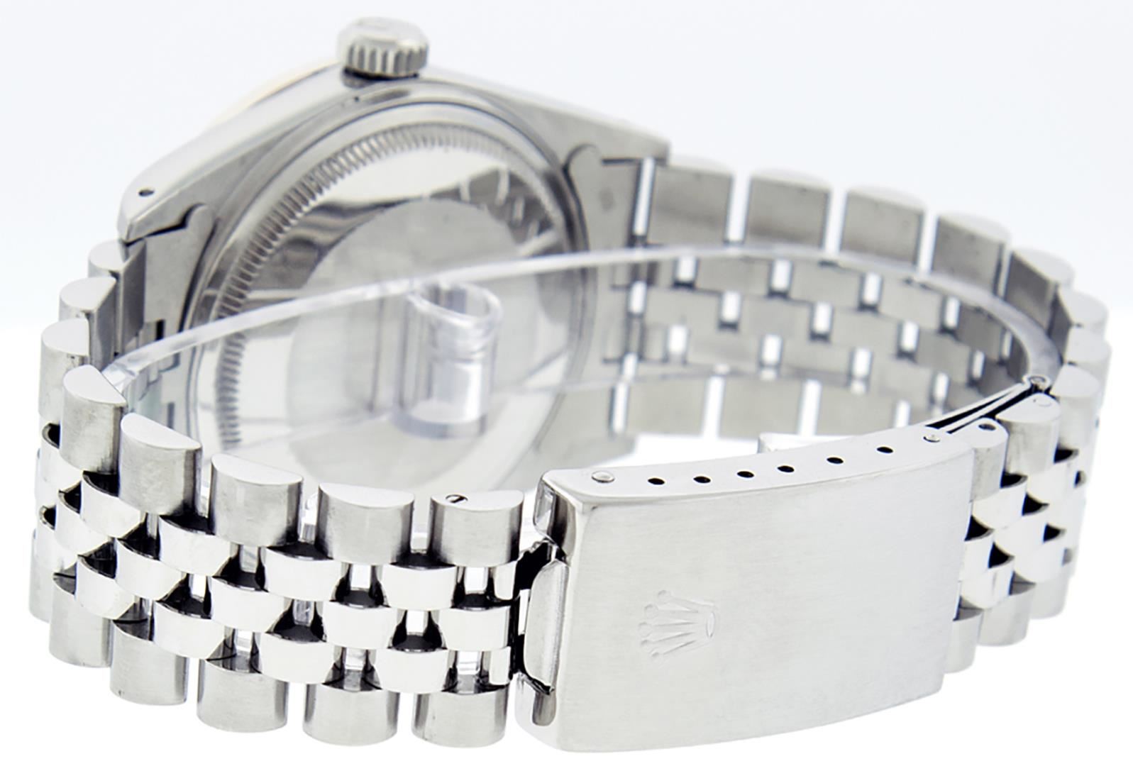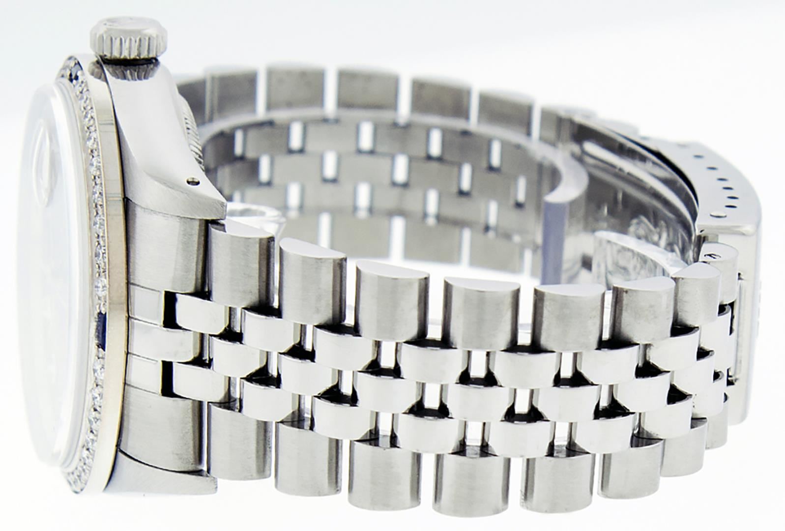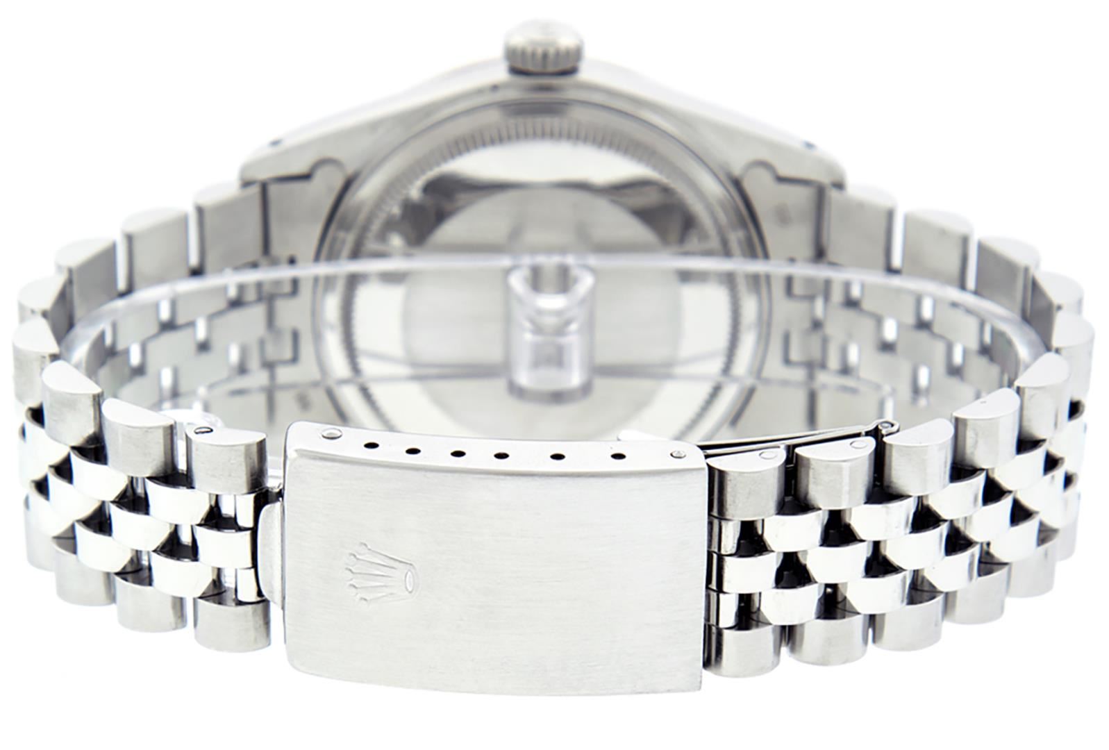 One Mens Pre Owned Stainless Steel Rolex Datejust Polished Bright with Satin Finish, This Watch Has Been Serviced And Electronically Tested, Stainless Steel Case: 36mm, Stainless Steel Crown, Custom Bezel: New 18K White Gold Sapphire Beadset Diamond Bezel, Diamond + Gem Count: 36 Diamonds + 4 Sapphires. Custom Crystal: New Sapphire With Magnified Date Window. Custom Hands: New Luminescent Hands. Rolex Movement: Automatic Winding Movement 3035. Custom Dial: Custom Slate Grey With Added Diamond Hour Markers, Diamond Count: 10 Diamonds in Dial. Date Window: 3 O'Clock Position Date Display, Quickset, Model: Quickset Datejust, Condition: G-6 Extra Fine. Rolex Bracelet: Stainless Steel Jubilee Band. Bracelet: 7.0 Inch Length, Adjustable. Standard Clasp, With Rolex Logo. This Watch Has Been Serviced Time Tested And Is In Excellent Condition It Is Free Of All Scratches And Dents.