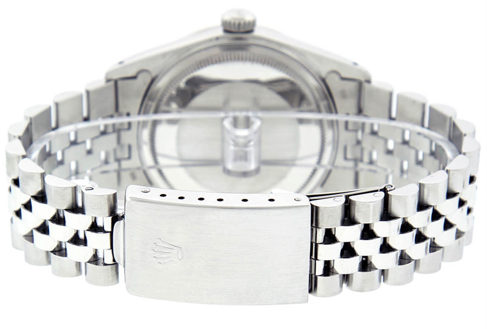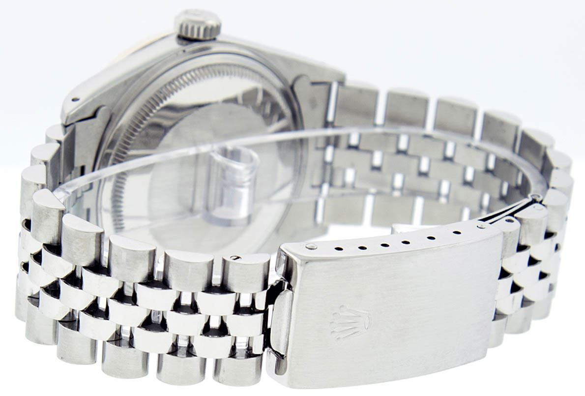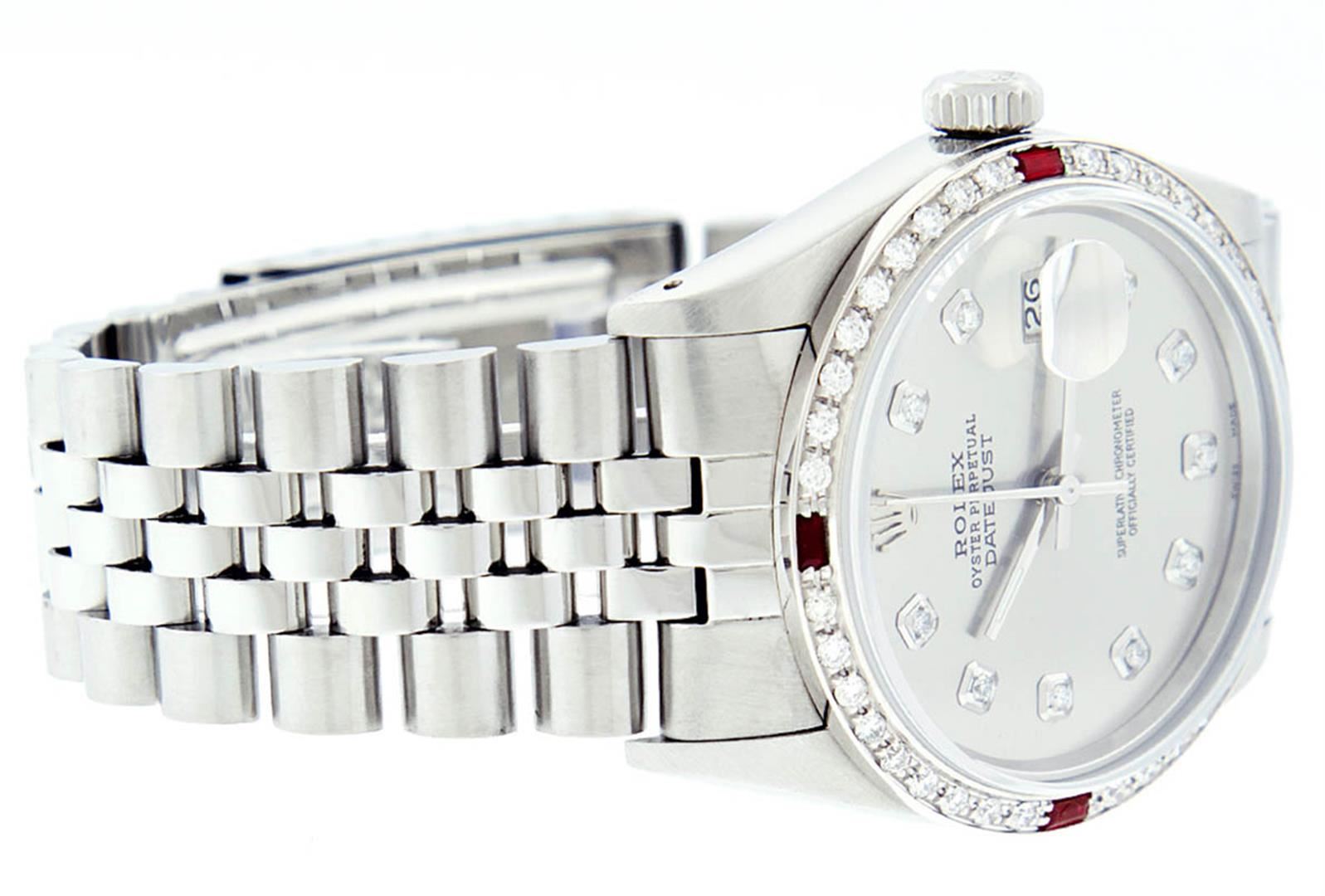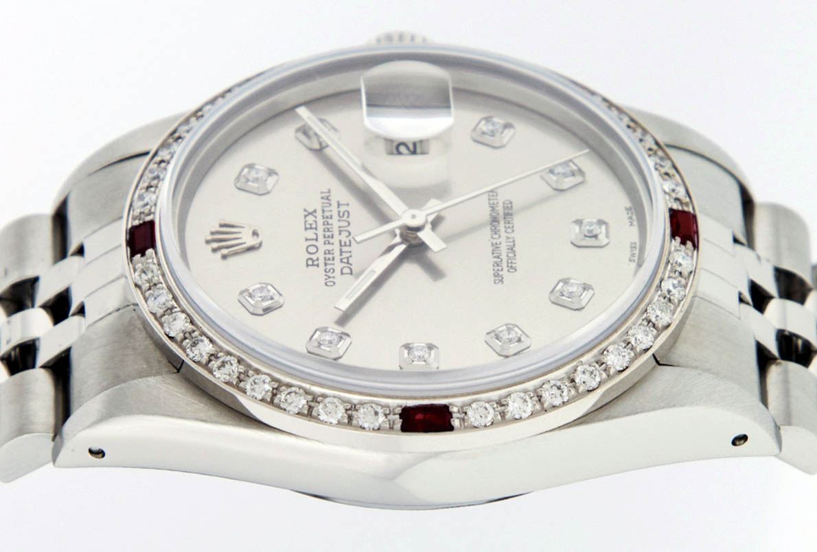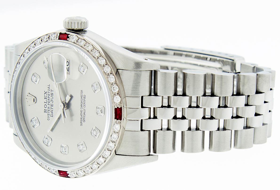 One Mens Stainless Steel Rolex Datejust Polished Bright with Satin Finish, This Watch Has Been Serviced & Electronically Tested, Stainless Steel Case: 36mm, Stainless Steel Crown, Custom Bezel: New 18K White Gold Ruby Beadset Diamond Bezel, Diamond + Gem Count: 36 Diamonds + 4 Rubies, Total Weight 1.00 Carat, Clarity: SI-VS, Color: G to H. Custom Crystal: New Synthetic Sapphire Cyclops Lens. Custom Hands: New Luminescent Hands. Movement: Automatic Winding Movement Caliber 3035. Custom Dial: Slate Grey With Diamond Hour Markers, Diamond Count: 10 Diamonds in Dial, Diamond Color: G To H In Color, Clarity: SI-VS. Date Window: 3 O'Clock Position Date Display, Quickset, Model: Datejust, Condition: G-6 Extra Fine. Bracelet: Stainless Steel Jubilee. Bracelet: 7.0 Inch Length, Adjustable. Standard Clasp, With Rolex Logo. This Watch Has Been Serviced Time Tested And Is In Excellent Condition It Is Free Of All Scratches And Dents.