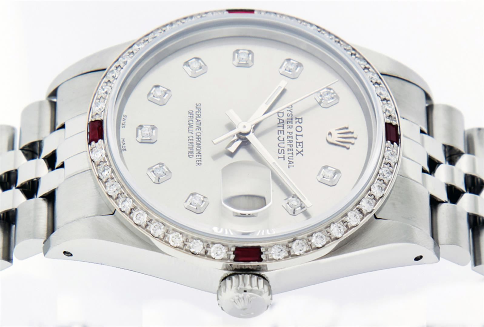 One Mens Stainless Steel Rolex Datejust Polished Bright with Satin Finish, This Watch Has Been Serviced & Electronically Tested, Stainless Steel Case: 36mm, Stainless Steel Crown, Custom Bezel: New 18K White Gold Ruby Beadset Diamond Bezel, Diamond + Gem Count: 36 Diamonds + 4 Rubies, Total Weight 1.00 Carat, Clarity: SI-VS, Color: G to H. Custom Crystal: New Synthetic Sapphire Cyclops Lens. Custom Hands: New Luminescent Hands. Movement: Automatic Winding Movement. Custom Dial: Slate Grey With Diamond Hour Markers, Diamond Count: 10 Diamonds in Dial, Diamond Color: G To H In Color, Clarity: SI-VS. Date Window: 3 O'Clock Position Date Display, Quickset, Model: Datejust, Condition: G-6 Extra Fine. Bracelet: Stainless Steel Jubilee. Bracelet: 7.0 Inch Length, Adjustable. Standard Clasp, With Rolex Logo. This Watch Has Been Serviced Time Tested And Is In Excellent Condition It Is Free Of All Scratches And Dents.