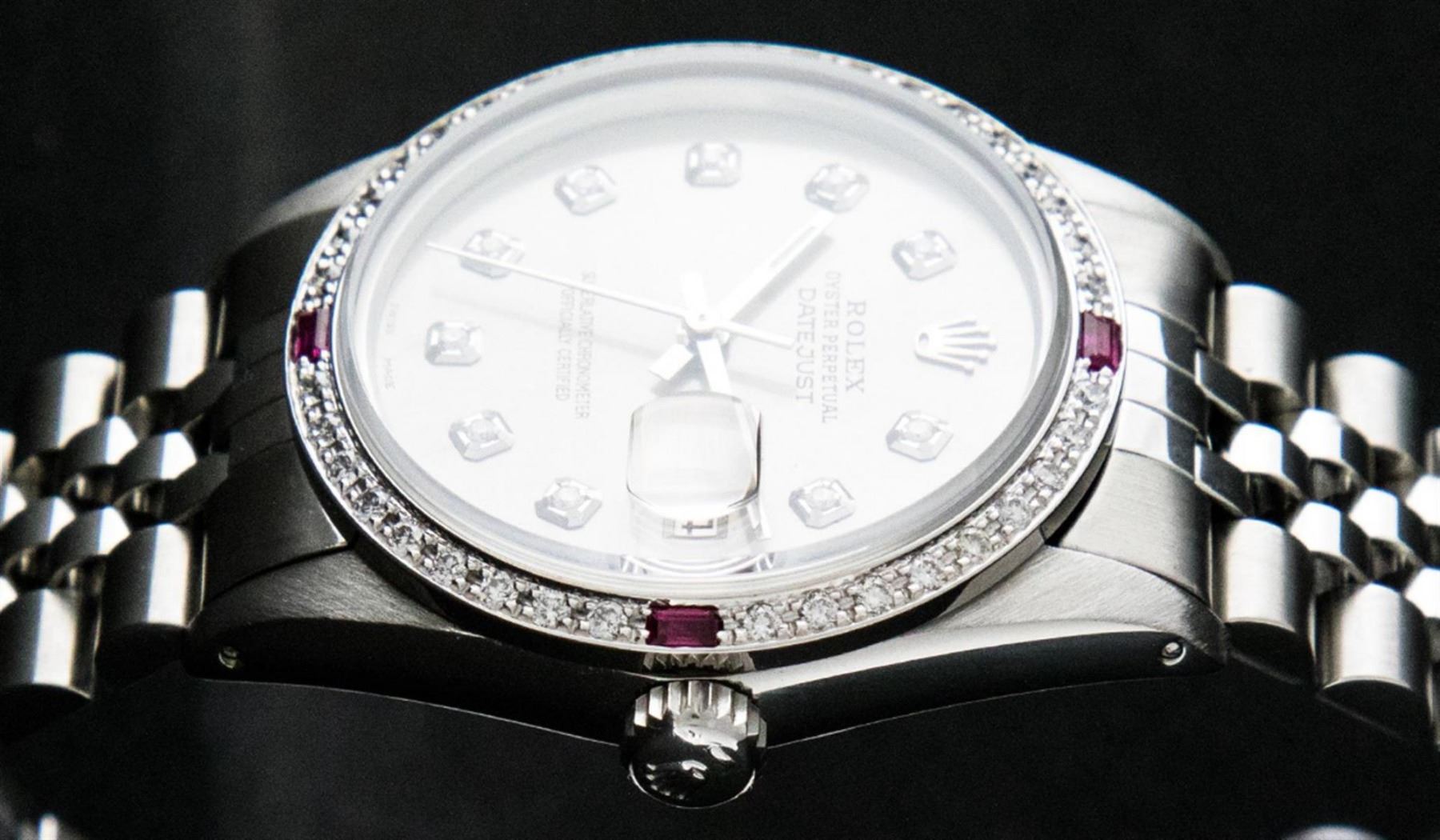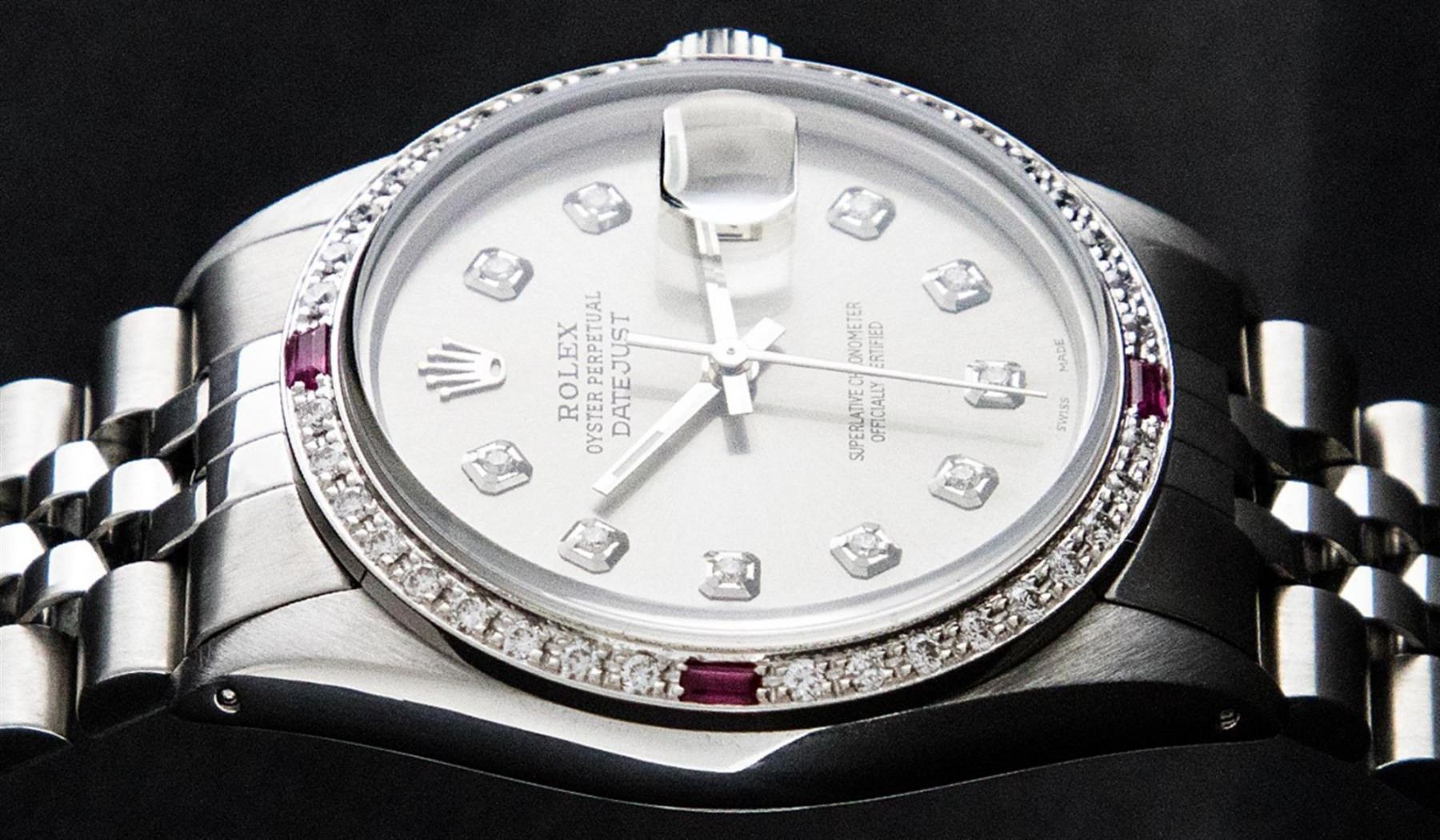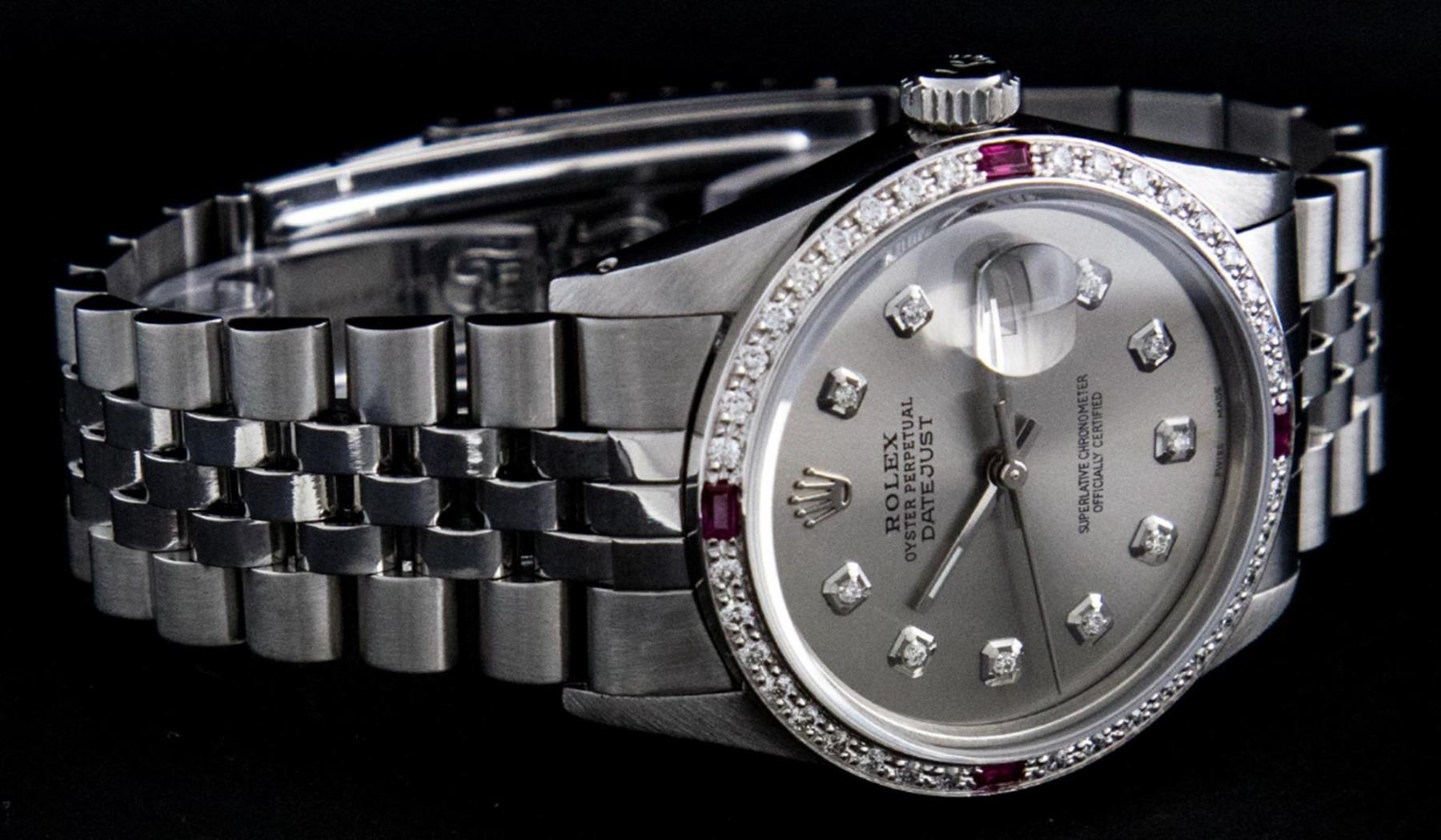 One Mens Stainless Steel Rolex Datejust Polished Bright with Satin Finish, This Watch Has Been Serviced & Electronically Tested, Stainless Steel Case: 36mm, Stainless Steel Crown, Custom Bezel: New 18K White Gold Ruby Beadset Diamond Bezel, Diamond + Gem Count: 36 Diamonds + 4 Rubies, Total Weight 1.00 Carat, Clarity: SI-VS, Color: G to H. Custom Crystal: New Synthetic Sapphire Cyclops Lens. Custom Hands: New Luminescent Hands. Movement: Automatic Winding Movement. Custom Dial: Slate Grey With Diamond Hour Markers, Diamond Count: 10 Diamonds in Dial, Diamond Color: G To H In Color, Clarity: SI-VS. Date Window: 3 O'Clock Position Date Display, Quickset, Model: Datejust, Condition: G-6 Extra Fine. Bracelet: Stainless Steel Jubilee. Bracelet: 7.0 Inch Length, Adjustable. Standard Clasp, With Rolex Logo. This Watch Has Been Serviced Time Tested And Is In Excellent Condition It Is Free Of All Scratches And Dents.