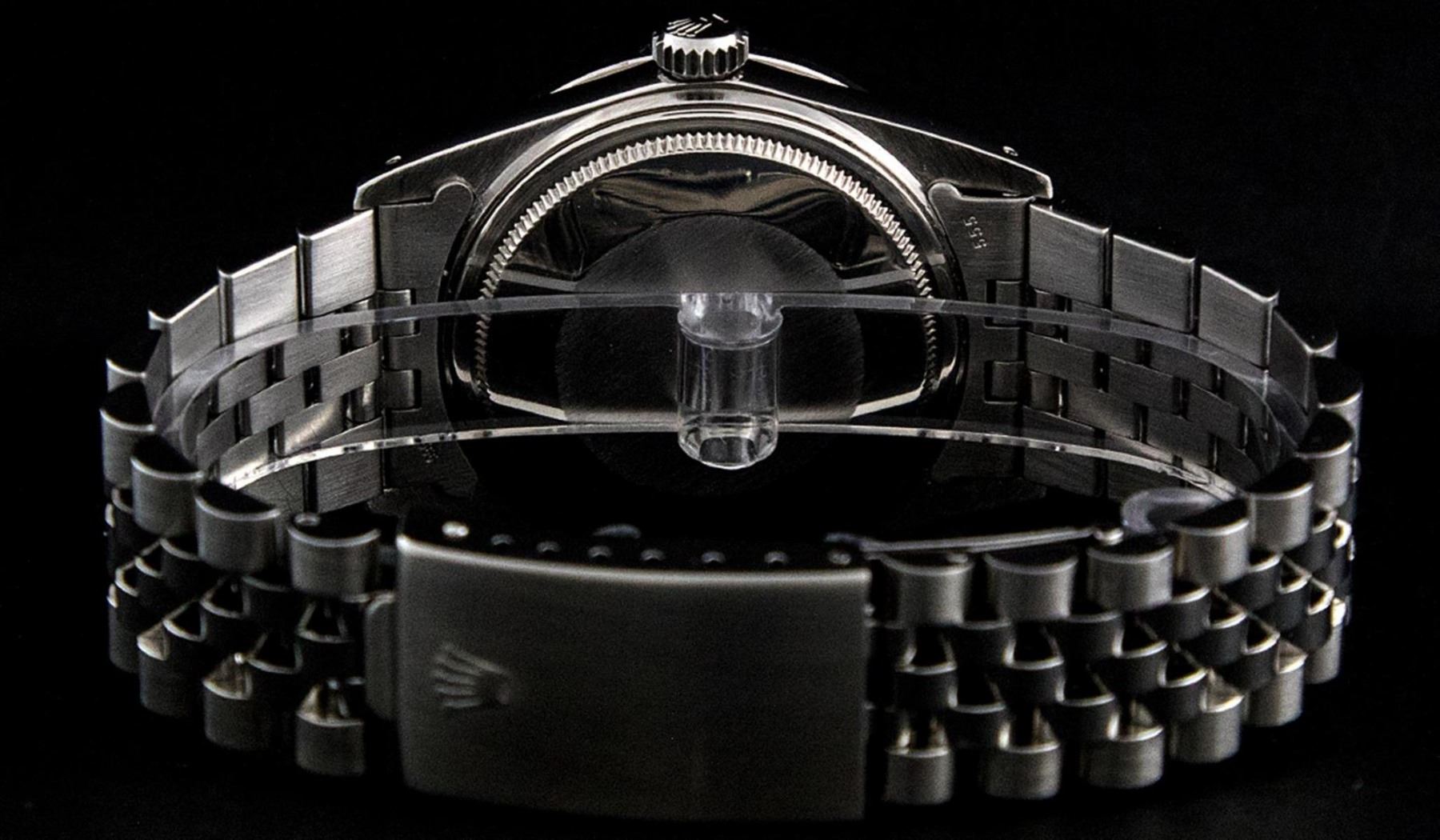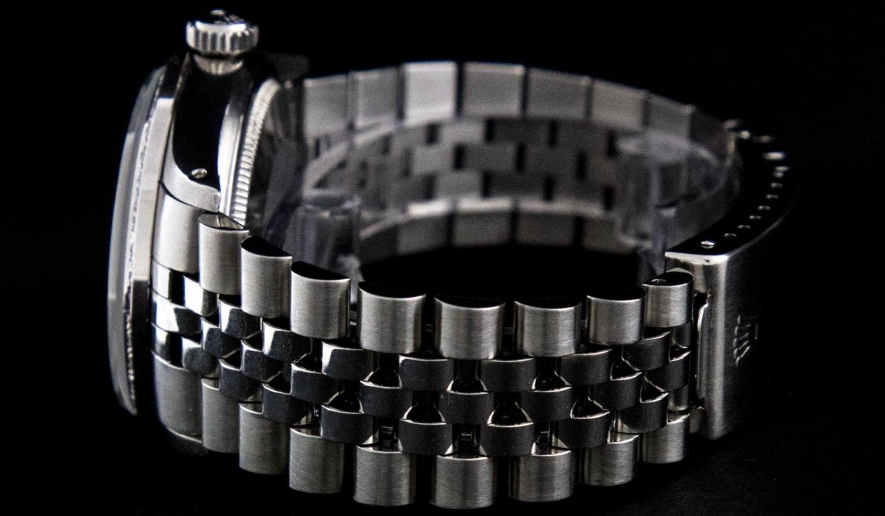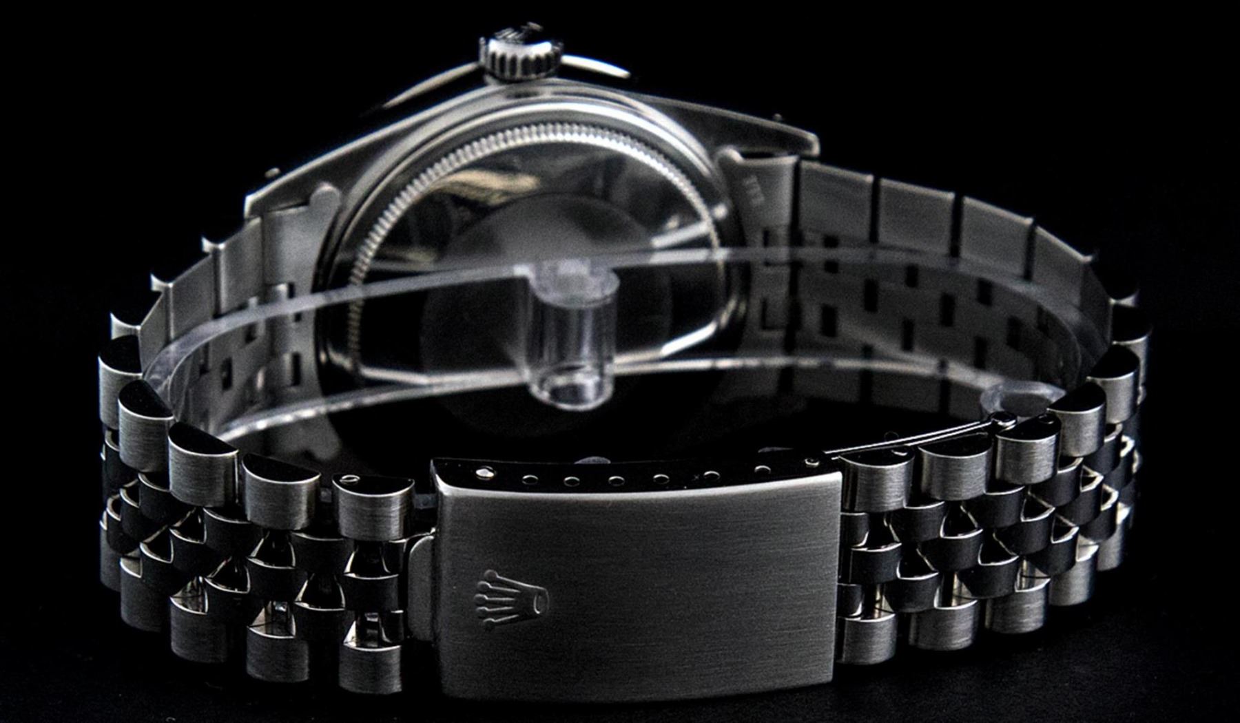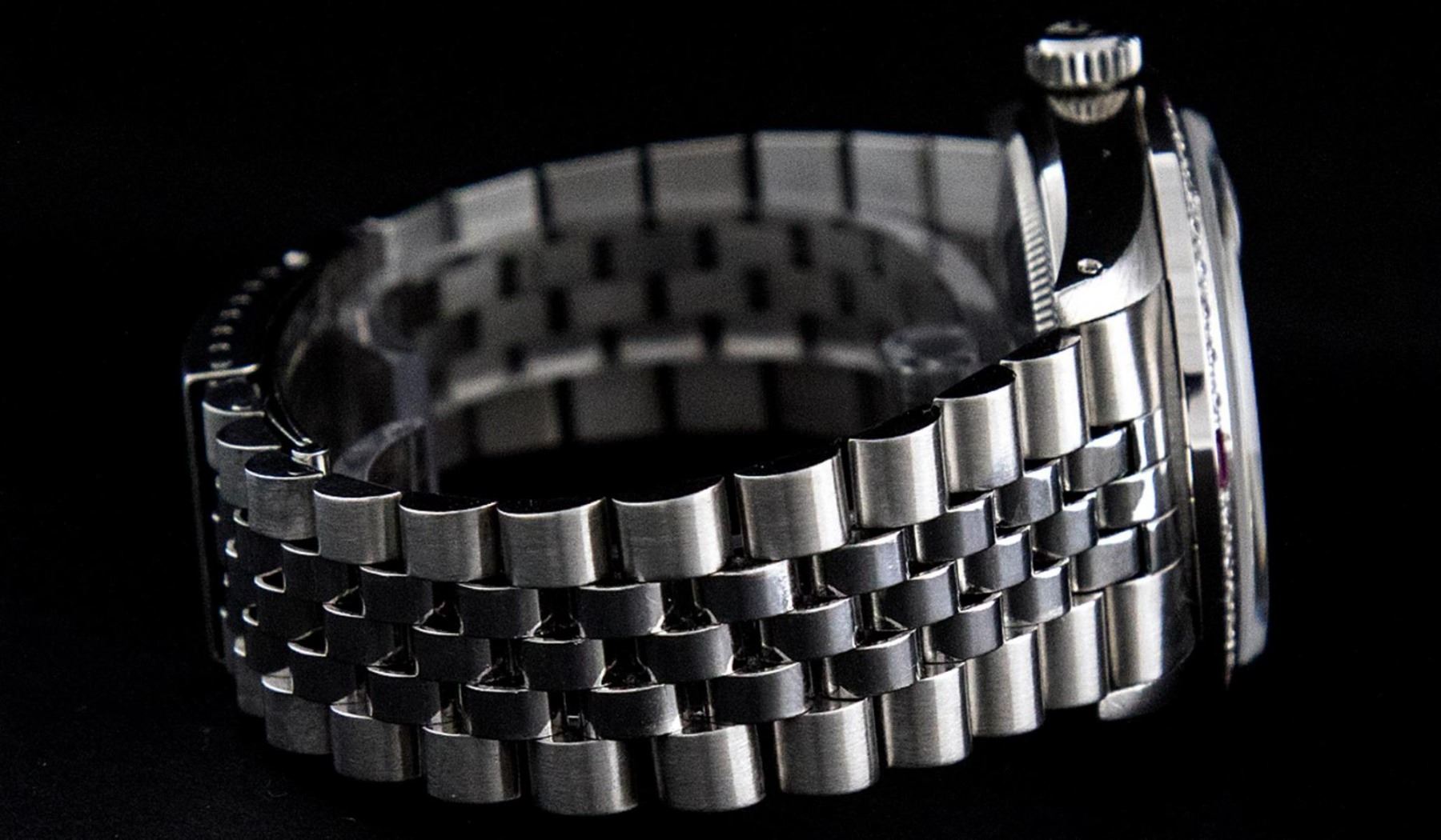 One Mens Stainless Steel Rolex Datejust Polished Bright with Satin Finish, This Watch Has Been Serviced & Electronically Tested, Stainless Steel Case: 36mm, Stainless Steel Crown, Custom Bezel: New 18K White Gold Ruby Beadset Diamond Bezel, Diamond + Gem Count: 36 Diamonds + 4 Rubies, Total Weight 1.00 Carat, Clarity: SI-VS, Color: G to H. Custom Crystal: New Synthetic Sapphire Cyclops Lens. Custom Hands: New Luminescent Hands. Movement: Automatic Winding Movement. Custom Dial: Slate Grey With Diamond Hour Markers, Diamond Count: 10 Diamonds in Dial, Diamond Color: G To H In Color, Clarity: SI-VS. Date Window: 3 O'Clock Position Date Display, Quickset, Model: Datejust, Condition: G-6 Extra Fine. Bracelet: Stainless Steel Jubilee. Bracelet: 7.0 Inch Length, Adjustable. Standard Clasp, With Rolex Logo. This Watch Has Been Serviced Time Tested And Is In Excellent Condition It Is Free Of All Scratches And Dents.