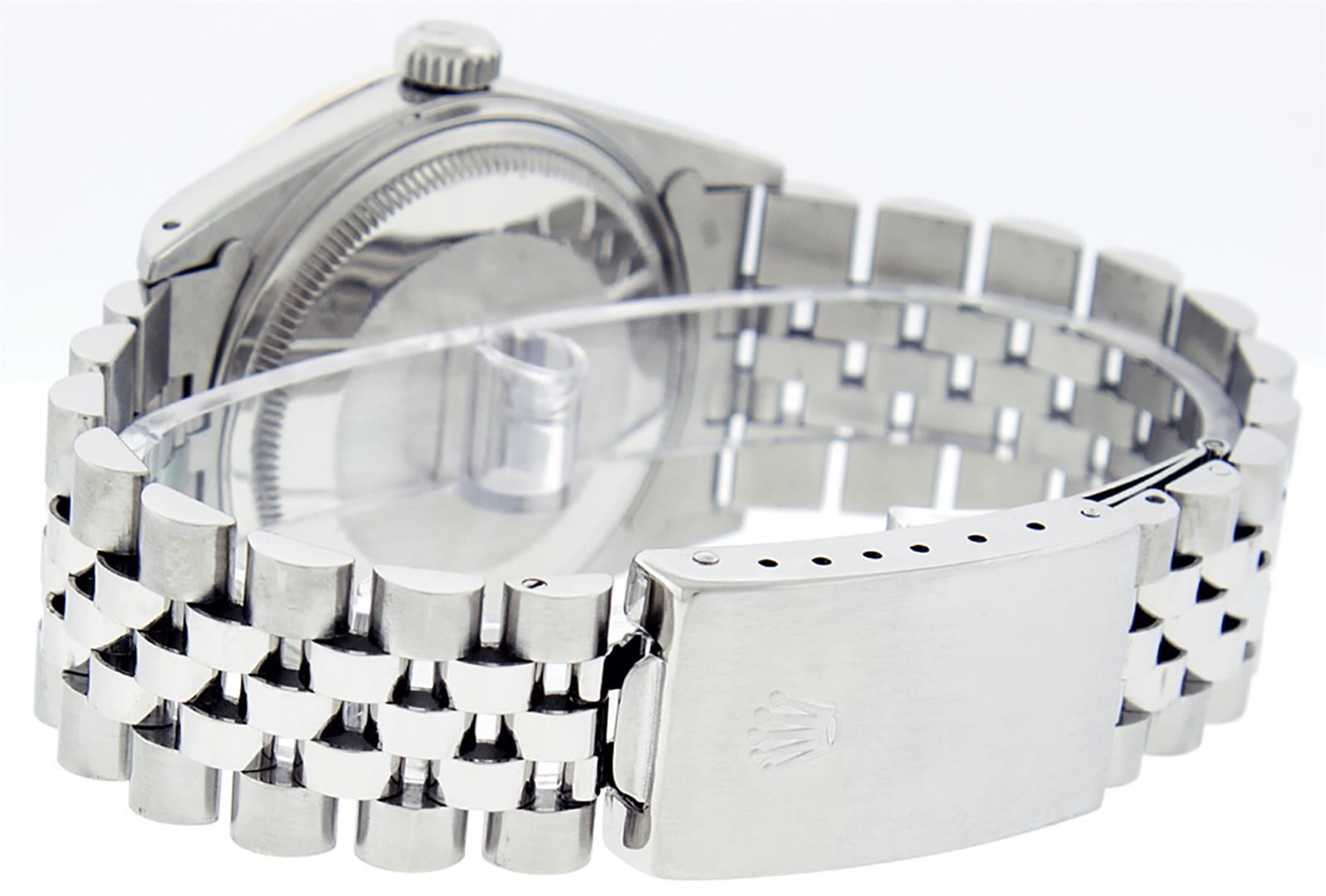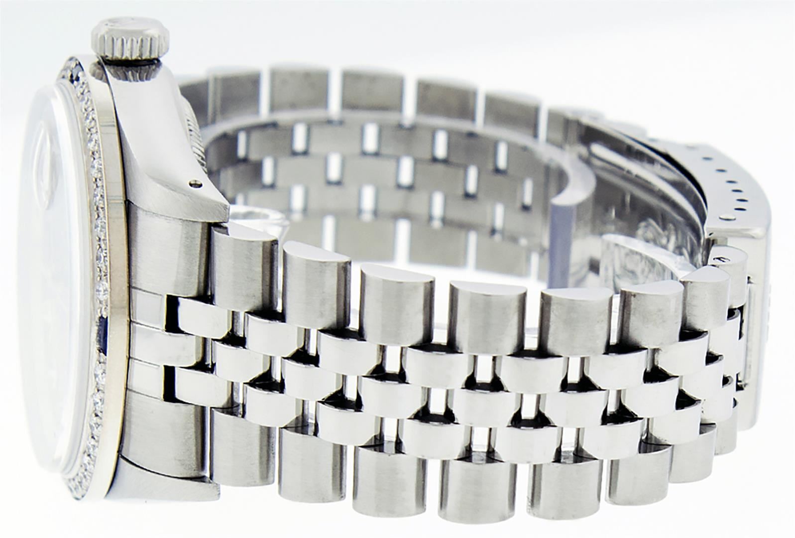 One Mens Stainless Steel Rolex Datejust Polished Bright with Satin Finish, This Watch Has Been Serviced & Electronically Tested, Stainless Steel Case: 36mm, Stainless Steel Crown, Custom Bezel: New 18K White Gold Sapphire Beadset Diamond Bezel, Diamond + Gem Count: 36 Diamonds + 4 Sapphires, Total Weight 1.00 Carat, Clarity: SI-VS, Color: G to H. Custom Crystal: New Synthetic Sapphire Cyclops Lens. Custom Hands: New Luminescent Hands. Movement: Automatic Winding Movement.. Custom Dial: Slate Grey With Diamond Hour Markers, Diamond Count: 10 Diamonds in Dial, Diamond Color: G To H In Color, Clarity: SI-VS. Date Window: 3 O'Clock Position Date Display, Quickset, Model: Datejust, Condition: G-6 Extra Fine. Bracelet: Stainless Steel Jubilee. Bracelet: 7.0 Inch Length, Adjustable. Standard Clasp, With Rolex Logo. This Watch Has Been Serviced Time Tested And Is In Excellent Condition It Is Free Of All Scratches And Dents.