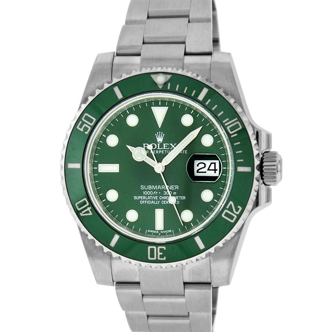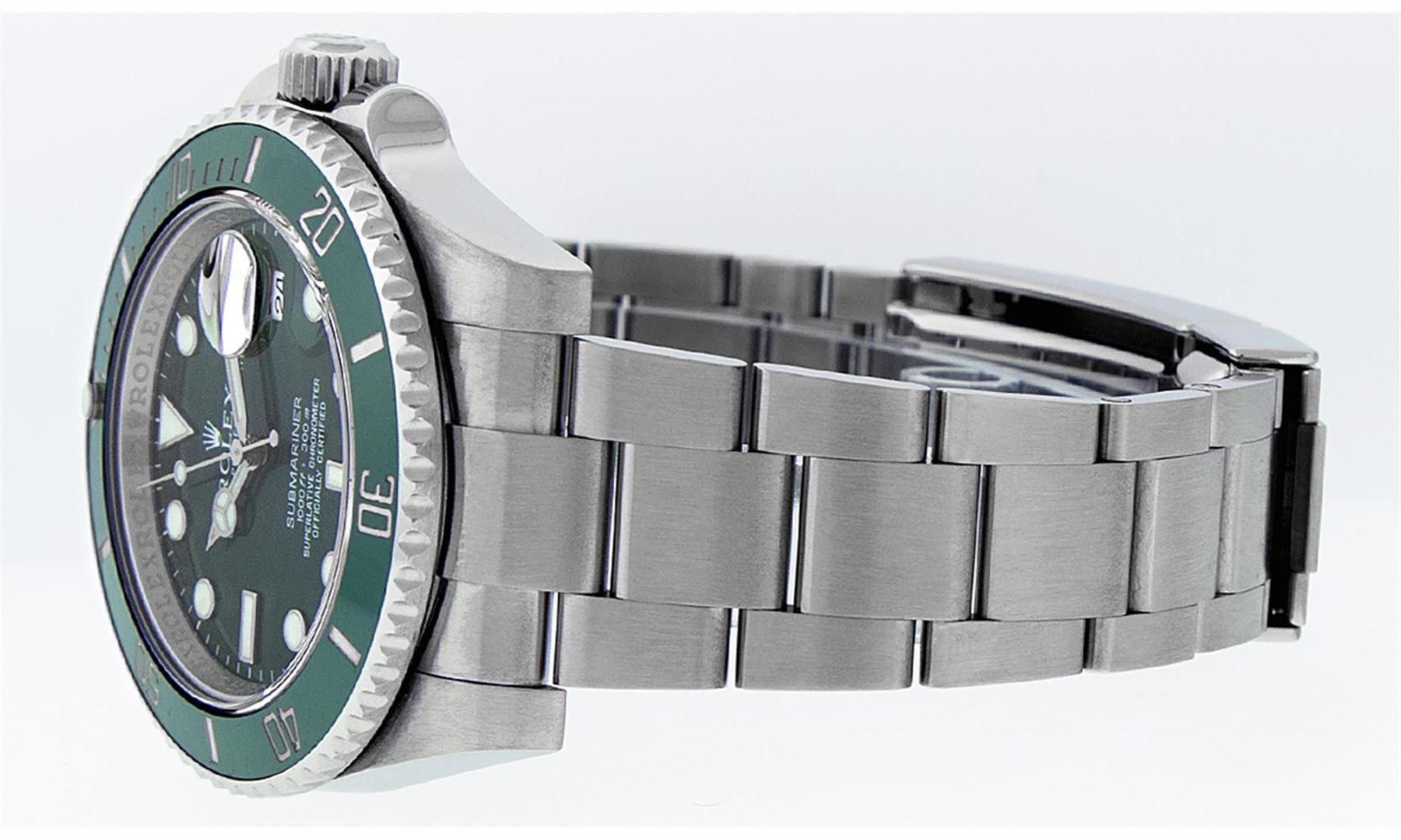 One Mens Pre Owned Rolex Submariner With Date Polished, Serviced & Electronically Tested, Stainless Steel Case: 40mm, Stainless Steel Crown, Custom Bezel: Stainless Steel With Rotatable Bezel With Green Ceramic Insert. Crystal: Sapphire With Magnified Date Window. Rolex Movement: Automatic Winding Movement Caliber 3135. Rolex Dial: Green Rolex Submariner Dial. Date Window: 3 O'Clock Position Date Display, Model: Submariner 116610LV, Quickset, Condition: G-6 Extra Fine. Rolex Bracelet: Stainless Steel Oyster. Bright Polish & Satin Finish. 7.0 Inch Length, Adjustable. Standard Clasp, With Rolex Logo.