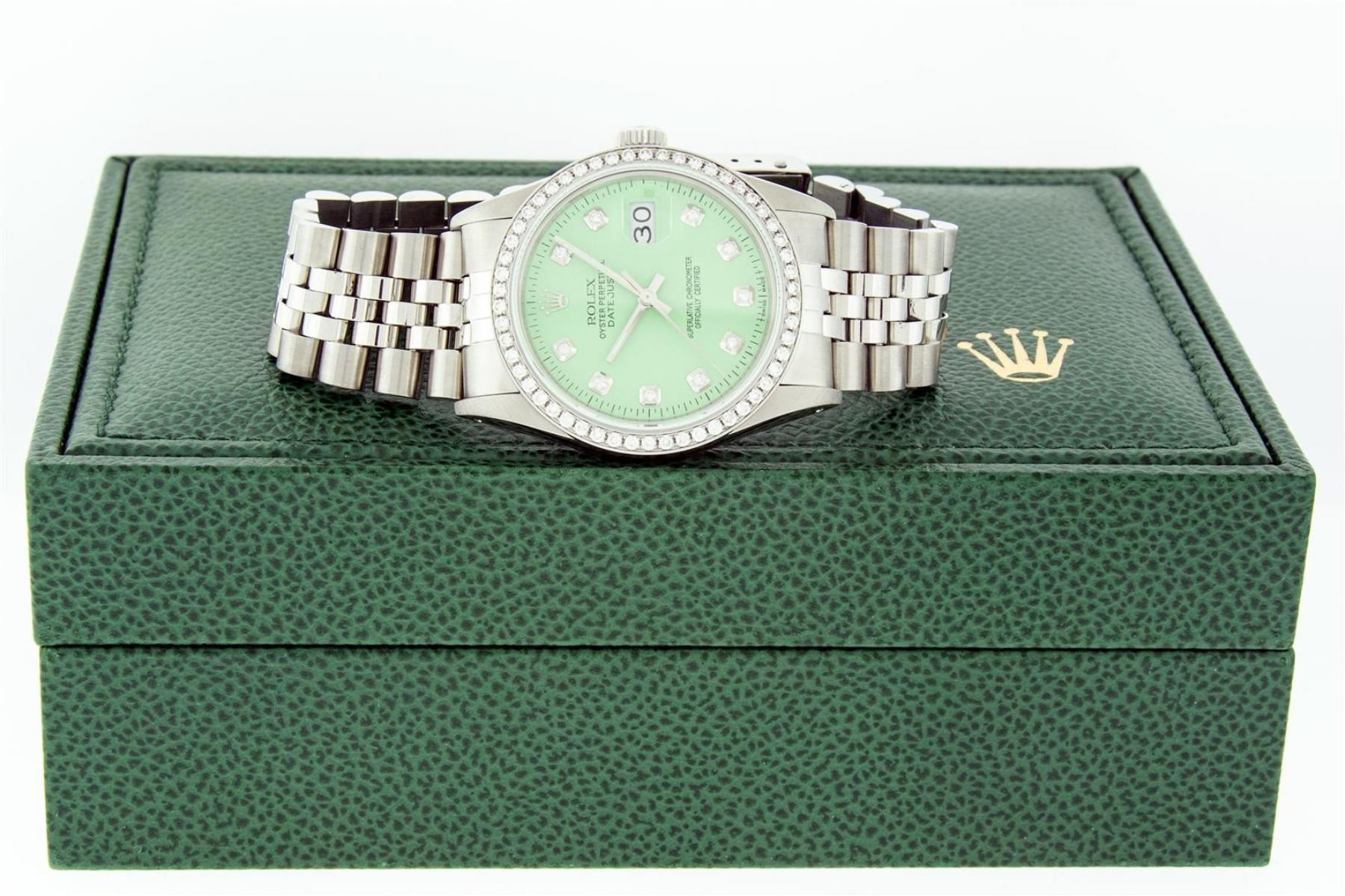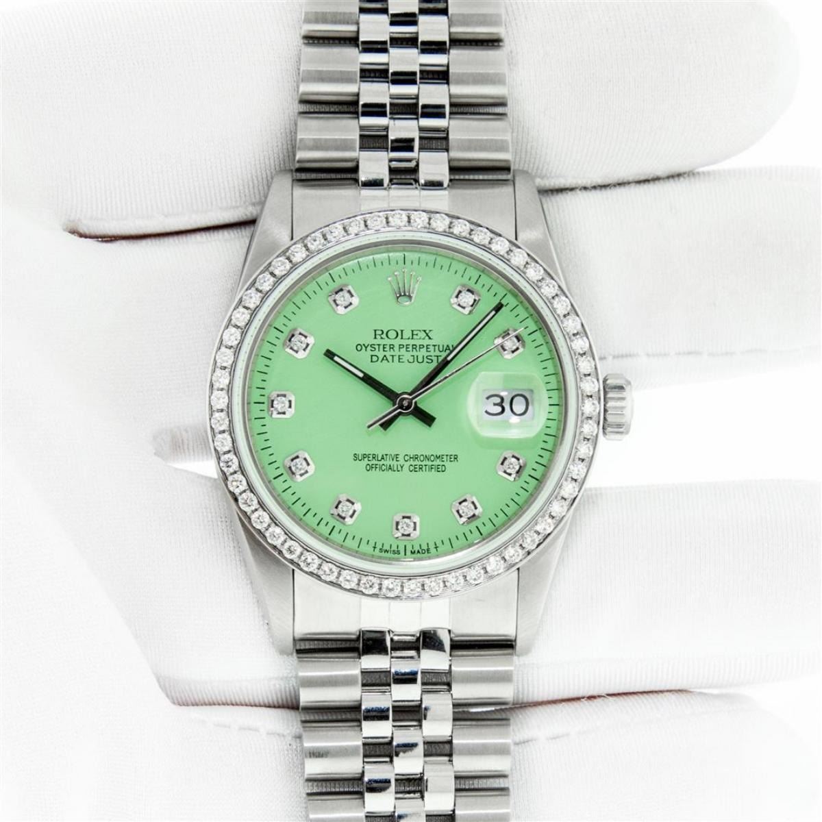 One Mens Rolex Stainless Steel Datejust Polished Bright with Satin Finish, This Watch Has Been Serviced & Electronically Tested, Stainless Steel Case: 36mm, Stainless Steel Crown, Custom Bezel: New Stainless Steel Beadset Diamond Bezel, Diamond Count: 54