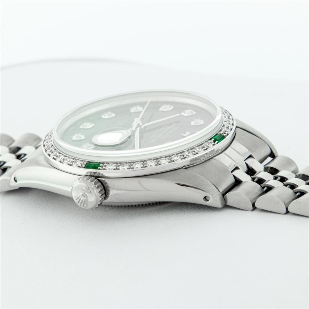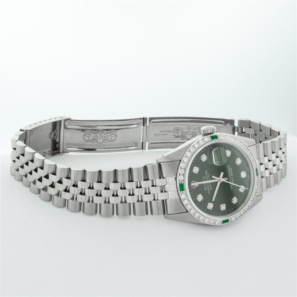 One Mens Stainless Steel Rolex Datejust Polished, Serviced & Electronically Tested, Stainless Steel Case: 36mm, Stainless Steel Crown, Custom Bezel: New 18K White Gold Emerald Beadset Diamond Bezel, Diamond + Gem Count: 36 Diamonds + 4 Emeralds, Total Weight 1.00 Carat, Clarity: SI-VS, Color: G to H. Custom Crystal: New Scratch Resistant Synthetic Sapphire Cyclops Lens. Custom Hands: New Luminescent Hands. Movement: Automatic Winding Movement Caliber 3035. Custom Dial: Green Diamond Dial With Dash Track, 10 Diamonds in Dial, G To H In Color, Clarity: SI-VS. Date Window: 3 O'Clock Position Date Display, Quickset, Model: Datejust. Condition: G-6 Extra Fine. Bracelet: Stainless Steel Jubilee. Bright Polish & Satin Finish. 7.0 Inch Length, Adjustable. Standard Clasp, With Rolex Logo. This Watch Has Been Serviced Time Tested And Is In Excellent Condition It Is Free Of All Scratches And Dents. This Watch Comes With A Rolex Box And Appraisal.