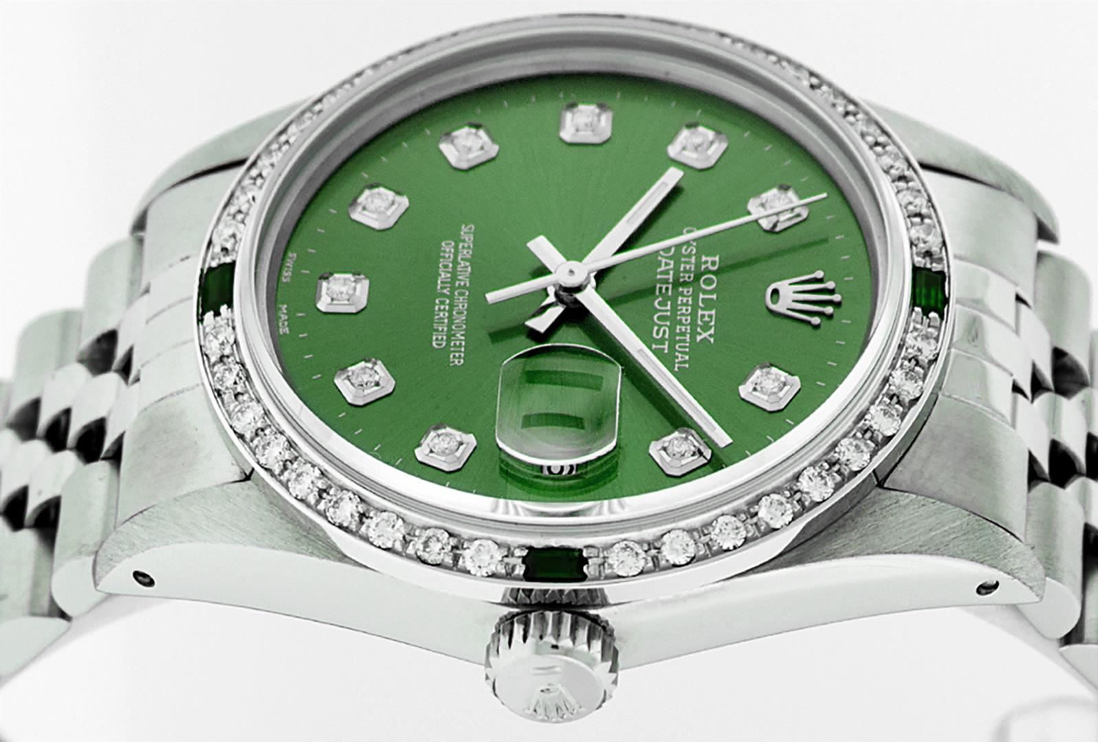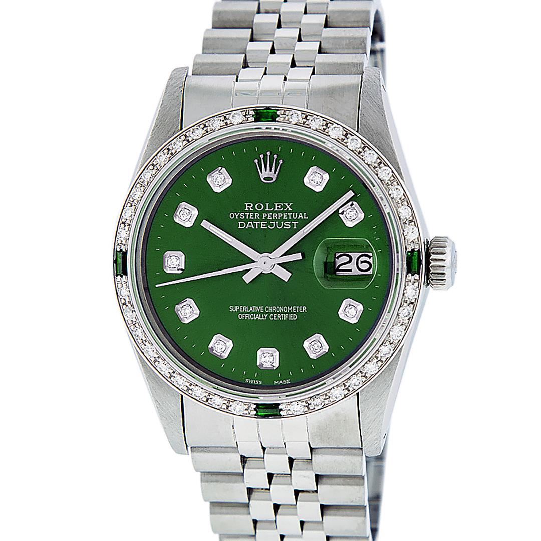 One Mens Stainless Steel Rolex Datejust Polished, Serviced & Electronically Tested, Stainless Steel Case: 36mm, Stainless Steel Crown, Custom Bezel: New 18K White Gold Emerald Beadset Diamond Bezel, Diamond + Gem Count: 36 Diamonds + 4 Emeralds, Total Weight 1.00 Carat, Clarity: SI-VS, Color: G to H. Custom Crystal: New Scratch Resistant Synthetic Sapphire Cyclops Lens. Custom Hands: New Luminescent Hands. Movement: Automatic Winding Movement Caliber 3035. Custom Dial: Green Diamond Dial With Dash Track, 10 Diamonds in Dial, G To H In Color, Clarity: SI-VS. Date Window: 3 O'Clock Position Date Display, Quickset, Model: Datejust. Condition: G-6 Extra Fine. Bracelet: Stainless Steel Jubilee. Bright Polish & Satin Finish. 7.0 Inch Length, Adjustable. Standard Clasp, With Rolex Logo. This Watch Has Been Serviced Time Tested And Is In Excellent Condition It Is Free Of All Scratches And Dents