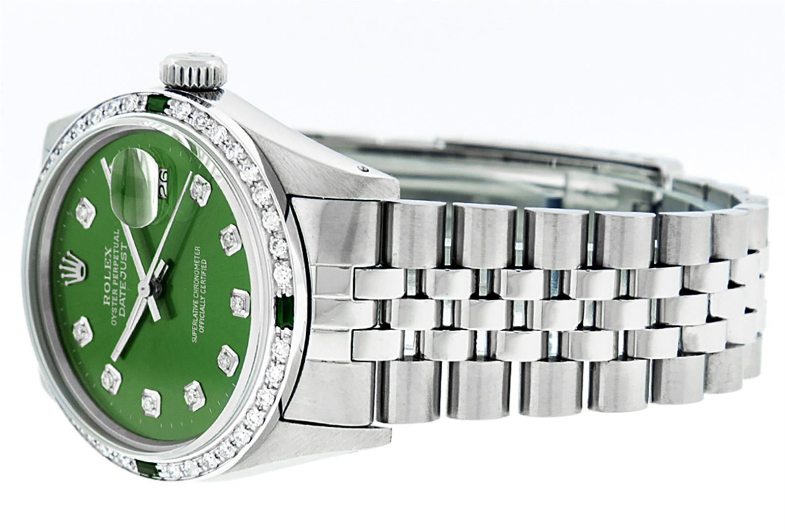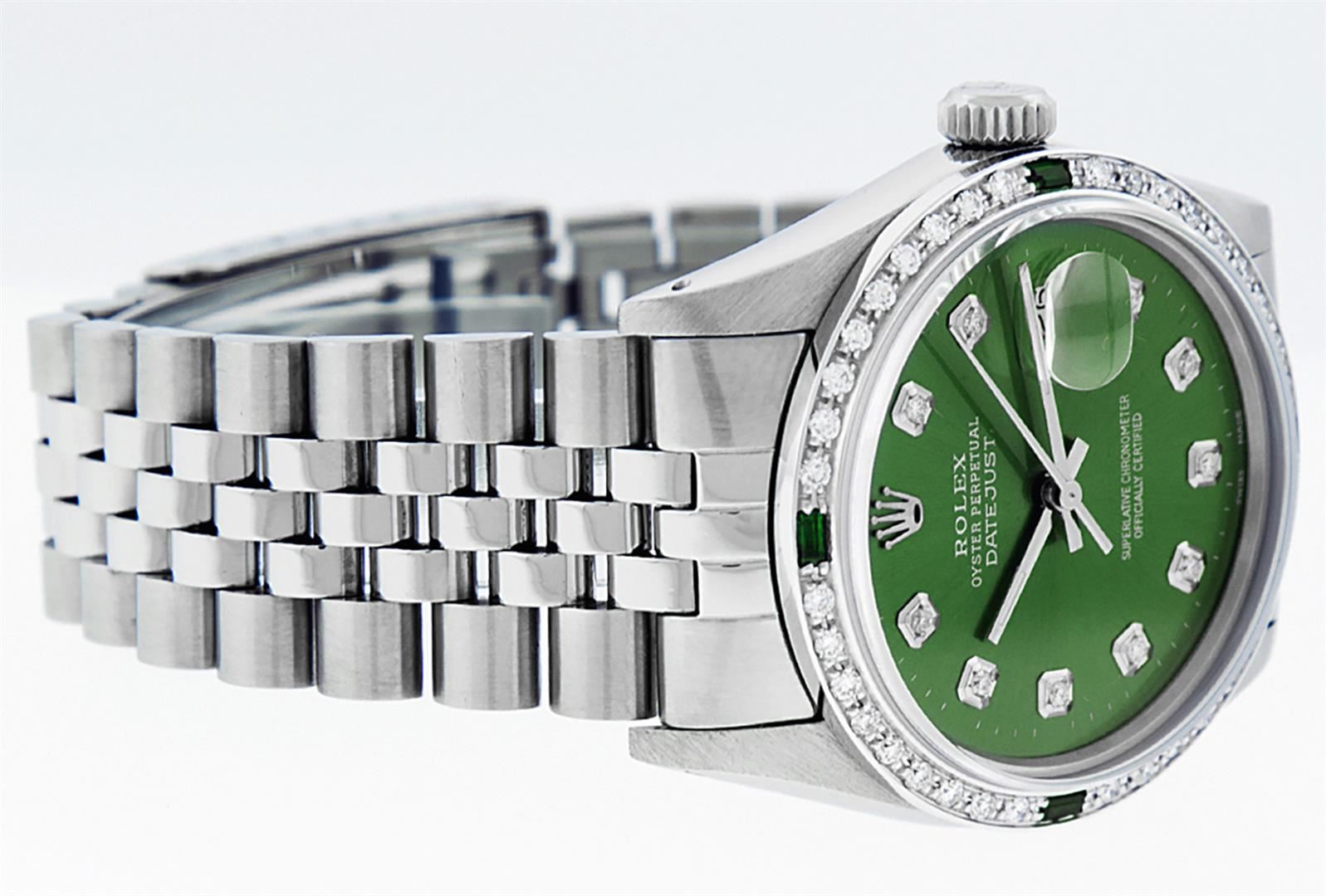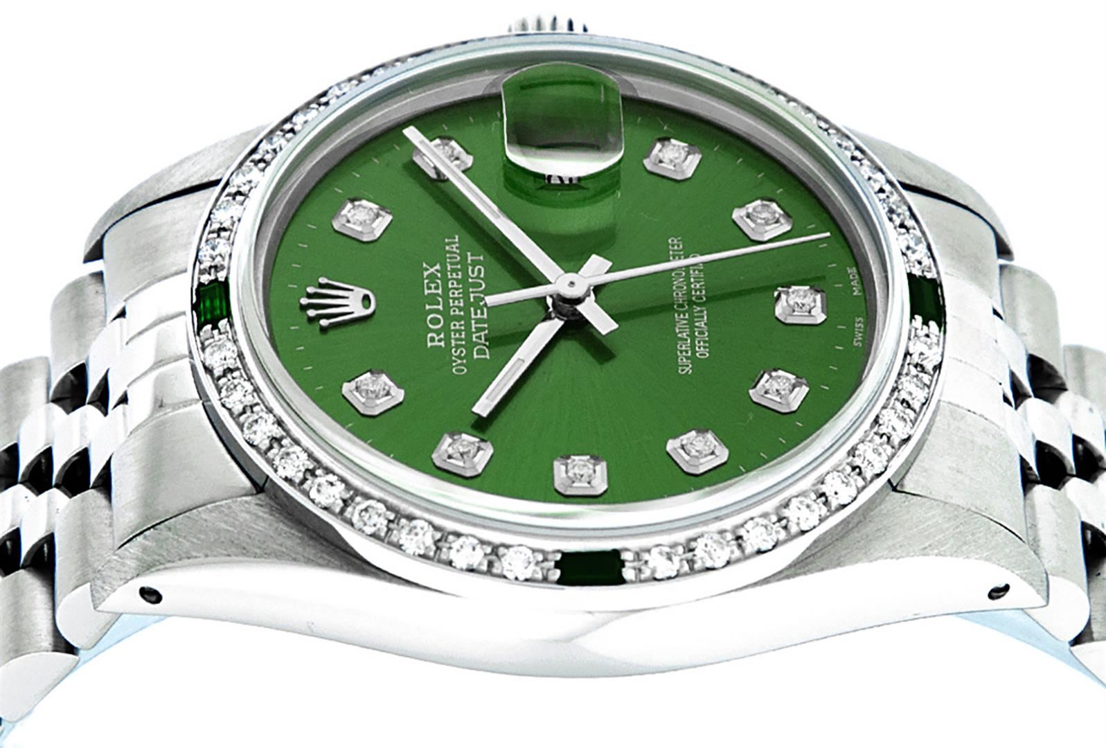 One Mens Stainless Steel Rolex Datejust Polished, Serviced & Electronically Tested, Stainless Steel Case: 36mm, Stainless Steel Crown, Custom Bezel: New 18K White Gold Emerald Beadset Diamond Bezel, Diamond + Gem Count: 36 Diamonds + 4 Emeralds, Total Weight 1.00 Carat, Clarity: SI-VS, Color: G to H. Custom Crystal: New Scratch Resistant Synthetic Sapphire Cyclops Lens. Custom Hands: New Luminescent Hands. Movement: Automatic Winding Movement Caliber 3035. Custom Dial: Green Diamond Dial With Dash Track, 10 Diamonds in Dial, G To H In Color, Clarity: SI-VS. Date Window: 3 O'Clock Position Date Display, Quickset, Model: Datejust. Condition: G-6 Extra Fine. Bracelet: Stainless Steel Jubilee. Bright Polish & Satin Finish. 7.0 Inch Length, Adjustable. Standard Clasp, With Rolex Logo. This Watch Has Been Serviced Time Tested And Is In Excellent Condition It Is Free Of All Scratches And Dents