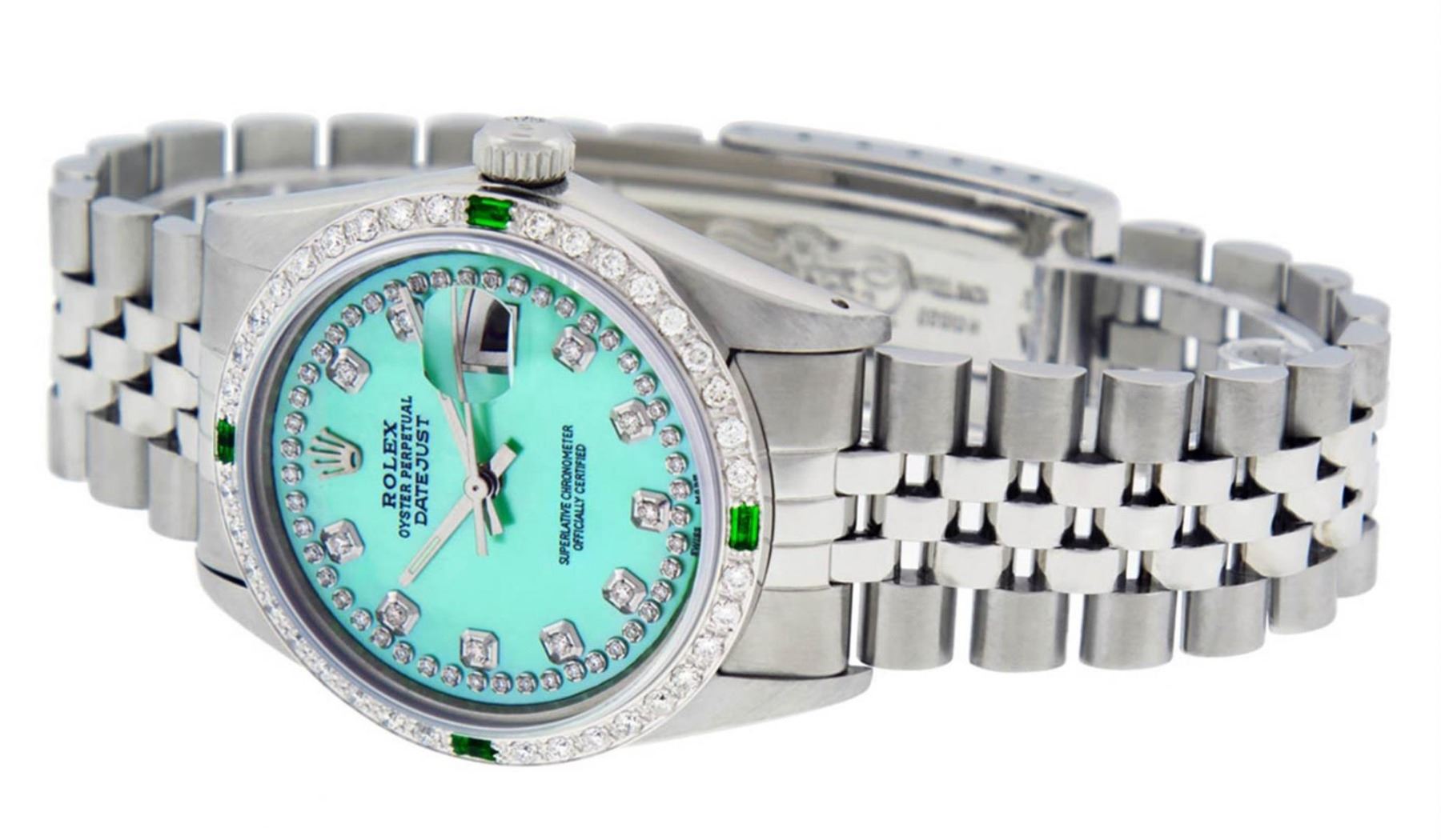 One Mens Stainless Steel Rolex Datejust Polished, Serviced & Electronically Tested, Stainless Steel Case: 36mm, Stainless Steel Crown, Custom Bezel: New 18K White Gold Synthetic Emerald Beadset Diamond Bezel, Stone Count: 36 Diamonds + 4 Synthetic Emeralds. Total Weight 1.0 Carat, Clarity: SI-VS, Color: G to H. Custom Crystal: New Synthetic Sapphire Cyclops Lens. Custom Hands: New Luminescent Hands. Movement: Automatic Winding Movement Caliber 3035. Custom Dial: Green Mother Of Pearl String Diamond Dial, Diamond Count: 58 Diamond In Dial G To H In Color, Clarity: VS2-SI1. Date Window: 3 O'Clock Position Date Display, Quickset, Model: Datejust. Condition: G-6 Extra Fine. Bracelet: Stainless Steel Jubilee Band. Bright Polish & Satin Finish. 7.0 Inch Length, Adjustable. Standard Clasp, With Rolex Logo. This Watch Has Been Serviced Time Tested And Is In Excellent Condition It Is Free Of All Scratches And Dents