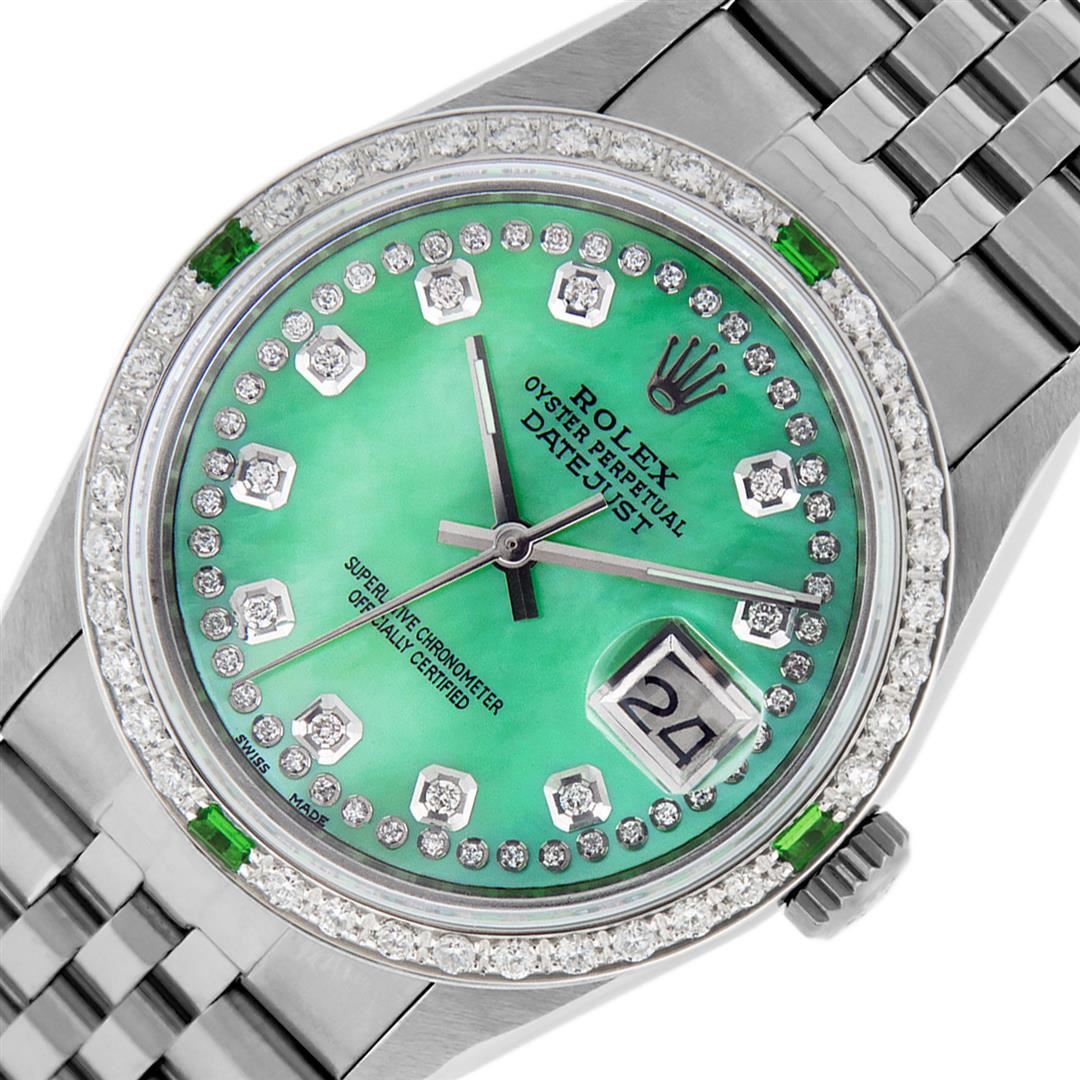 One Mens Stainless Steel Rolex Datejust Polished, Serviced & Electronically Tested, Stainless Steel Case: 36mm, Stainless Steel Crown, Custom Bezel: New 18K White Gold Synthetic Emerald Beadset Diamond Bezel, Stone Count: 36 Diamonds + 4 Synthetic Emeralds. Total Weight 1.0 Carat, Clarity: SI-VS, Color: G to H. Custom Crystal: New Synthetic Sapphire Cyclops Lens. Custom Hands: New Luminescent Hands. Movement: Automatic Winding Movement. Custom Dial: Green Mother Of Pearl String Diamond Dial, Diamond Count: 58 Diamond In Dial G To H In Color, Clarity: VS2-SI1. Date Window: 3 O'Clock Position Date Display, Quickset, Model: Datejust. Condition: G-6 Extra Fine. Bracelet: Stainless Steel Jubilee Band. Bright Polish & Satin Finish. 7.0 Inch Length, Adjustable. Standard Clasp, With Rolex Logo. This Watch Has Been Serviced Time Tested And Is In Excellent Condition It Is Free Of All Scratches And Dents