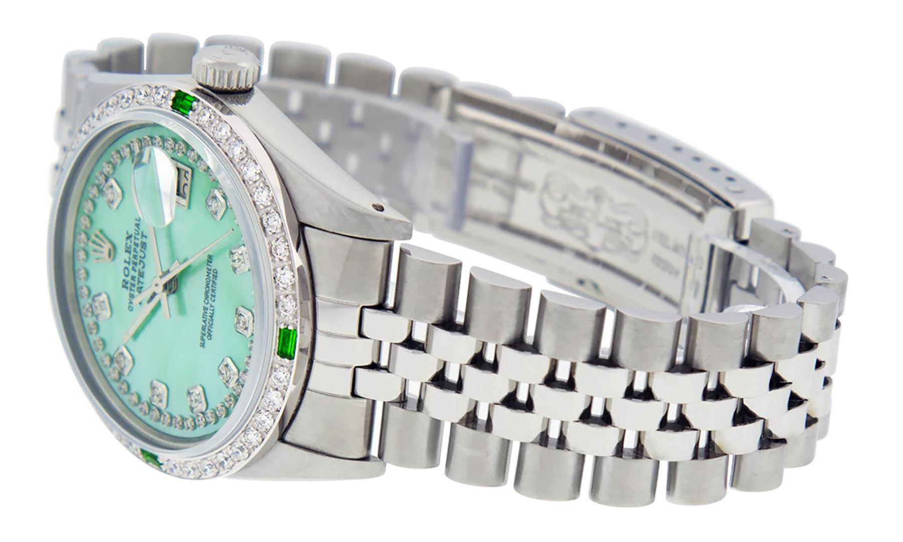 One Mens Stainless Steel Rolex Datejust Polished, Serviced & Electronically Tested, Stainless Steel Case: 36mm, Stainless Steel Crown, Custom Bezel: New 18K White Gold Emerald Beadset Diamond Bezel, Stone Count: 36 Diamonds + 4 Synthetic Emeralds. Total Weight 1.0 Carat, Clarity: SI-VS, Color: G to H. Custom Crystal: New Scratch Resistant Synthetic Sapphire Cyclops Lens. Custom Hands: New Luminescent Hands. Movement: Automatic Winding Movement. Custom Dial: Green Mother Of Pearl String Diamond Dial, Diamond Count: 58 Diamond In Dial G To H In Color, Clarity: VS2-SI1. Date Window: 3 O'Clock Position Date Display, Quickset, Model: Datejust. Condition: G-6 Extra Fine. Bracelet: Stainless Steel Jubilee Band. Bright Polish & Satin Finish. 7.0 Inch Length, Adjustable. Standard Clasp, With Rolex Logo. This Watch Has Been Serviced Time Tested And Is In Excellent Condition It Is Free Of All Scratches And Dents.