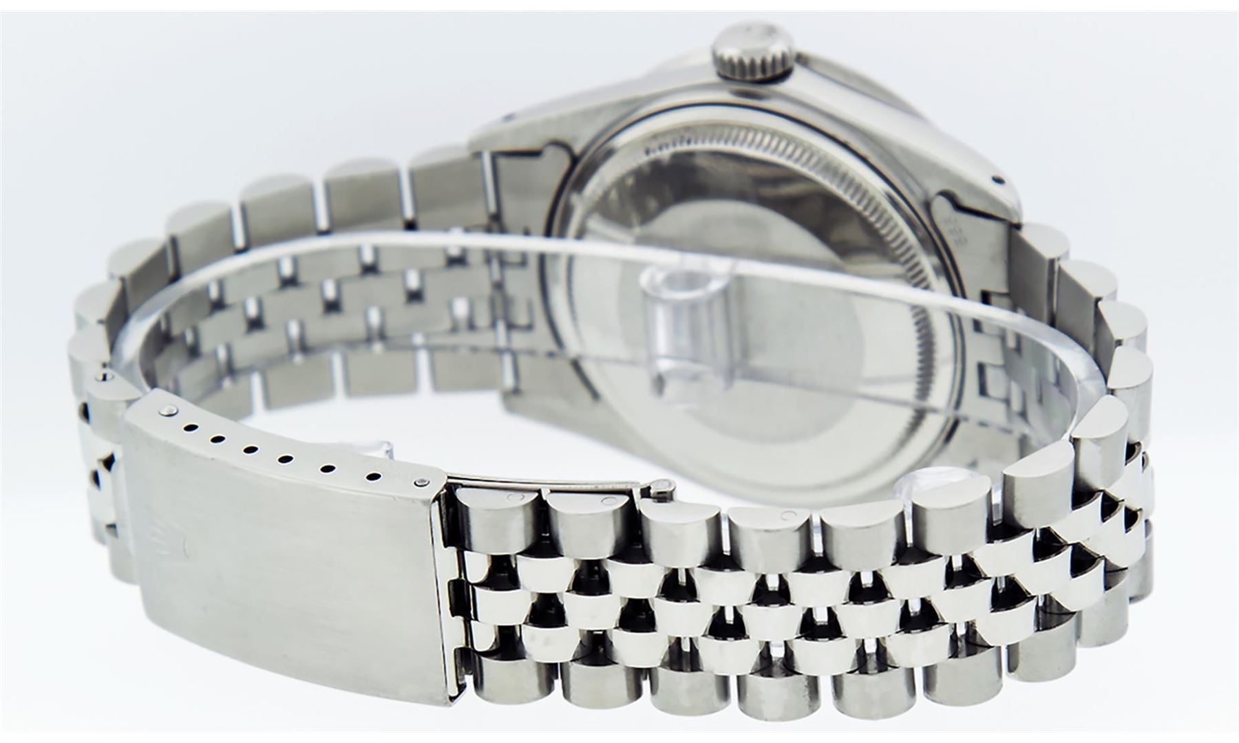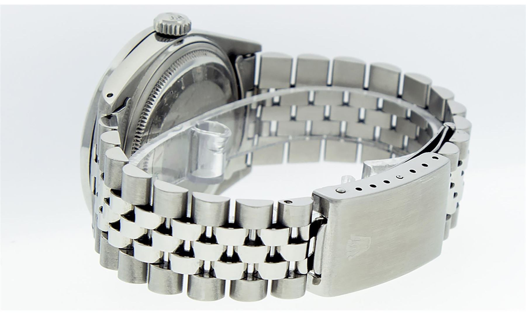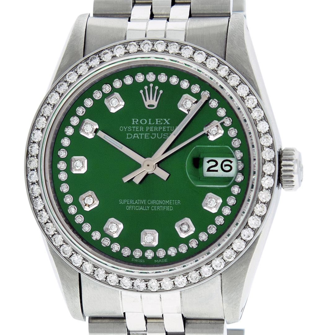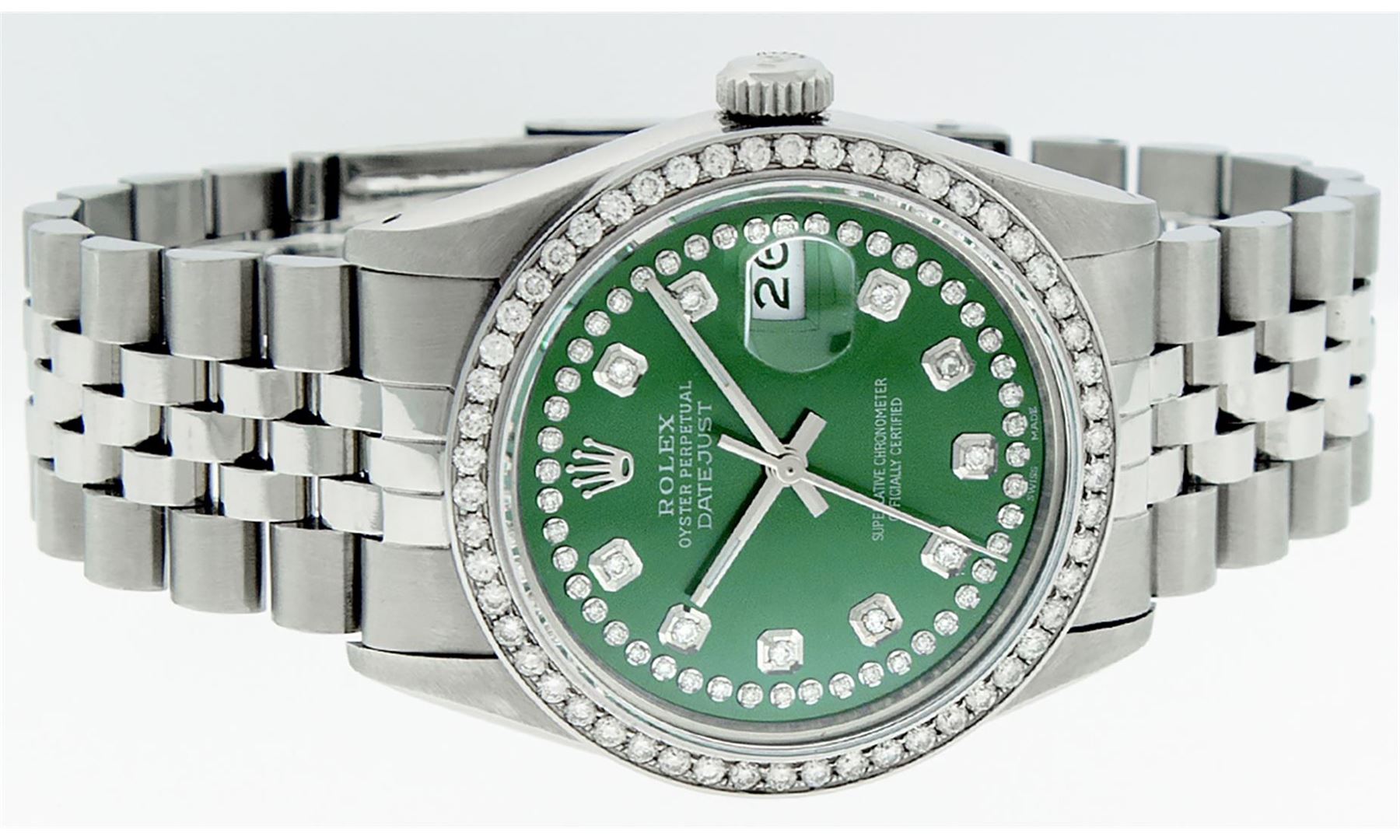 One Mens Rolex Stainless Steel Datejust Polished Bright with Satin Finish, This Watch Has Been Serviced & Electronically Tested, Stainless Steel Case: 36mm, Stainless Steel Crown, Custom Bezel: New Stainless Steel Bead-set Diamond Bezel, Diamond Count: 54 Diamonds, Total Weight 1.00 Carat, Clarity: SI-VS, Color: G to H. Custom Crystal: New Synthetic Sapphire Cyclops Lens. Custom Hands: New Luminescent Hands. Movement: Automatic Winding Movement.. Custom Dial: Green String Diamond Dial, Diamond Count: 58 Diamonds In Dial, Color: G to H, Clarity: VS2-SI1. Date Window: 3 O'clock Position Date Display, Quick-Set, Model: Datejust. Condition: G-6 Extra Fine. Bracelet: Stainless Steel Jubilee Band. Bright Polish & Satin Finish. 7.0 Inch Length, Adjustable. Standard Clasp, With Rolex Logo. This Watch Has Been Serviced Time Tested And Is In Excellent Condition It Is Free Of All Scratches And Dents.