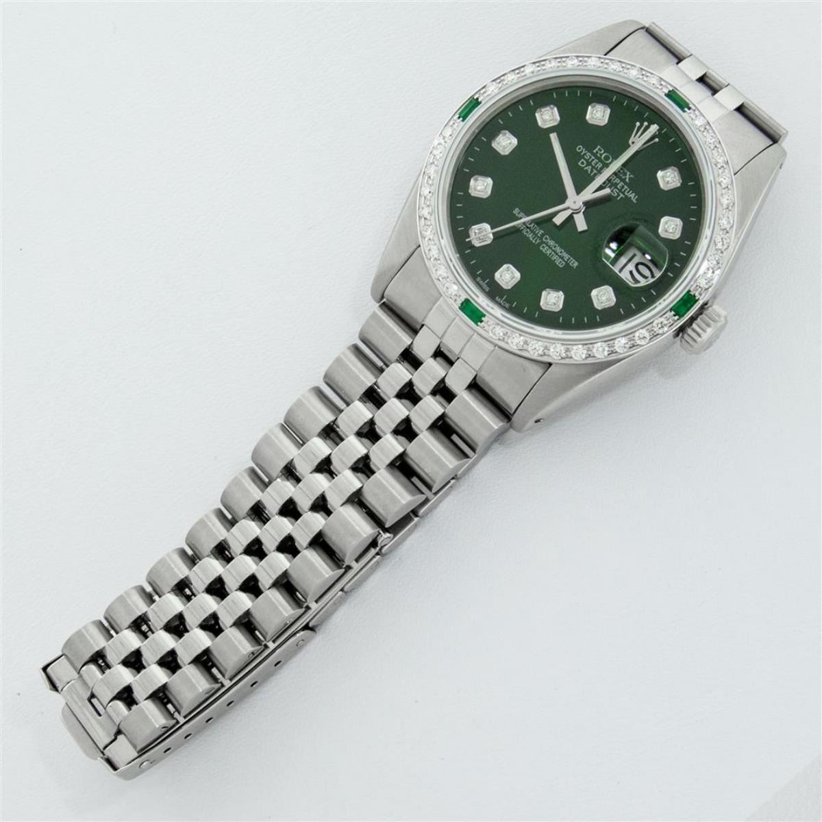 One Mens Stainless Steel Rolex Datejust Polished, Serviced & Electronically Tested, Stainless Steel Case: 36mm, Stainless Steel Crown, Custom Bezel: New 18K White Gold Synthetic Emerald Beadset Diamond Bezel, Diamond + Gem Count: 36 Diamonds + 4 Synthetic Emeralds, Total Weight 1.00 Carat, Clarity: SI-VS, Color: G to H. Custom Crystal: New Scratch Resistant Synthetic Sapphire Cyclops Lens. Custom Hands: New Luminescent Hands. Movement: Automatic Winding Movement. Custom Dial: Green Vignette With Diamond Hour Markers, 10 Diamond Dial, G To H In Color, Clarity: SI-VS. Date Window: 3 O'Clock Position Date Display, Quickset, Model: Datejust. Condition: G-6 Extra Fine. Bracelet: Stainless Steel Jubilee Band. Bright Polish & Satin Finish. 7.0 Inch Length, Adjustable. Standard Clasp, With Rolex Logo. This Watch Has Been Serviced Time Tested And Is In Excellent Condition It Is Free Of All Scratches And Dents.