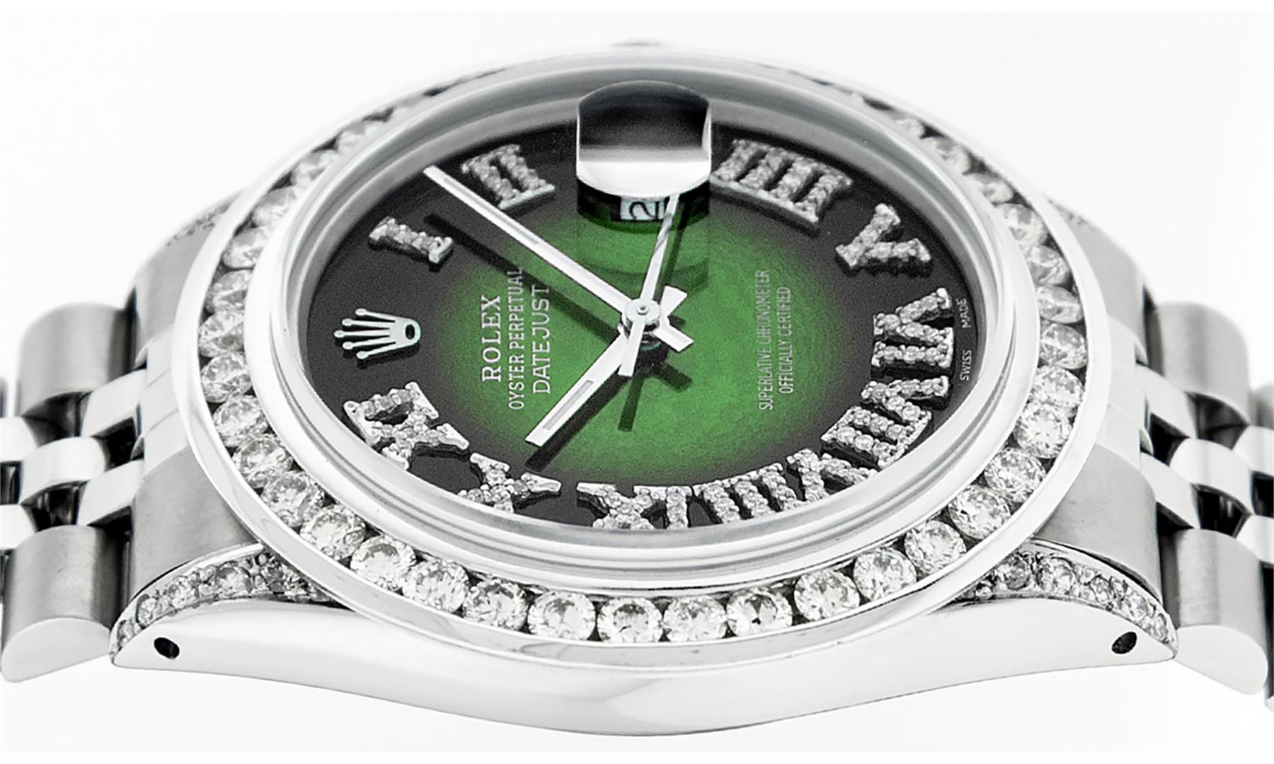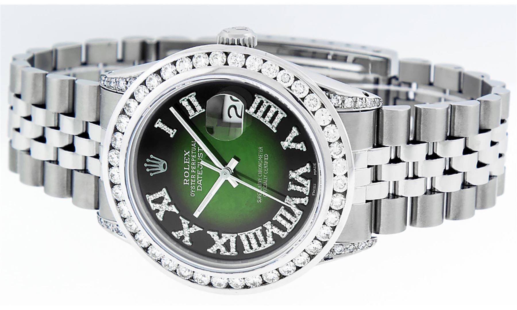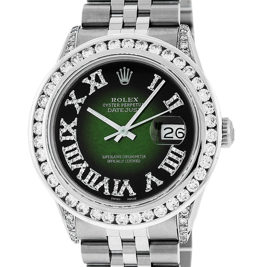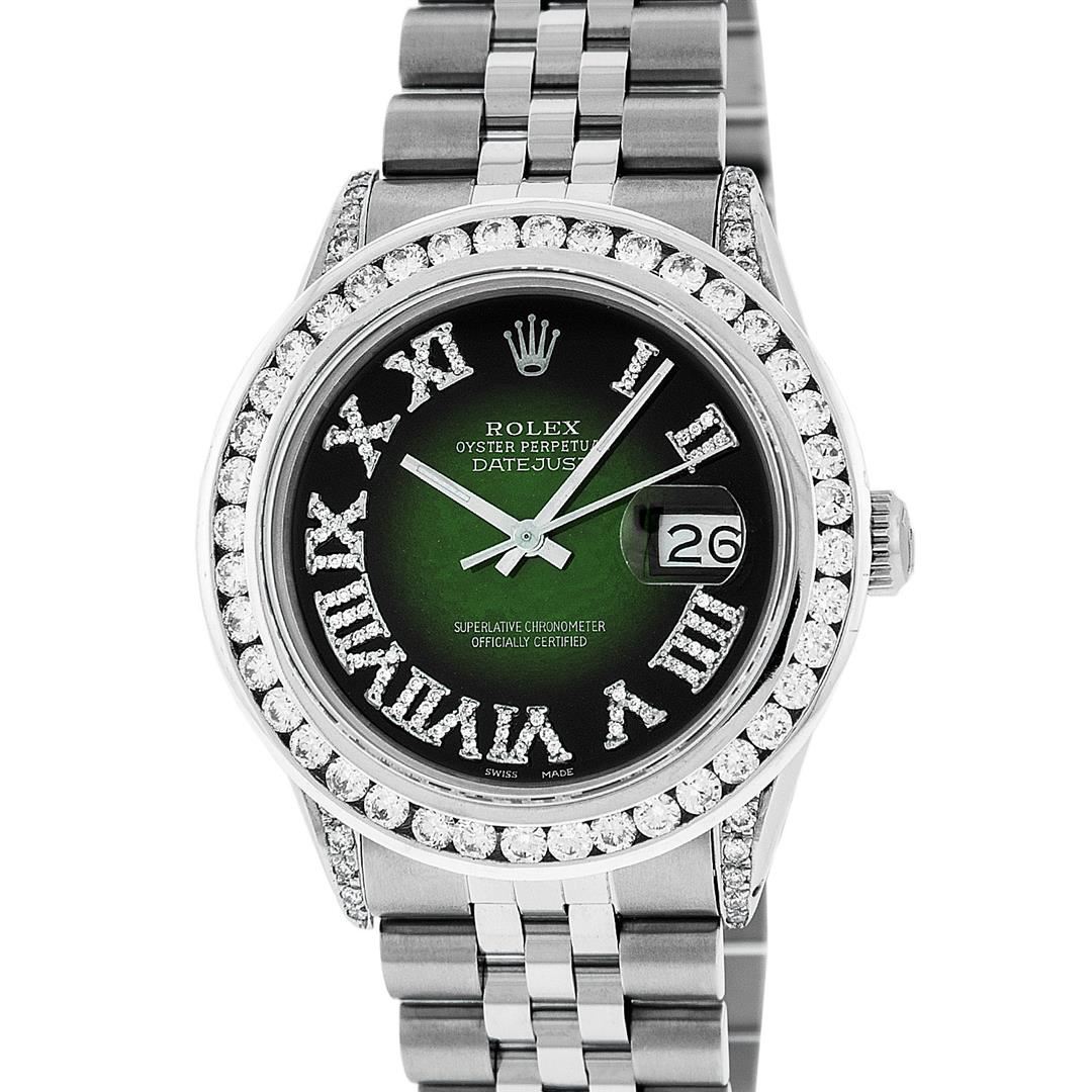 One Mens Stainless Steel Rolex Datejust Polished Bright with Satin Finish, Serviced & Electronically Tested, Stainless Steel Case: 36mm, Diamond Lugs: 24 Diamonds On Lugs, Color: G to H, Clarity: SI-VS. Stainless Steel Crown, New Custom Bezel: 18K White Gold 3.00 Ctw Diamond Bezel, Diamond Count: 40 Diamonds, Total Weight 3.0 Carat, Clarity: SI-VS, Color: G to H. Custom Crystal: New Scratch Resistant Synthetic Sapphire Cyclops Lens. Movement: Automatic Winding Movement Caliber 3035. Custom Dial: Green Vignette Roman Diamond Dial, Diamond Color: G To H In Color, Clarity: SI-VS. Date Window: 3 O'Clock Position Date Display, Quickset, Model: Quickset Datejust, Condition: G-6 Extra Fine. Bracelet: Stainless Steel Jubilee Band. Bright Polish & Satin Finish. 7.0 Inch Length, Adjustable. Standard Clasp, With Rolex Logo. This Watch Has Been Serviced Time Tested And Is In Excellent Condition It Is Free Of All Scratches And Dents. This Watch Also Comes With A Brand New Wooden Watch Winder.