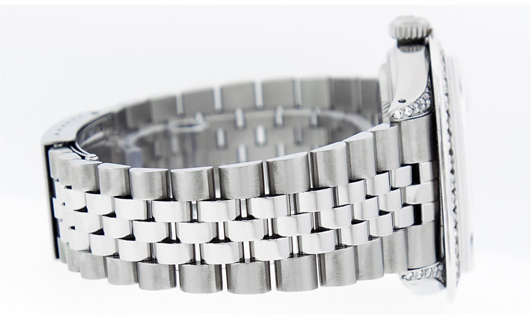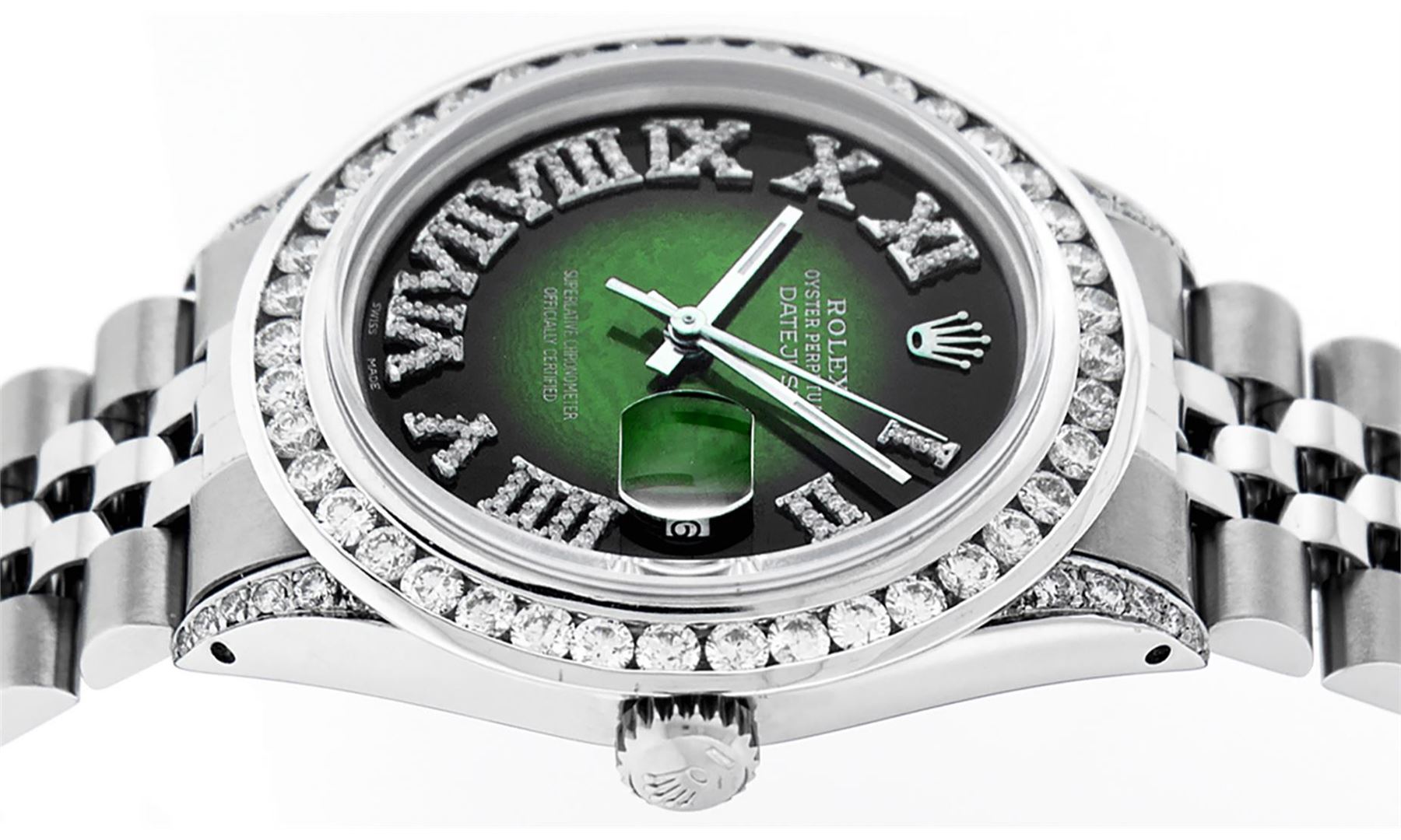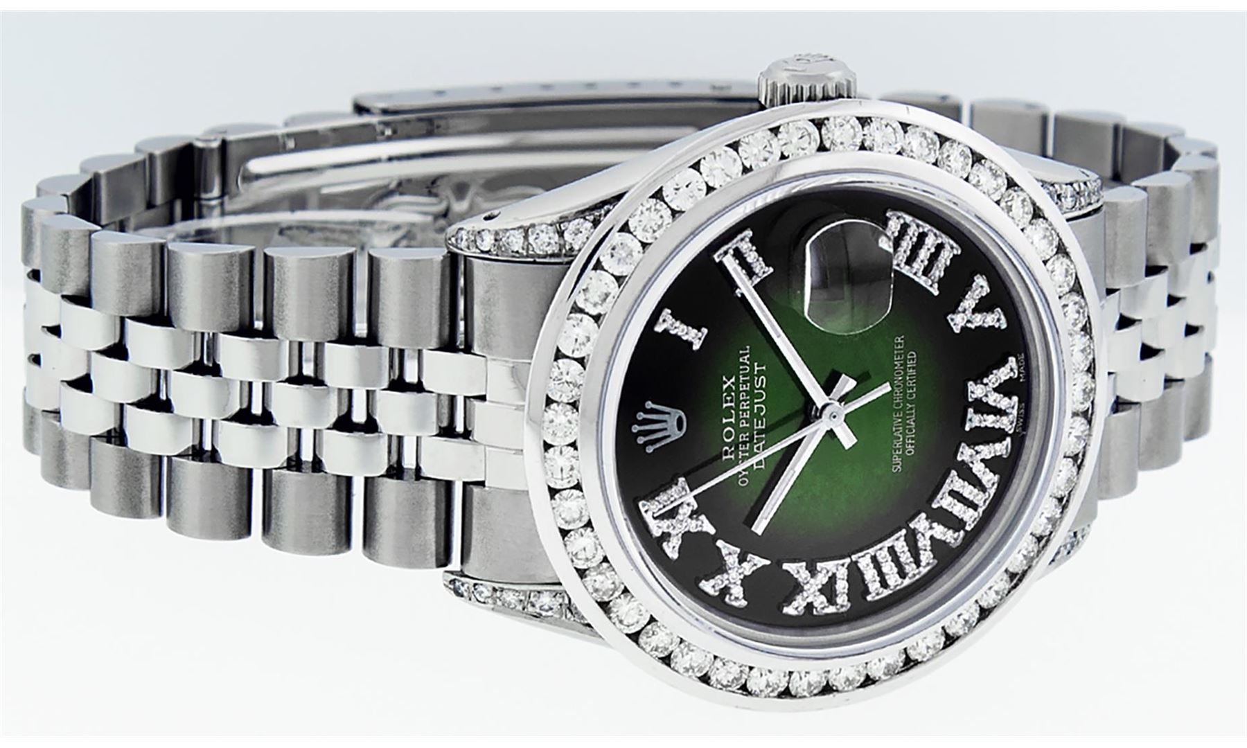One Mens Stainless Steel Rolex Datejust Polished Bright with Satin Finish, Serviced & Electronically Tested, Stainless Steel Case: 36mm, Diamond Lugs: 24 Diamonds On Lugs, Color: G to H, Clarity: SI-VS. Stainless Steel Crown, New Custom Bezel: 18K White Gold 3.00 Ctw Diamond Bezel, Diamond Count: 40 Diamonds, Total Weight 3.0 Carat, Clarity: SI-VS, Color: G to H. Custom Crystal: New Scratch Resistant Synthetic Sapphire Cyclops Lens. Movement: Automatic Winding Movement Caliber 3035. Custom Dial: Green Vignette Roman Diamond Dial, Diamond Color: G To H In Color, Clarity: SI-VS. Date Window: 3 O'Clock Position Date Display, Quickset, Model: Quickset Datejust, Condition: G-6 Extra Fine. Bracelet: Stainless Steel Jubilee Band. Bright Polish & Satin Finish. 7.0 Inch Length, Adjustable. Standard Clasp, With Rolex Logo. This Watch Has Been Serviced Time Tested And Is In Excellent Condition It Is Free Of All Scratches And Dents. This Watch Also Comes With A Brand New Wooden Watch Winder.