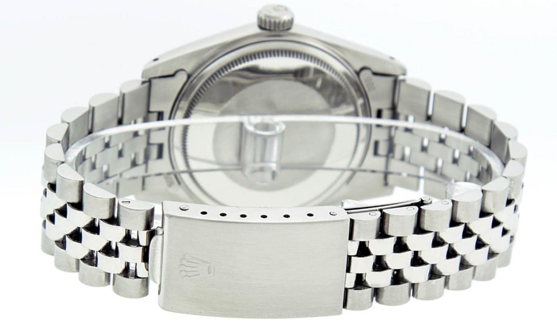 One Mens Stainless Steel Rolex Datejust Polished Bright with Satin Finish, This Watch Has Been Serviced & Electronically Tested, Stainless Steel Case: 36mm, Stainless Steel Crown, Original Bezel: 14K White Gold Fluted Bezel. Custom Crystal: New Acrylic Cyclops Lens. Custom Hands: New Luminescent Hands. Movement: Automatic Winding Movement Caliber 3035. Custom Dial: Ice Blue Dial With Diamond Hour Markers and Track Square Setting, 10 Diamonds in Dial G To H In Color, SI-VS Clarity. Date Window: 3 O'Clock Position Date Display, Quickset, Model: Datejust, Condition: G-6 Extra Fine. Bracelet:Stainless Steel Jubilee. Bright Polish & Satin Finish. 7.0 Inch Length, Adjustable. Standard Clasp, With Rolex Logo. This Watch Has Been Serviced Time Tested And Is In Excellent Condition It Is Free Of All Scratches And Dents