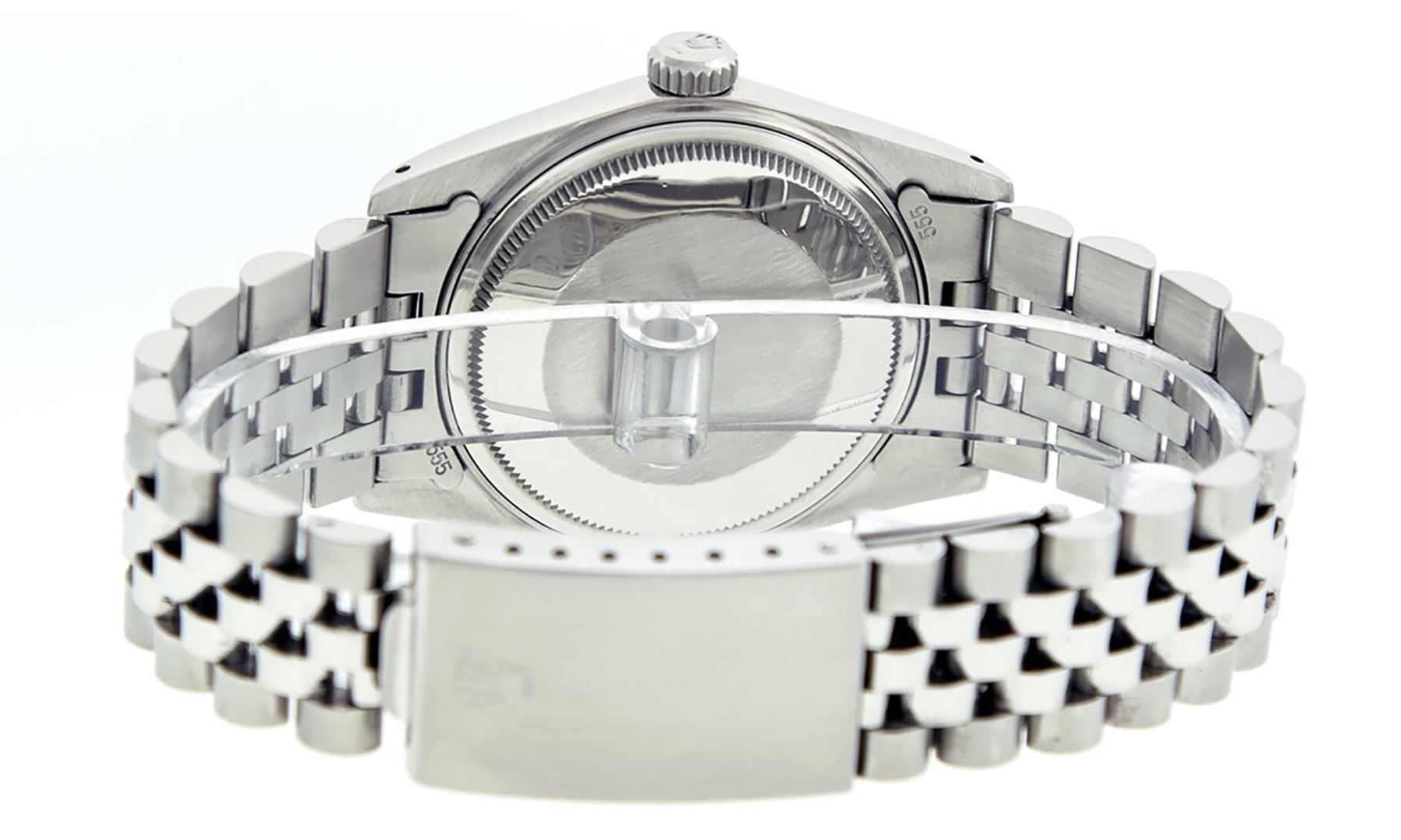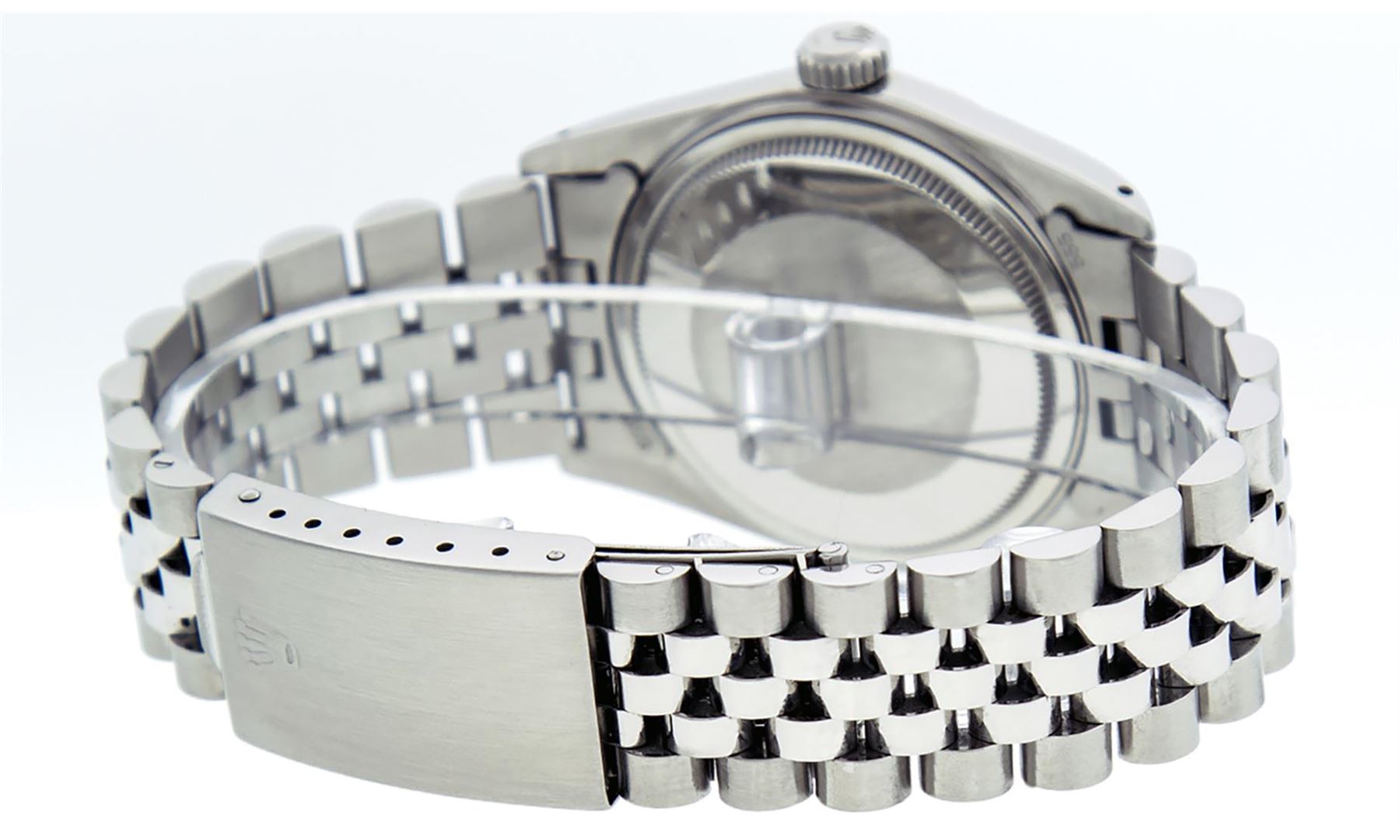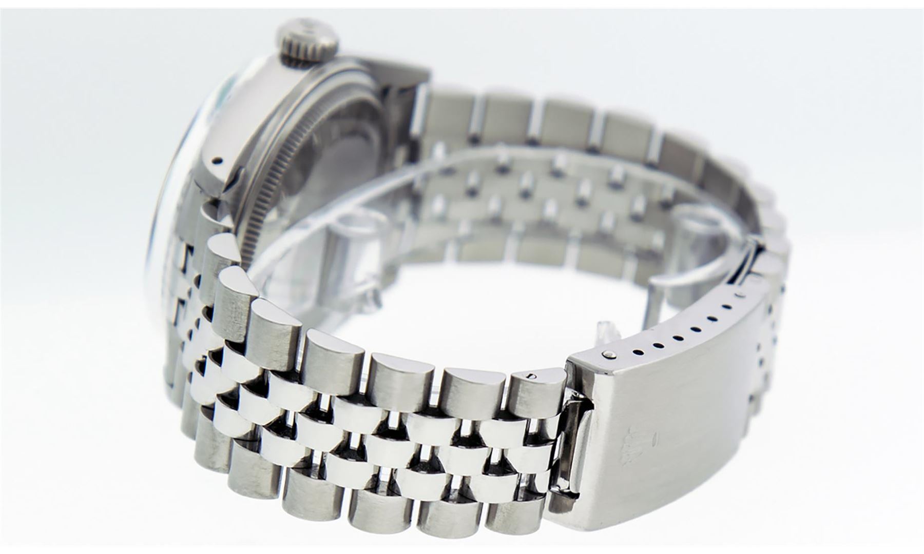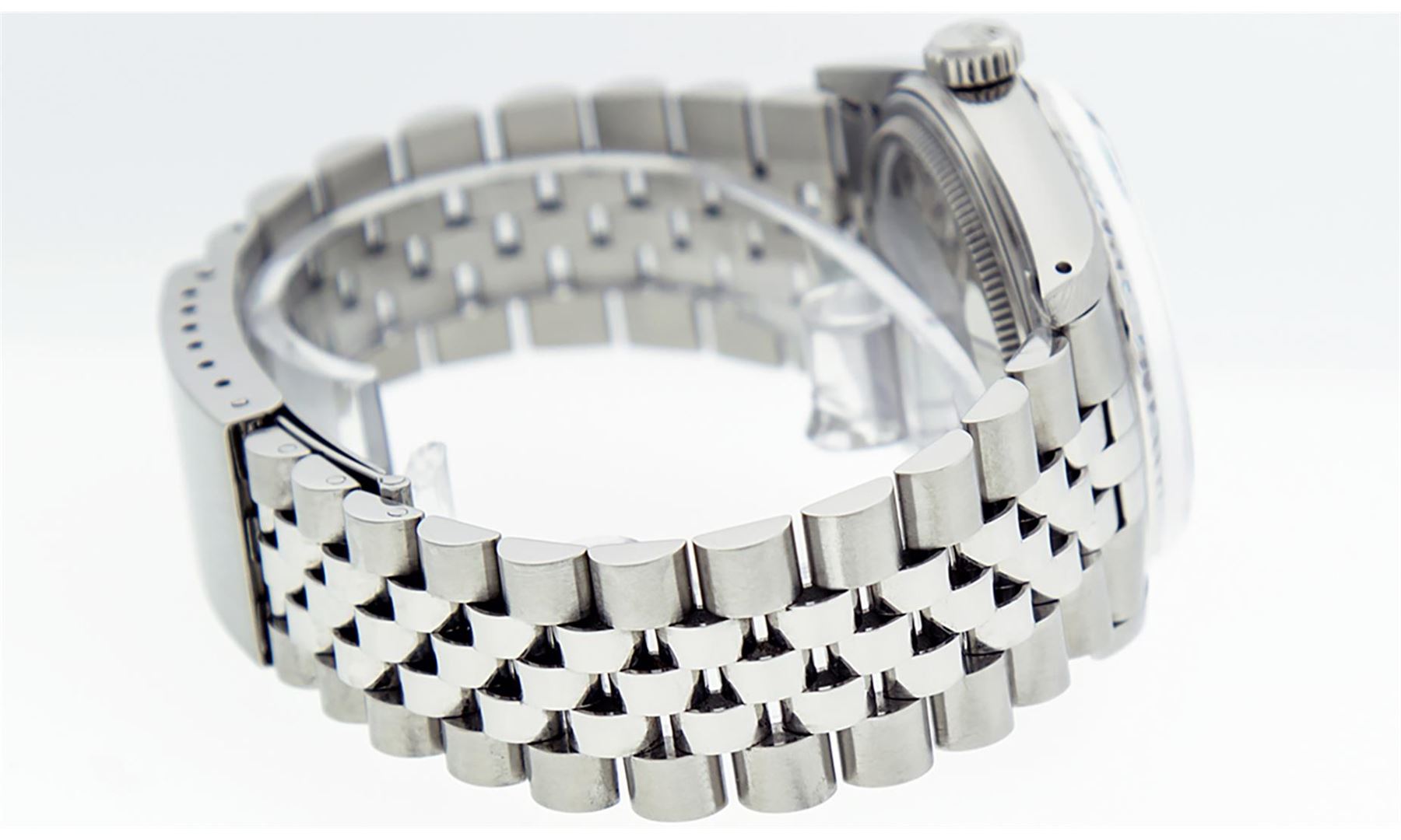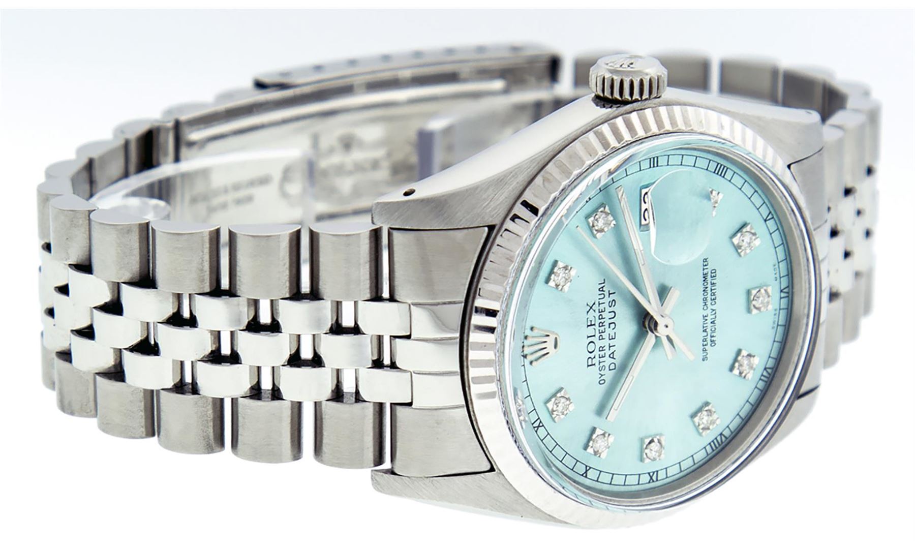 One Mens Stainless Steel Rolex Datejust Polished Bright with Satin Finish, This Watch Has Been Serviced & Electronically Tested, Stainless Steel Case: 36mm, Stainless Steel Crown, Bezel: White Gold Fluted Bezel. Custom Crystal: New Acrylic Cyclops Lens. Custom Hands: New Luminescent Hands. Movement: Automatic Winding Movement. Custom Dial: Ice Blue Dial With Diamond Hour Markers and Roman Track, 10 Diamonds On Dial G To H In Color, SI-VS Clarity. Date Window: 3 O'Clock Position Date Display, Quickset, Model: Datejust, Condition: G-6 Extra Fine. Bracelet:Stainless Steel Jubilee. Bright Polish & Satin Finish. 7.0 Inch Length, Adjustable. Standard Clasp, With Rolex Logo. This Watch Has Been Serviced Time Tested And Is In Excellent Condition It Is Free Of All Scratches And Dents.